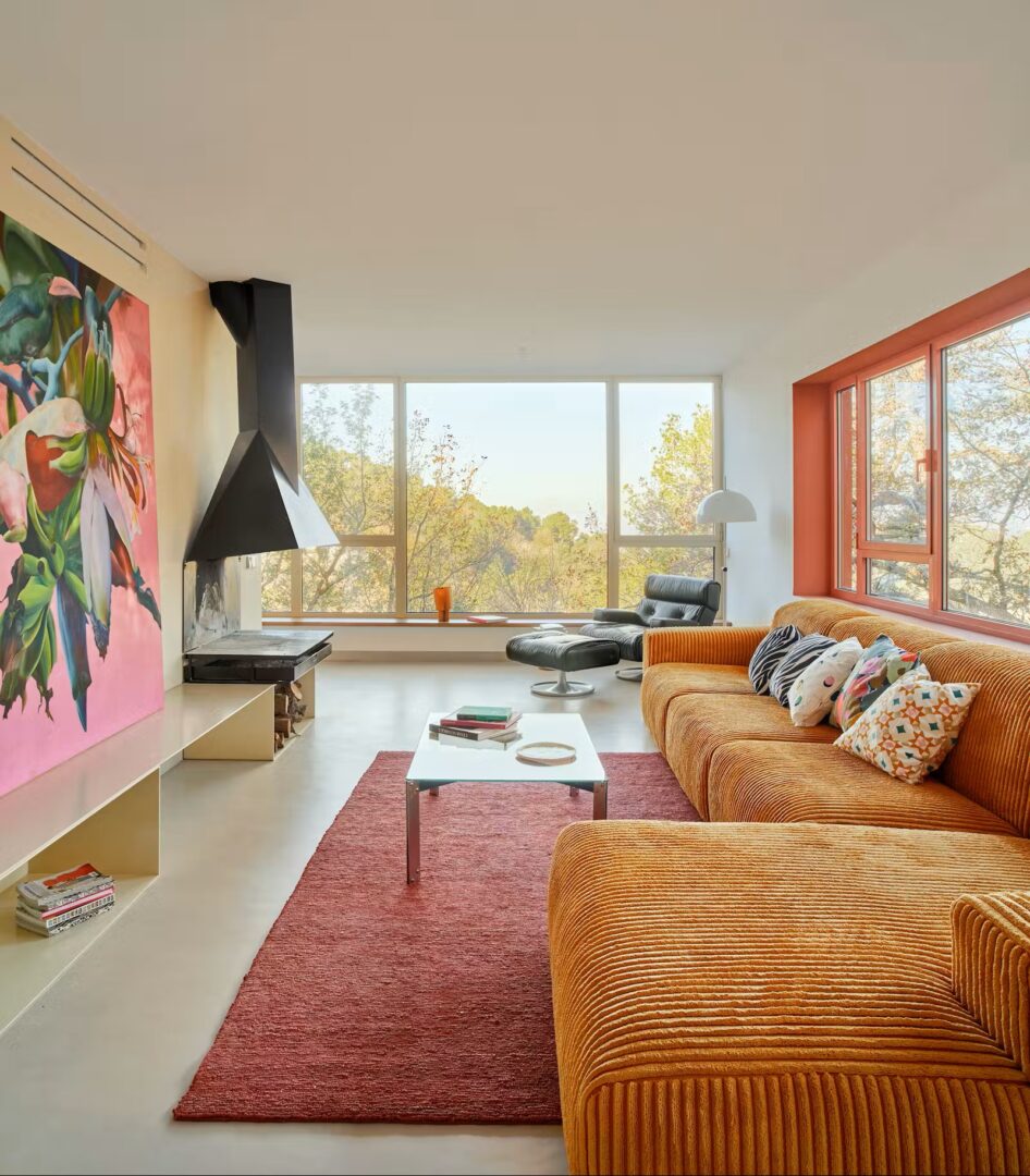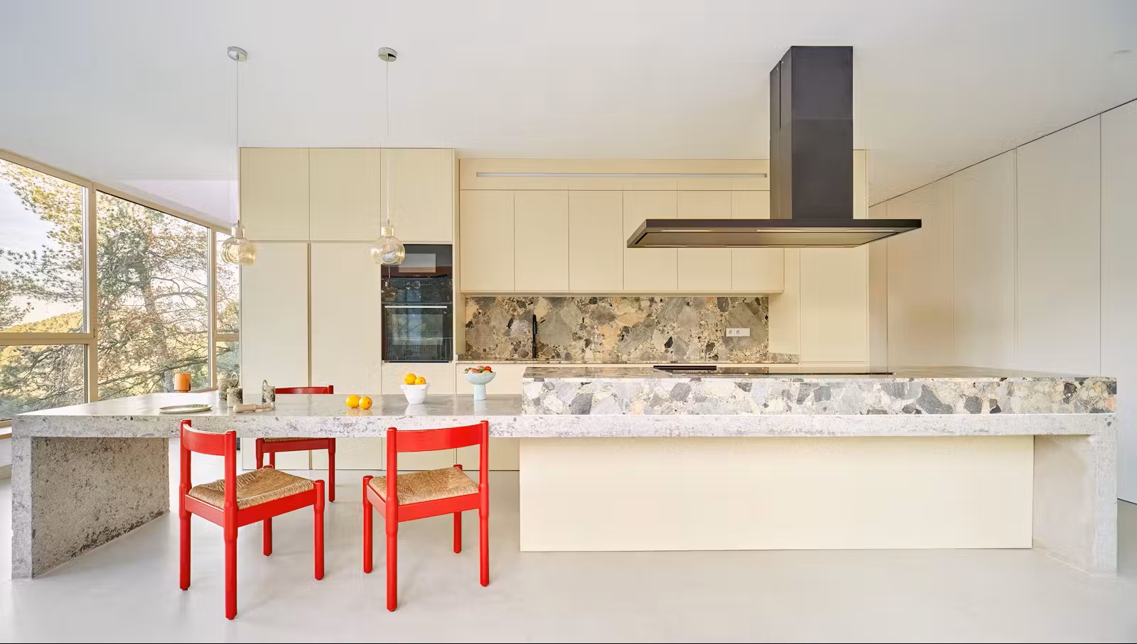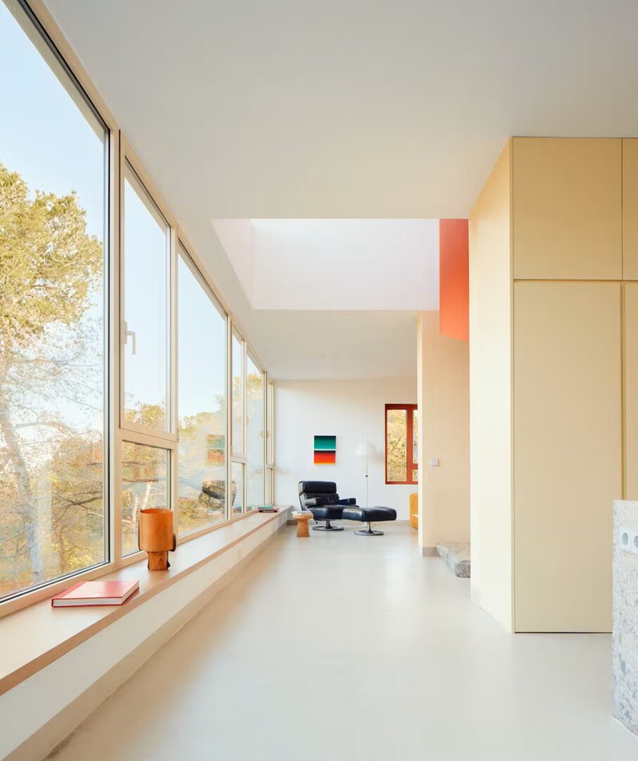 בקומה הראשית יש גוש מרכזי המכיל את גרם המדרגות, חדר האמבטיה והמזווה, מה שמפנה את כל ההיקף למטבח, לסלון ולמרחב תצפית. האחרון פונה לעמק וכולל ספסל מובנה לאורך כל החזית המזוגגת. חללים מחוברים אלה נועדו הן למגורים והן להתבוננות בנוף.