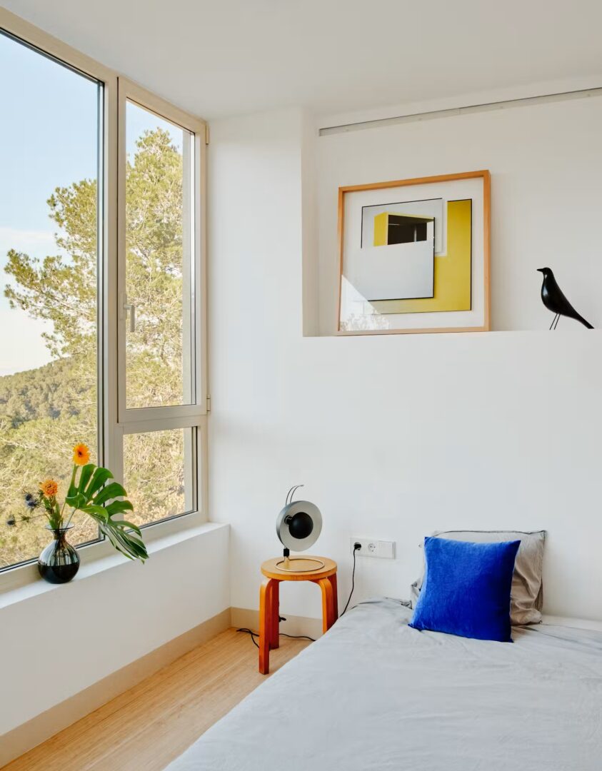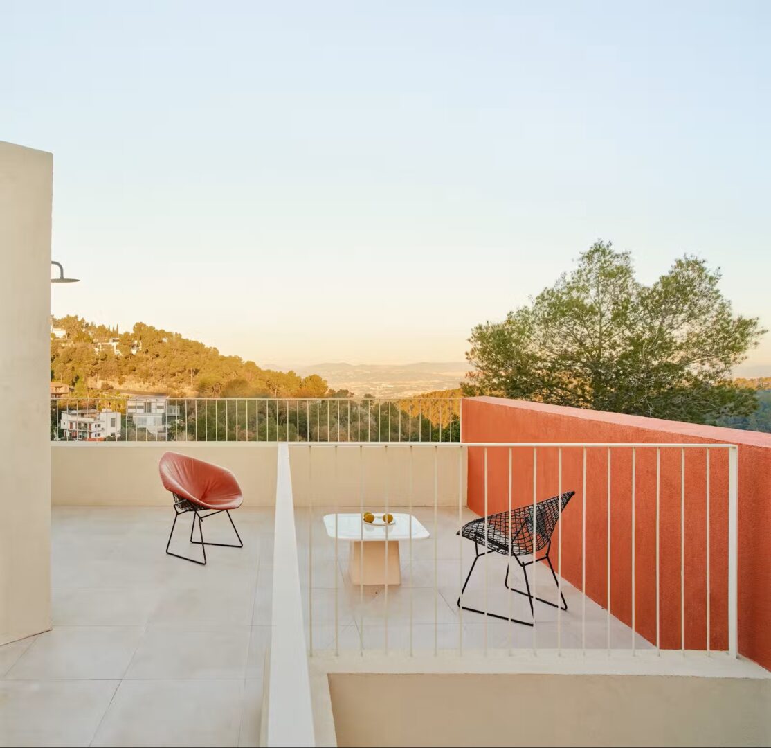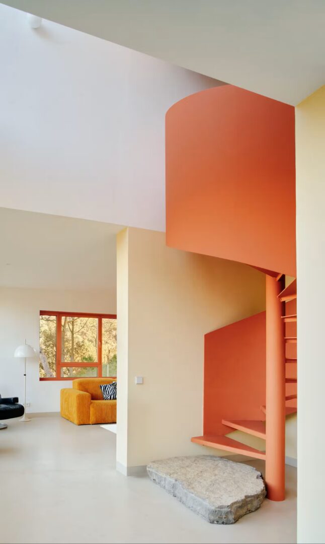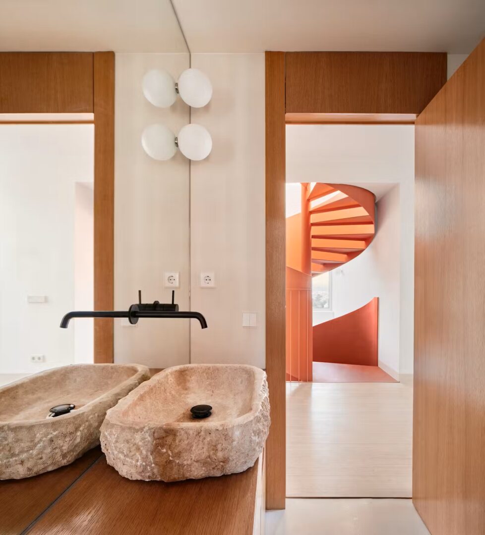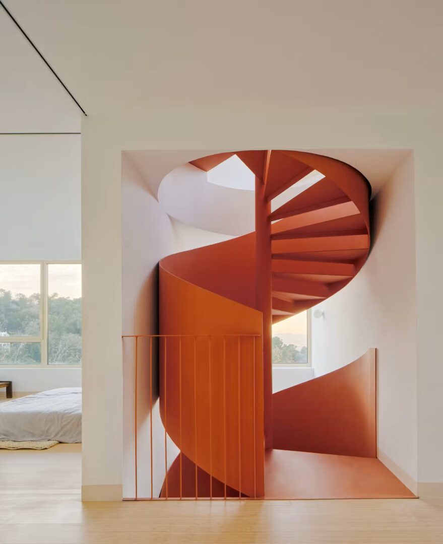 גרם המדרגות הפנימי יוצר חלל בגובה כפול, תוך הדגשת קישוריות חזותית ופונקציונלית בין קומות בתוך חלל רציף זה. לאחר מכן הוא עובר דרך פתח עגול לפני שהוא יוצא לגג דרך צריח מרובע מסתובב. בקומה העליונה, חלל מרכזי מחבר שתי מרפסות קטנות הממסגרות את הנוף תוך מתן גישה לשלושה חדרי שינה וחדר אמבטיה." חדר השינה הראשי כולל חדר ארונות וחדר רחצה צמוד, עם דלתות הזזה המאפשרות גמישות בתכנון החלל.