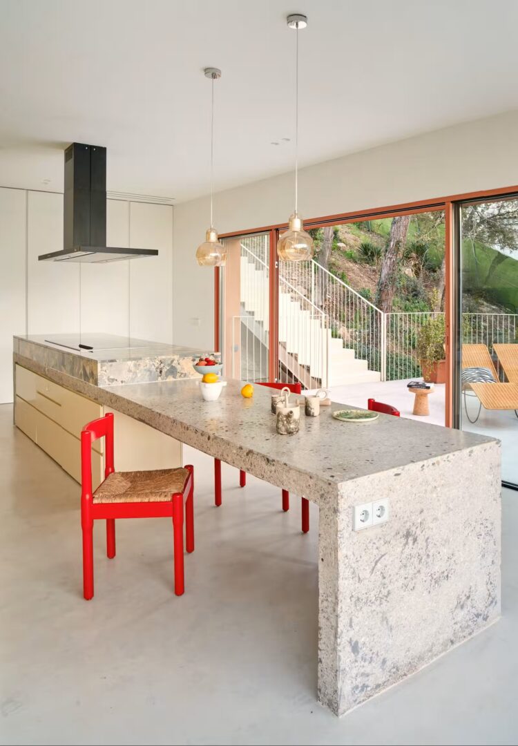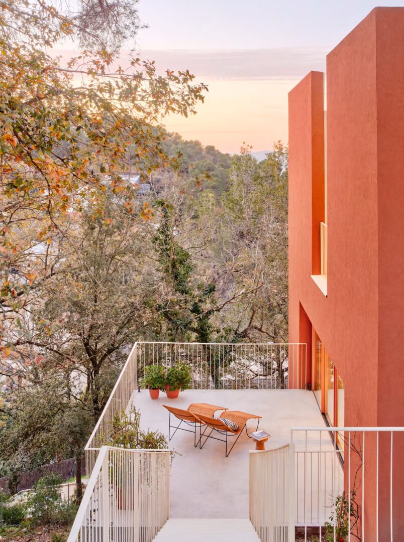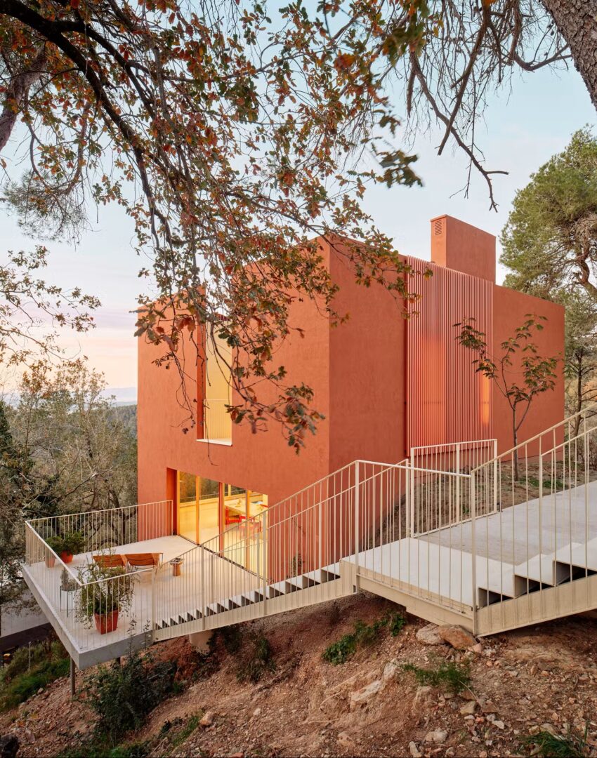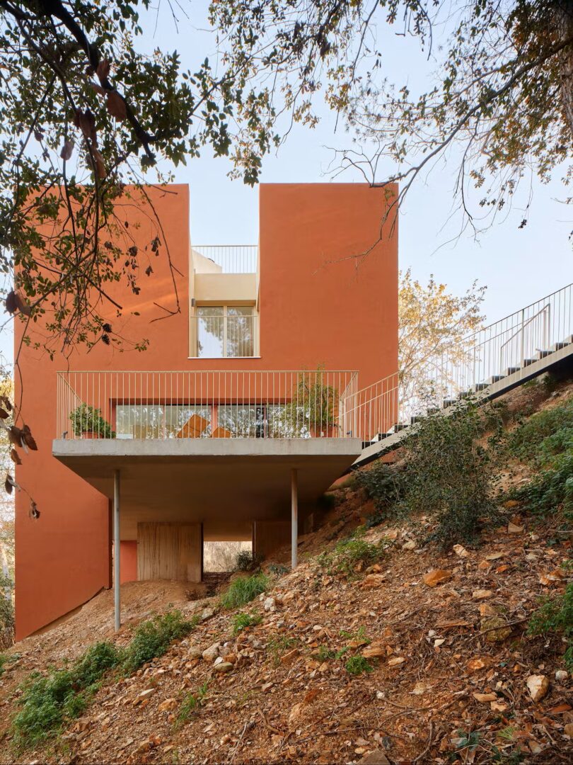 בית מגורים בנוי על מדרון תלול, אבל נמנע מלחפור חפירות משמעותיות בו בסלע הצפחה. הוא בקושי נוגע בקרקע, נתמך על ידי כמה מסכי בטון מבניים שמשאירים את השטח כמעט ללא שינוי.