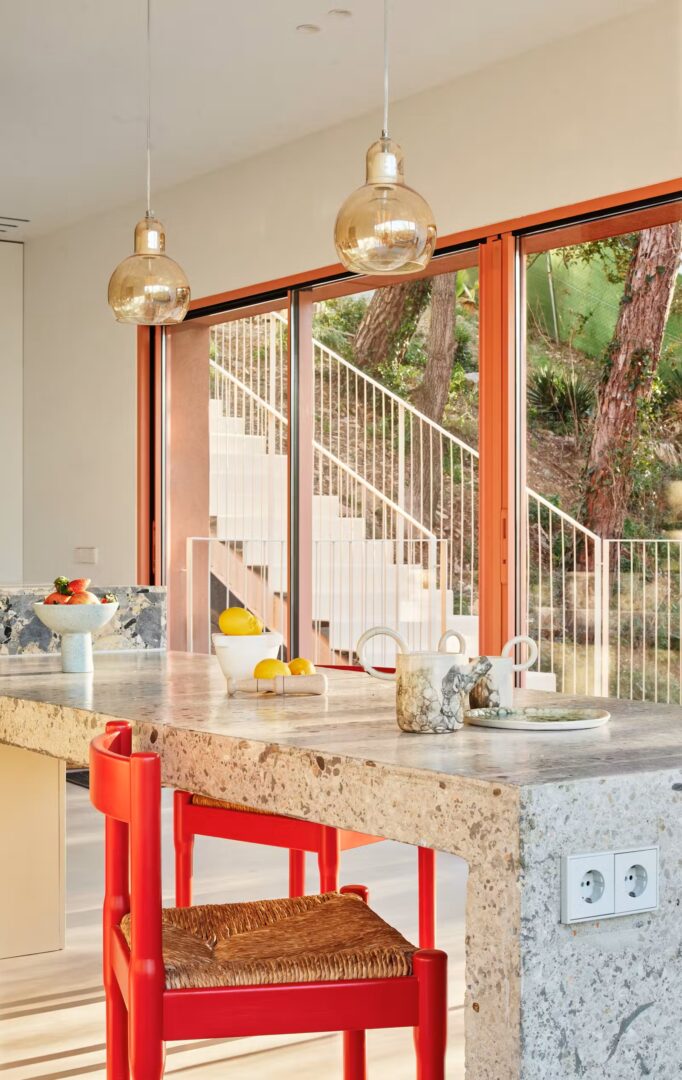 המדרגה הראשונה של גרם המדרגות הפנימי – חתיכת סלע מקומית ענקית – מחווה את גישתו של קרלו סקארפה לגרמי מדרגות, שתמיד נתפסה כהזמנה לעלות. אלמנט זה משקף את פילוסופיית הפרויקט, ומשלב רגישות לסביבה, יצירתיות פורמלית ומרחבית, שילוב נוף וקיימות."