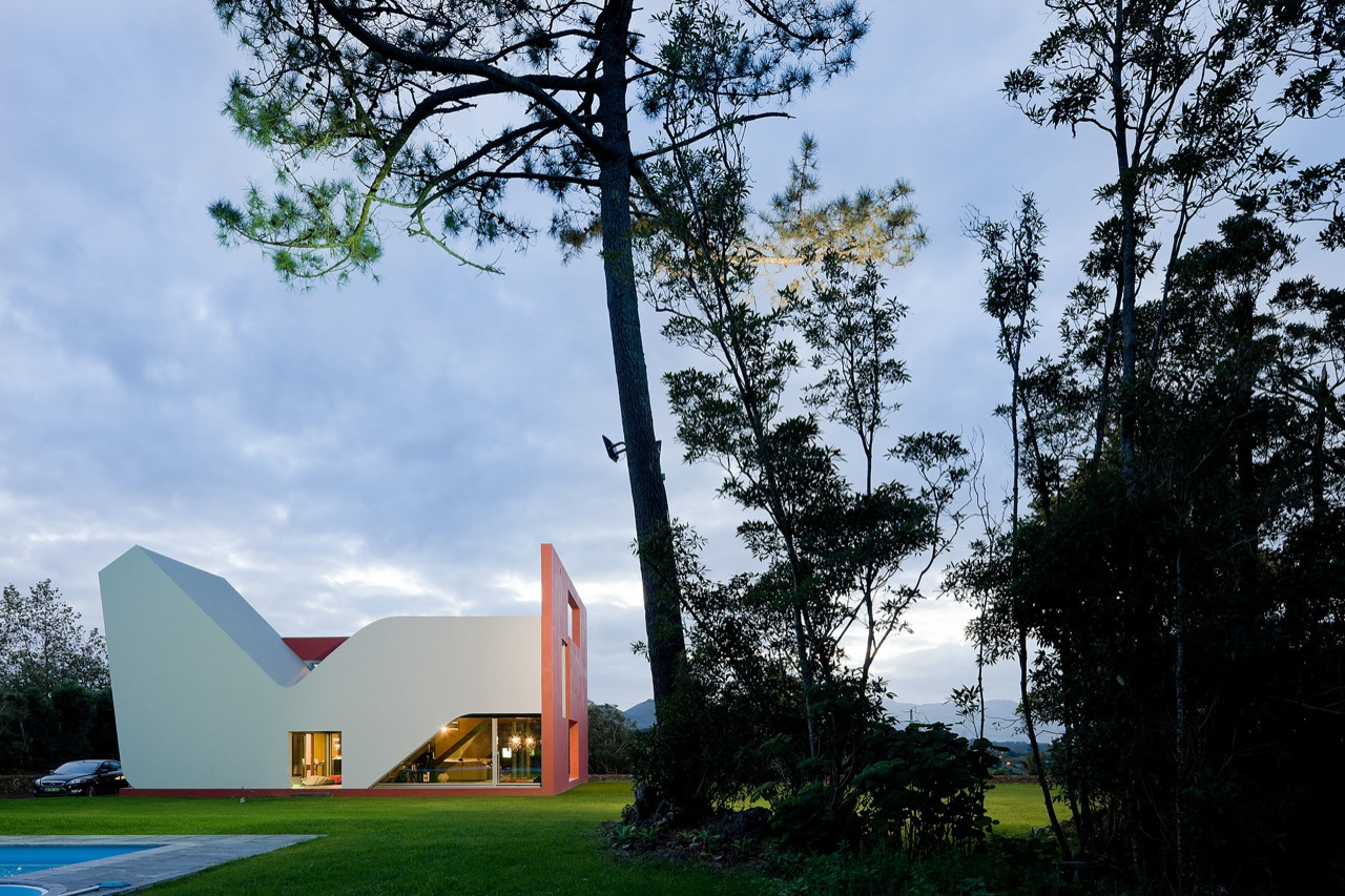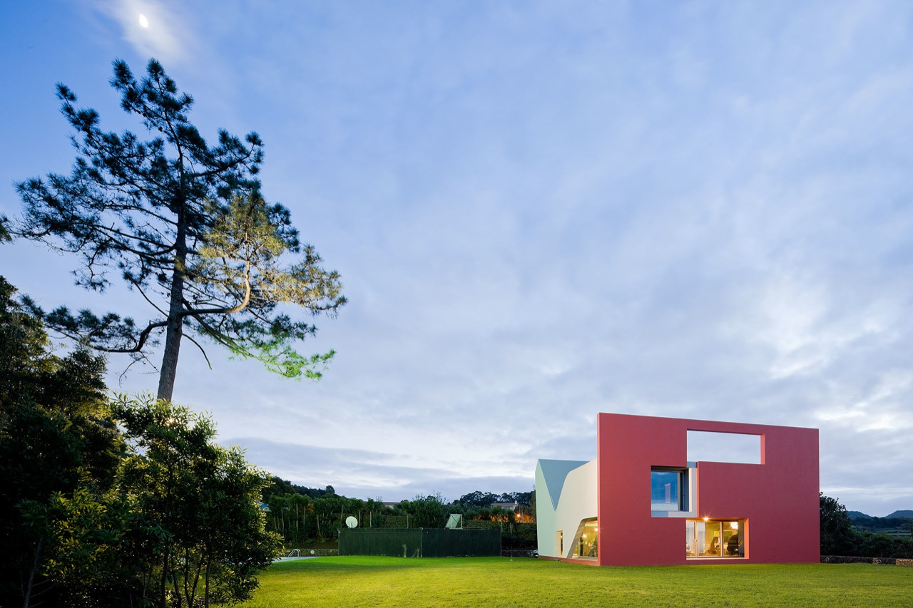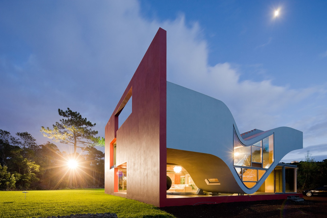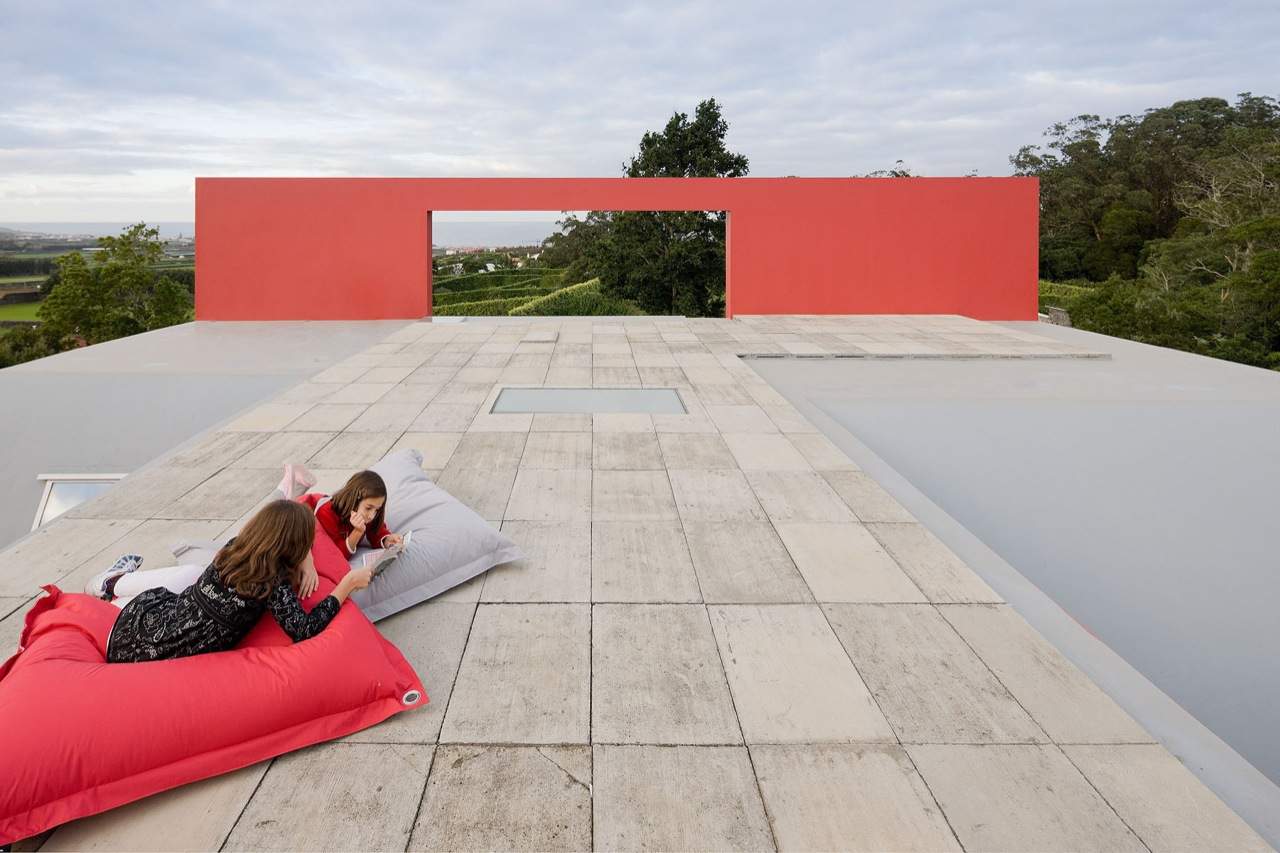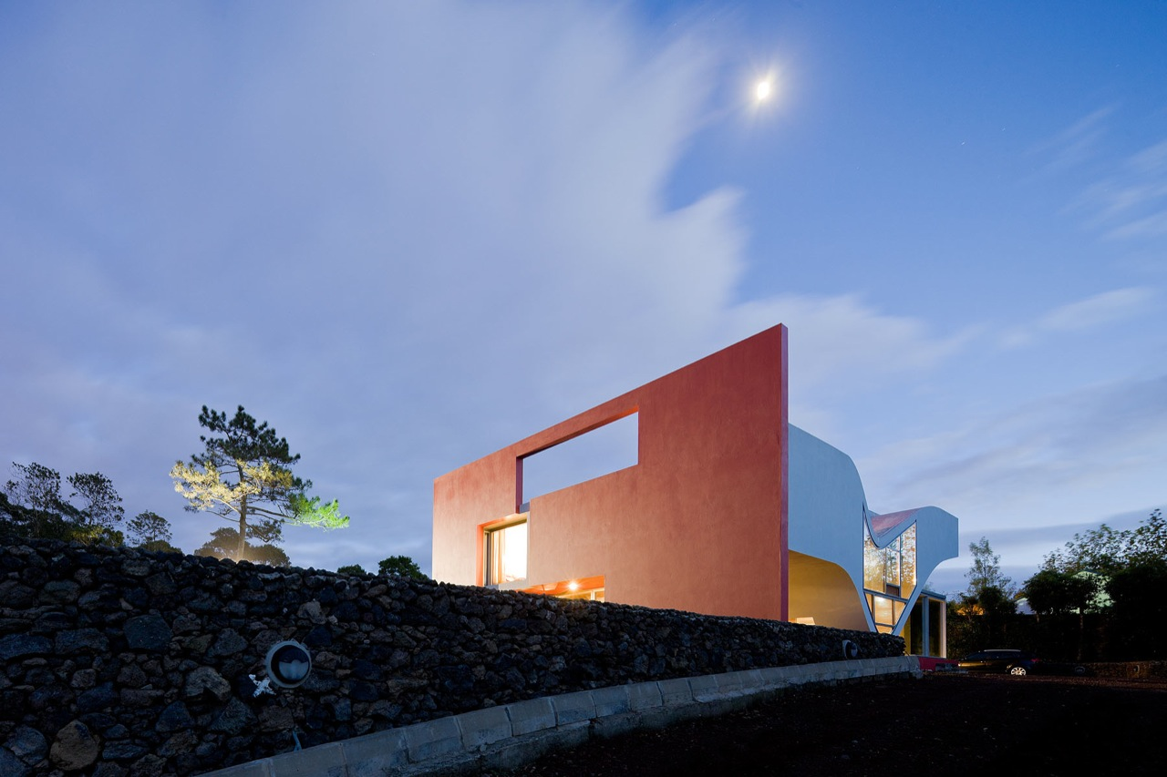 בית “Flight of Birds” ממוקם בעיירה Rabo de Peixe, ומתאפיין בשילוב בין קווים מעוגלים לנפחים גאומטריים, היוצרים קומפוזיציה דינמית ואורגנית. האלמנט הבולט ביותר הוא קיר אדום דרמטי, המשמש חיץ בפני רוחות חזקות וגשמים תכופים – תנאים אופייניים לאזור.