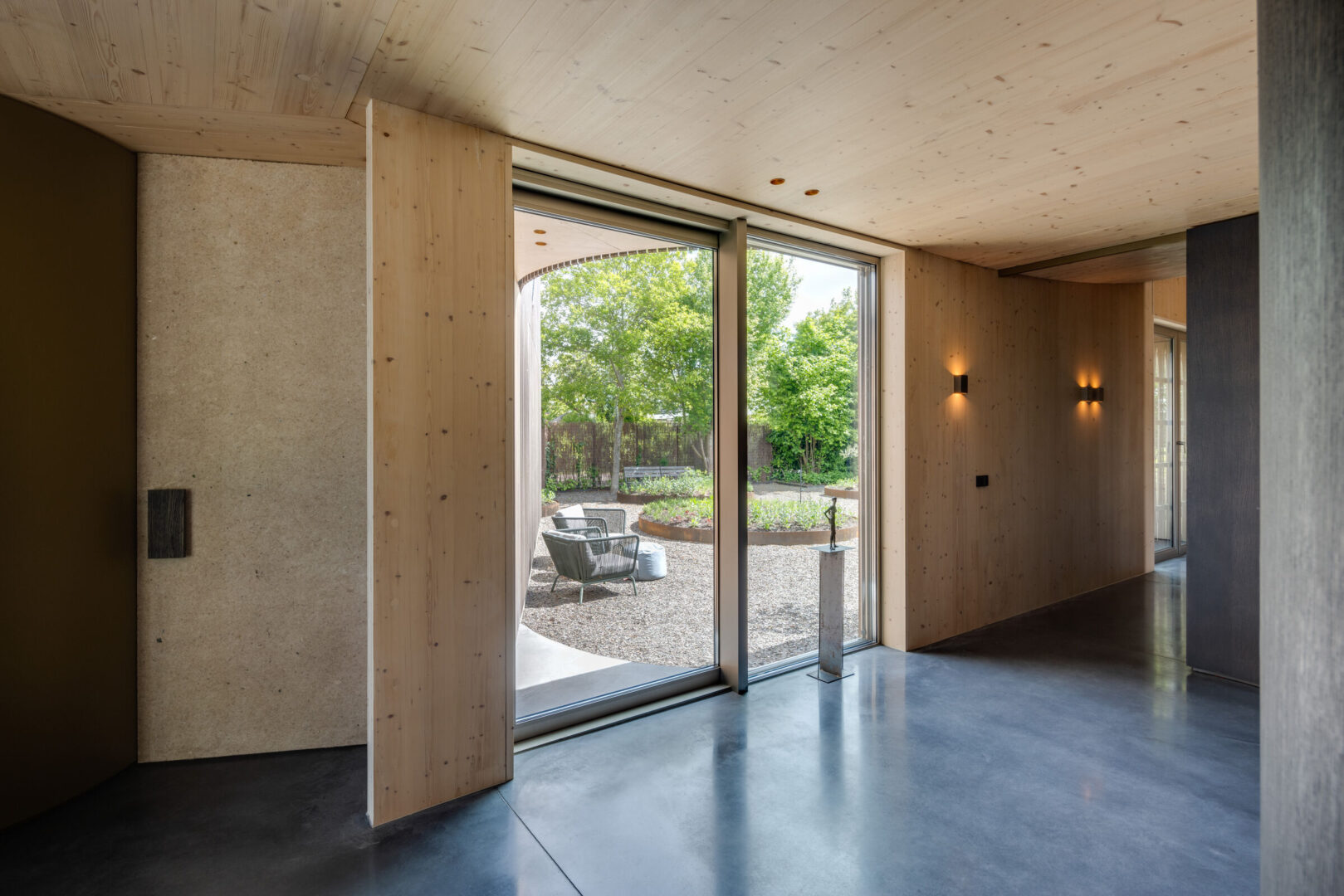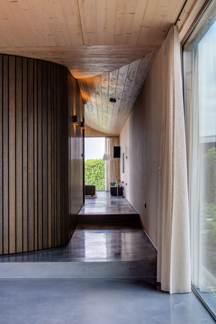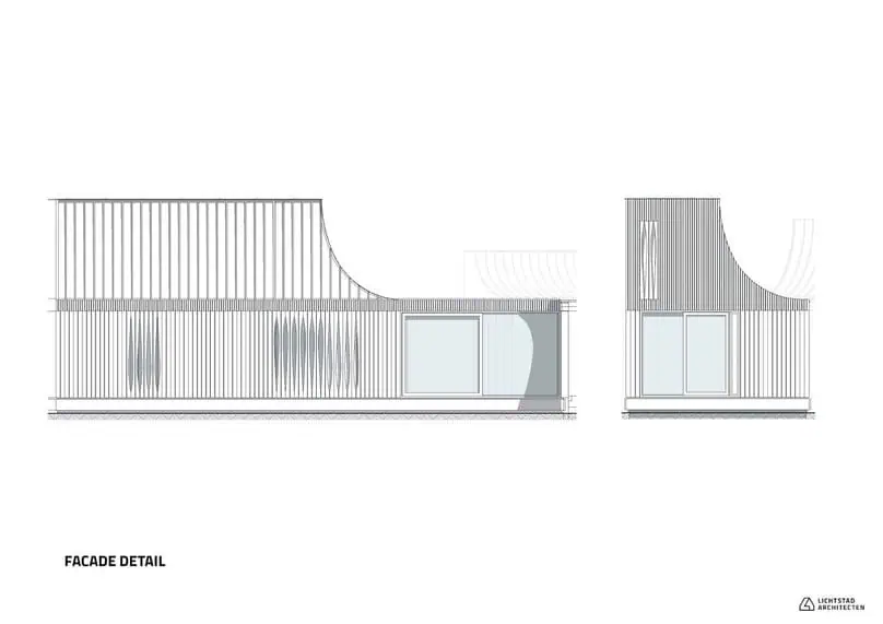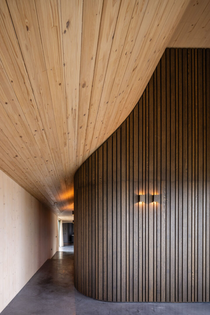 הבית שנבנה כולו מעץ למינציה צולבת (CLT), משלב בהירות מבנית עם איכות חושית חמה. העיצוב מרמז לבניית ספינות: עקמומיות הגג מהדהדת קווי גוף והנגרות מדויקת ואקספרסיבית. בחוץ, עץ לא מטופל ואבץ מתחממים באופן טבעי, מאזנים מרקם וחלקות תוך כדי ויסות אור. חריצים ליניאריים מסננים אור יום כדי להטיל צללים אלגנטיים על פני משטחים פנימיים. גג ירוק משפר את הנוחות התרמית ומרכך את הפרופיל האנכי; פאנלים סולאריים משולבים באופן דיסקרטי על גגות שטוחים גבוהים יותר. הבית מכוון לביצועים ניטרליים מבחינה אנרגטית עם חומרים מבוססי ביולוגיה ומעגליים, משאבת חום ממקור קרקע, בידוד נושם בעל ביצועים גבוהים, חזיתות מבוקרות לתאורת יום פסיבית וגימורים עמידים המתיישנים בחן – אדריכלות ואקולוגיה פועלות כאחד.
