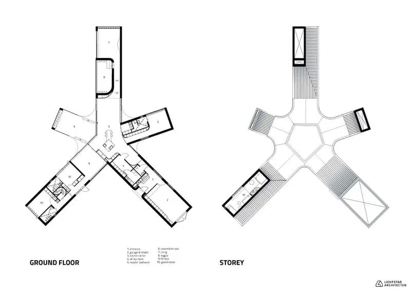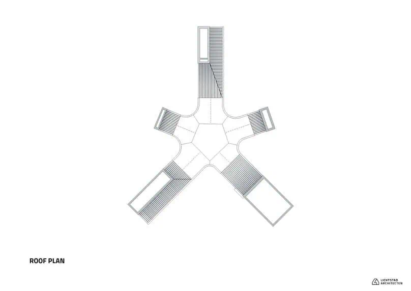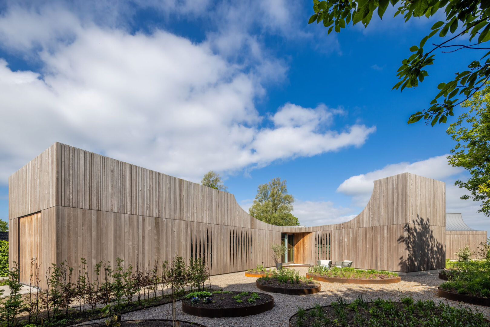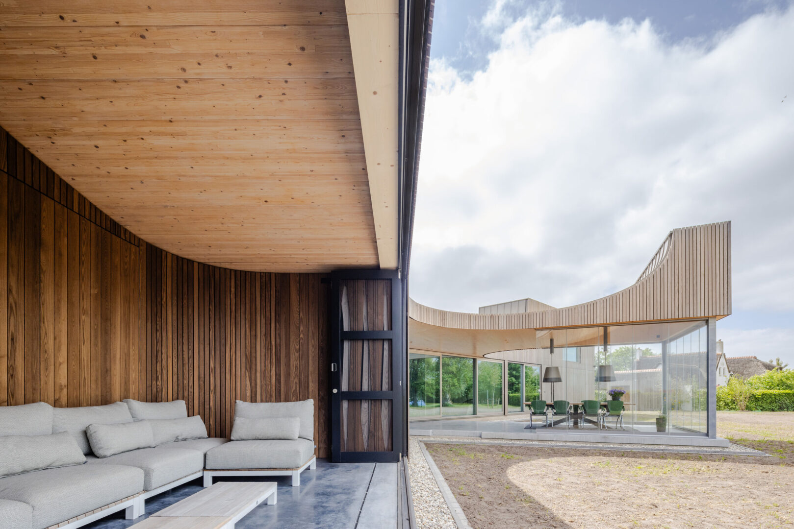 הבית שנבנה כולו מעץ למינציה צולבת (CLT), משלב בהירות מבנית עם איכות חושית חמה. העיצוב מרמז לבניית ספינות: עקמומיות הגג מהדהדת קווי גוף והנגרות מדויקת ואקספרסיבית. בחוץ, עץ לא מטופל ואבץ מתחממים באופן טבעי, מאזנים מרקם וחלקות תוך כדי ויסות אור. חריצים ליניאריים מסננים אור יום כדי להטיל צללים אלגנטיים על פני משטחים פנימיים. גג ירוק משפר את הנוחות התרמית ומרכך את הפרופיל האנכי; פאנלים סולאריים משולבים באופן דיסקרטי על גגות שטוחים גבוהים יותר. הבית מכוון לביצועים ניטרליים מבחינה אנרגטית עם חומרים מבוססי ביולוגיה ומעגליים, משאבת חום ממקור קרקע, בידוד נושם בעל ביצועים גבוהים, חזיתות מבוקרות לתאורת יום פסיבית וגימורים עמידים המתיישנים בחן – אדריכלות ואקולוגיה פועלות כאחד.