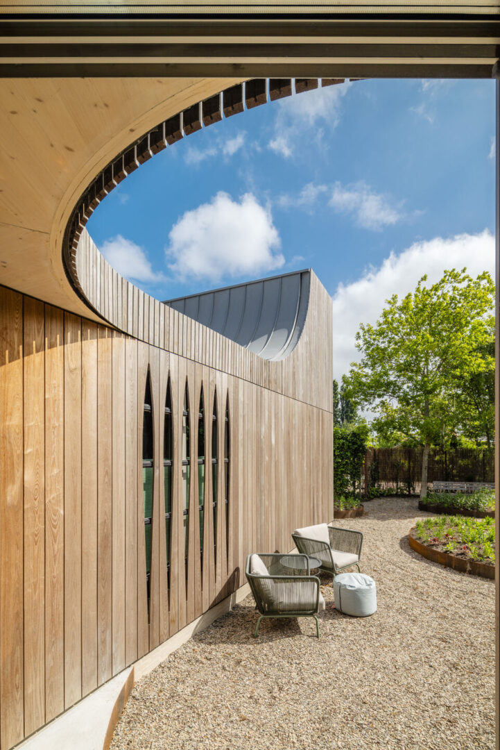 ההרחבה, שנבנתה כולה עם מסגרת עץ ומוגבהת על כלונסאות, מסתגלת לשיפוע הטבעי של האתר.
