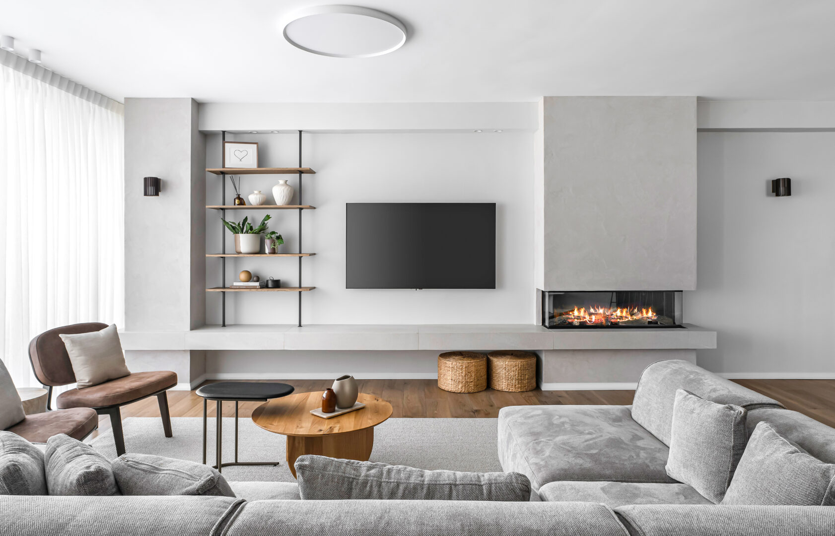 בסלון, במקום קיר טלוויזיה סטנדרטי, תוכנן קיר אמנותי רב־שכבתי שמשלב קמין, ספרייה, טיח מיוחד ואקססוריז נבחרים. “רצינו שהטלוויזיה תהיה חלק מהקיר ולא הכוכבת שלו,” מסבירה רוט. “שכשנכנסים לחלל, העיניים יפגשו יופי, לא מסך”.