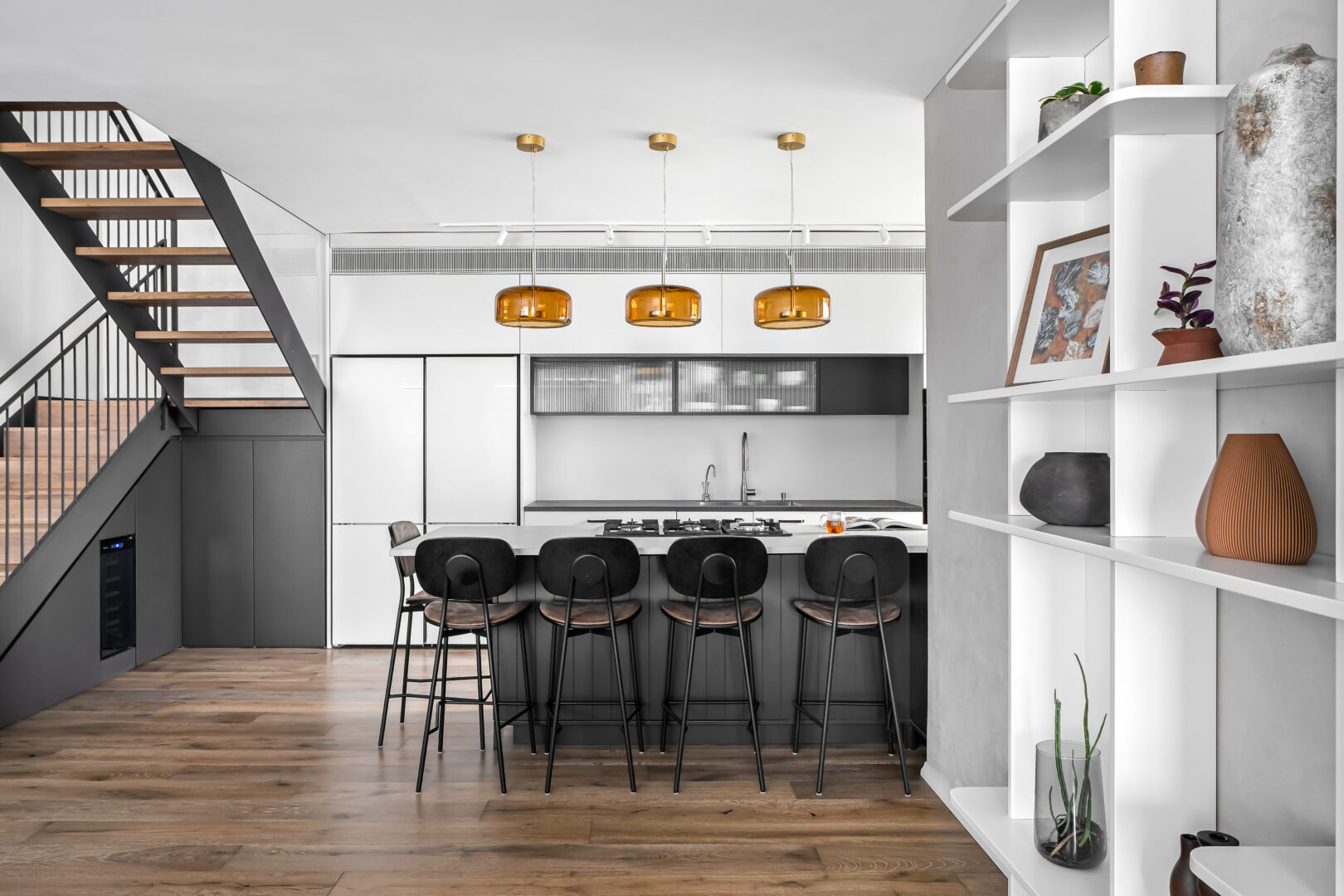 הקומה התחתונה נועדה לכל המשפחה – עם סלון, פינת אוכל ומטבח המשדרים חמימות ורצף עיצובי. המטבח תוכנן סביב אי מרכזי בגמר ברזלי בגוון חום כהה, המשלים את מדרגות הברזל הקלילות שנוספו במהלך השיפוץ. הבכורה עברה לסויטת ההורים בקומה התחתונה, שגם היא שופצה, וכעת לכל אחד מהאחים חדר משלו.