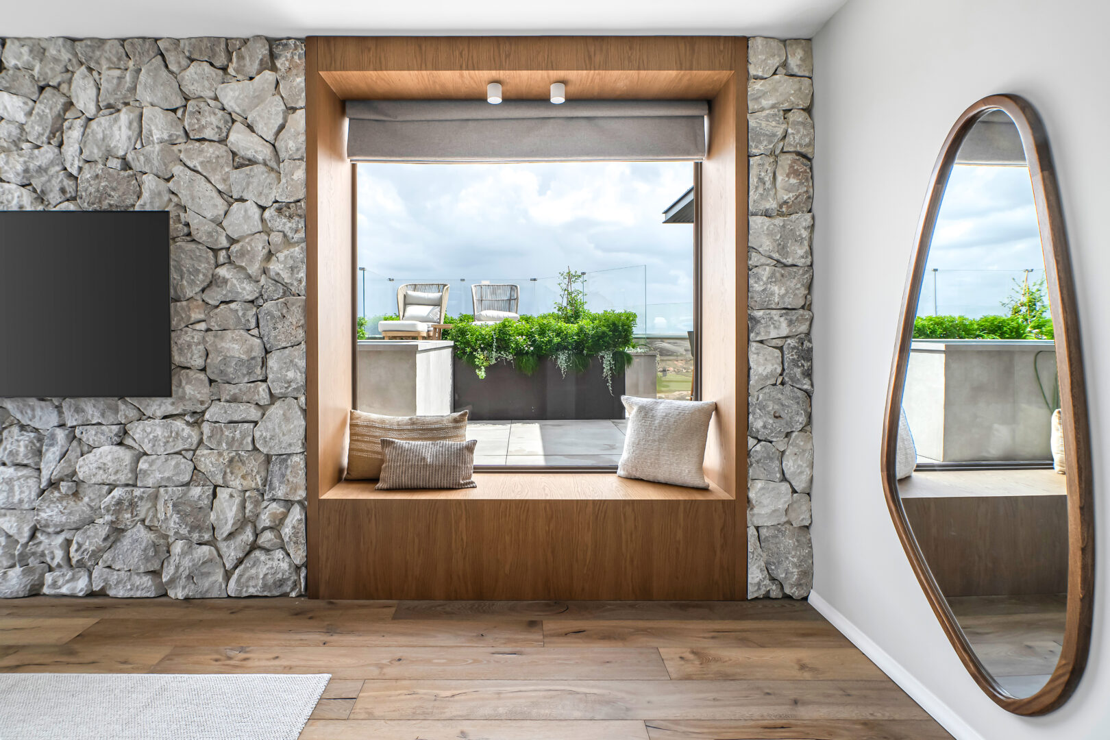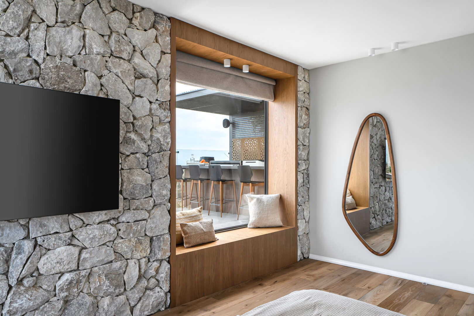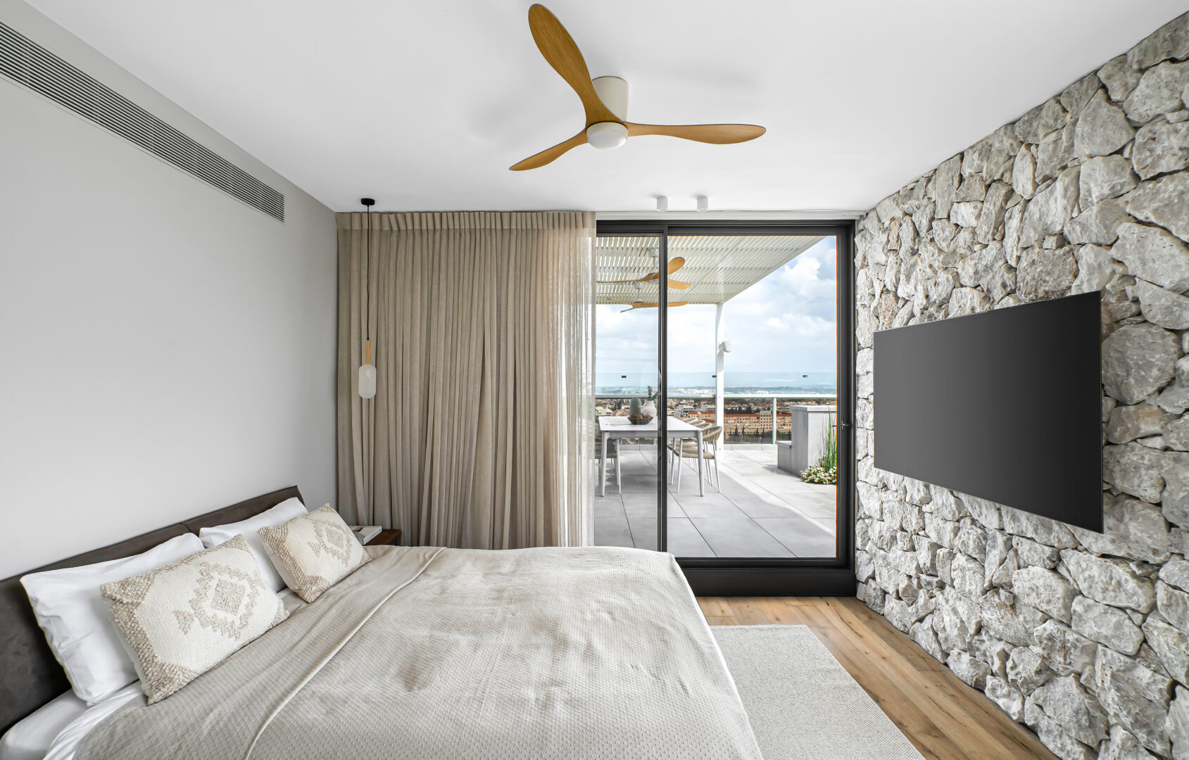 מבפנים, הקומה העליונה ממשיכה את אותה שפה רגועה ומלטפת. סוויטת ההורים מעוצבת בהשראת מלונות בוטיק אירופיים: שימוש בעץ טבעי, טקסטורות עשירות, קמין חמים ומגע של רכות בכל פרט. “המטרה הייתה להיכנס לחלל ולשכוח שאתה בבית,” מסבירה רוט. “להרגיש חופשה. השתמשנו בעץ, אבן, טקסטיל עשיר – והכול בגוונים חמים ומרגיעים.”