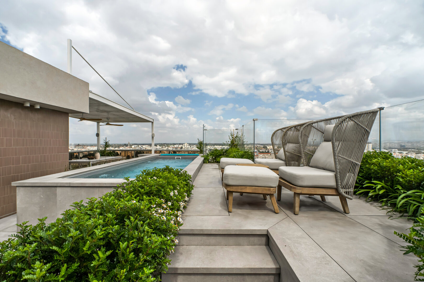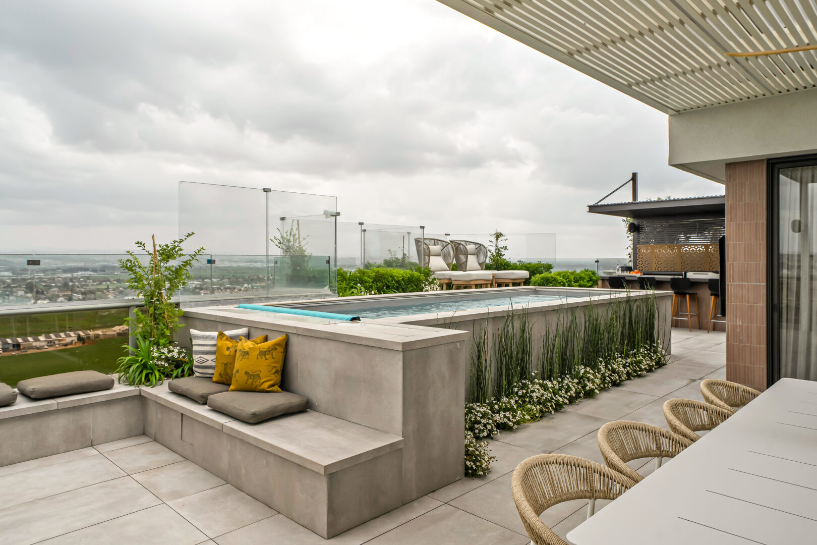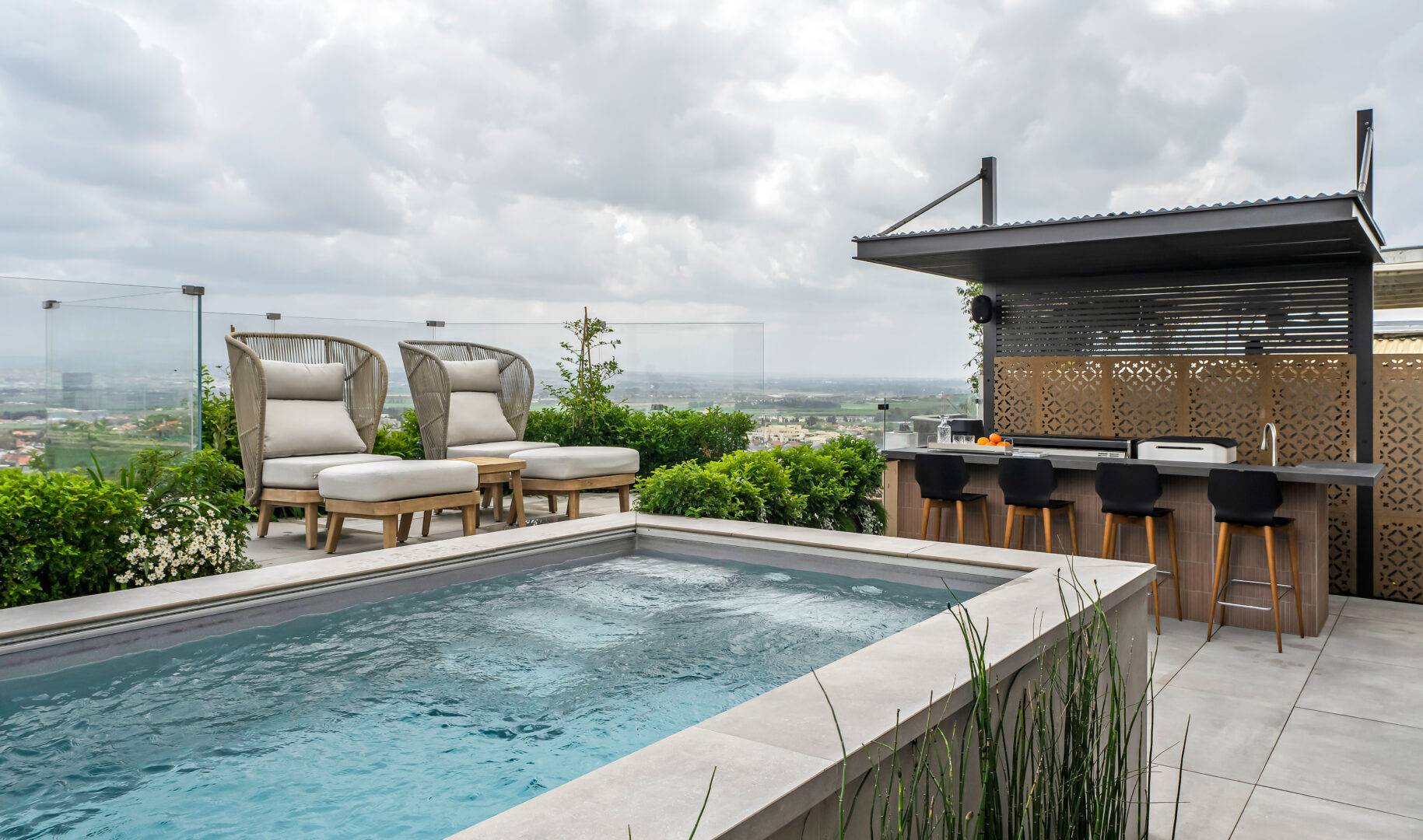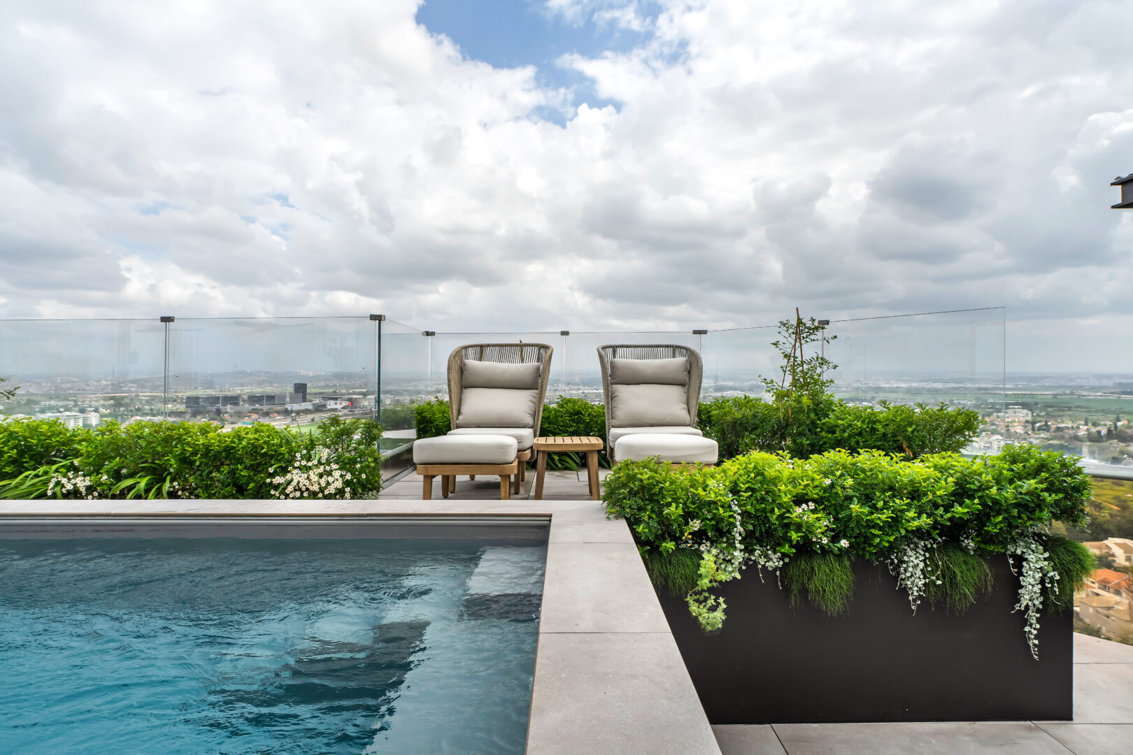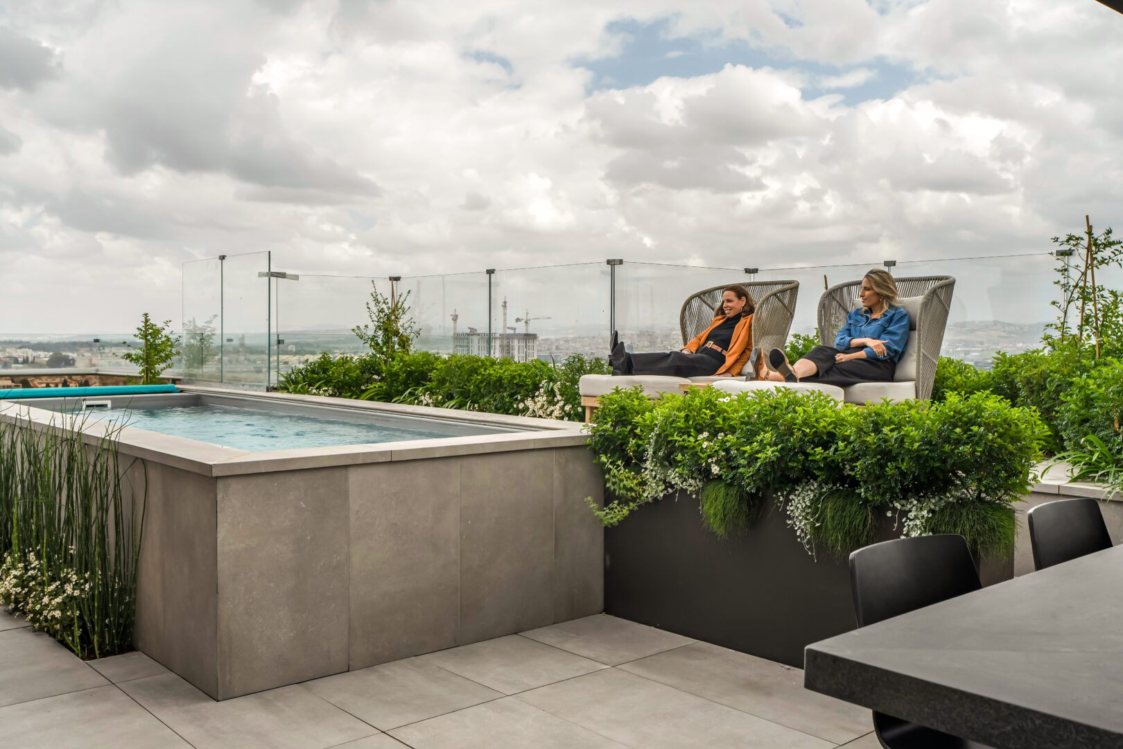הגג עוצב כמתחם אירוח שלם עם בריכה מוגבהת, מטבחון חוץ, בר ישיבה, פינת אוכל, אזורי שיזוף ופינות ישיבה מגוונות. הנוף שנפרש מהגג הוא כמעט אינסופי – הירוק של השרון נפגש עם קו הרקיע של גוש דן, והתחושה היא של וילה צפה מעל העיר. כדי לטשטש את גובה הבריכה ולשלב אותה בעדינות בשפת העיצוב, נבנה קיר ירוק וצמחייה משולבת שמרככת את הנוכחות שלה ומעניקה לה תחושת טבע. הרצפה רוצפה באריחים גדולים במראה ריצוף צף, שמאפשרים ניקוז אלגנטי ושומרים על אחידות עיצובית.
