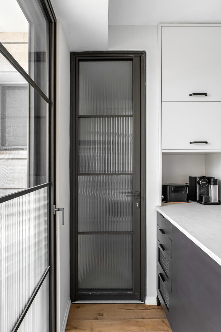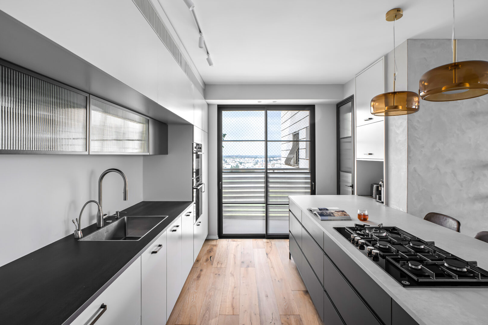 המטבח עצמו נהנה מוויטרינה רחבה שמחברת אותו למרפסת קטנה, ויוצרת דיאלוג קבוע עם החוץ. פינת האוכל ממוקמת בציר הראייה אל החוץ, ומכניסה אור טבעי לכל חלל המגורים.