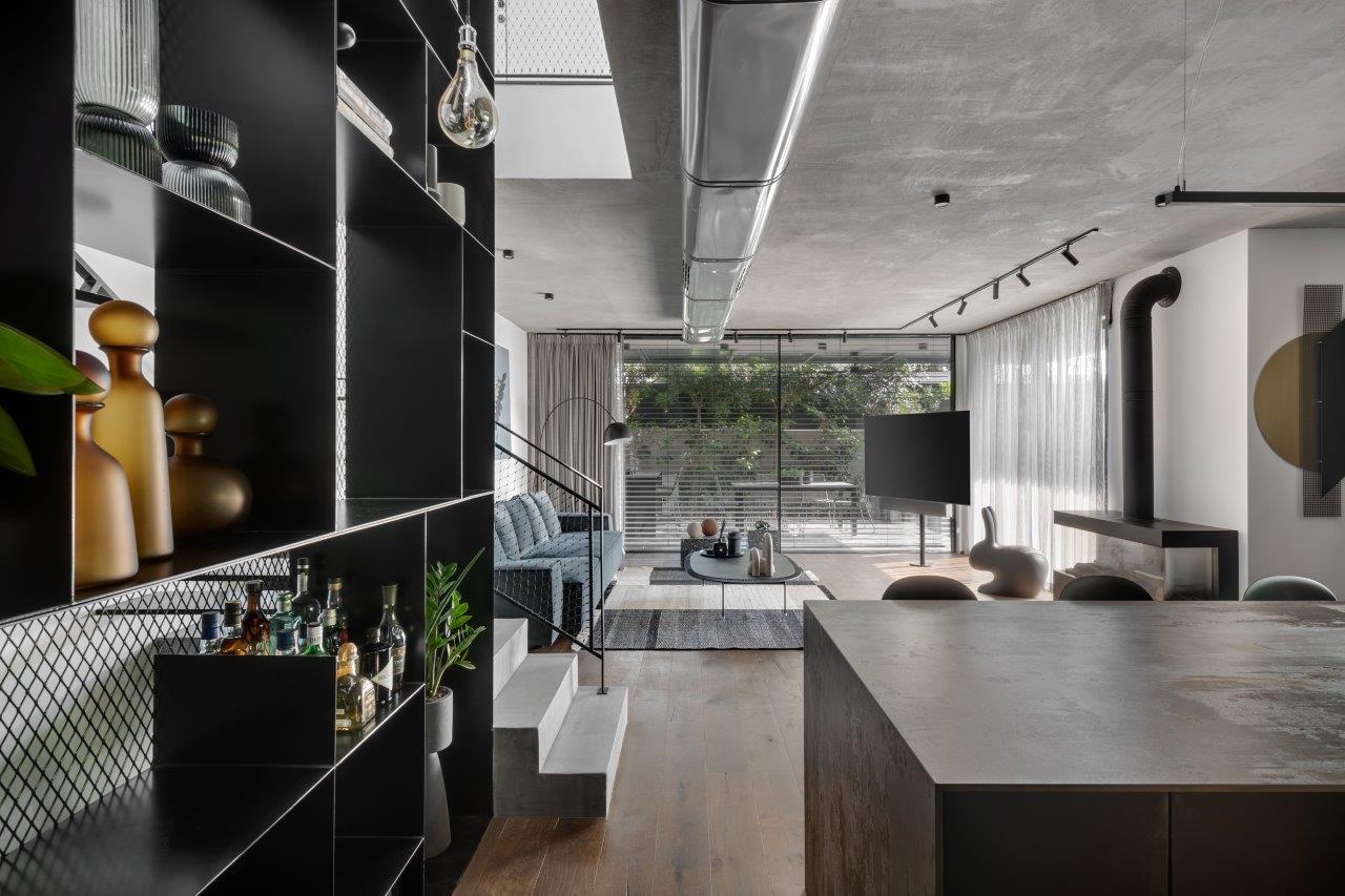 בהמשך, הסלון שמהווה פינה אסטרטגית. יחד עם אדריכל הרישוי תכנן הורוביץ קירות מסך שפותחים את החלל באופן כמעט בלתי אמצעי לגינה המטופחת: "התחושה בו מאוד נעימה ומזמינה", הוא מסביר. "סגנון תעשייתי מתפרש לרוב כקר ומנוכר אבל הודות לצבעוניות המונוטונית והעדר קפיצות או טקסטורות מוגזמות התחושה שמתקבלת כאן היא מאוד מכילה ועוטפת. תעלת המיזוג החשופה, הקמין המרשים והשילוב בין הבטון לעץ מקנים לאזור הזה מראה מדויק ונקי. העדר הנישות והחלוקות מעצים את האלמנטים שבו- הפנים מרגיש פחות אדריכלי והחלוקה בין הפונקציות מתבהרת".