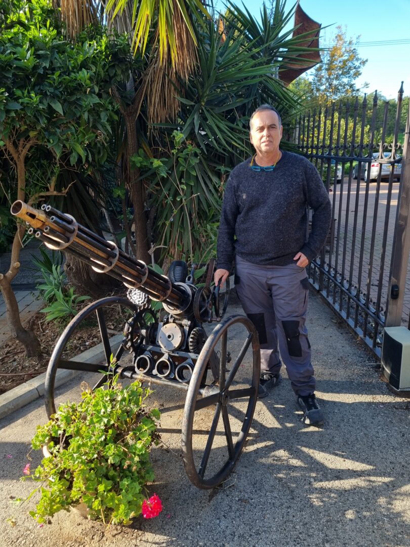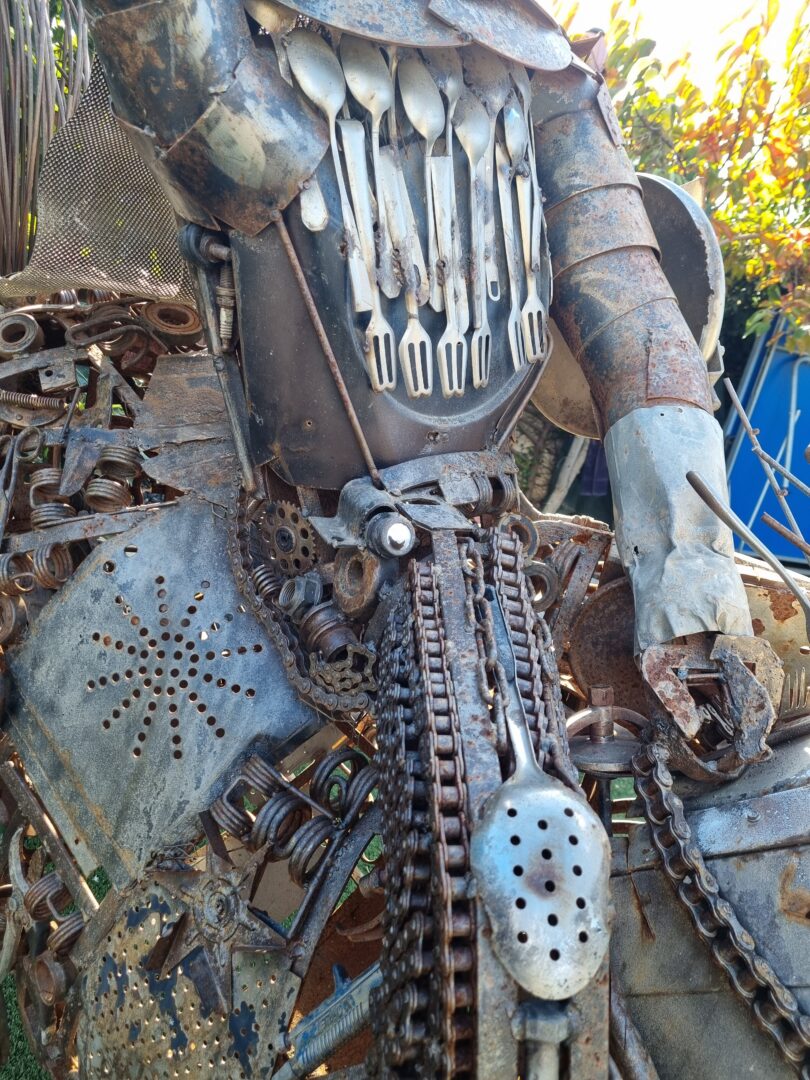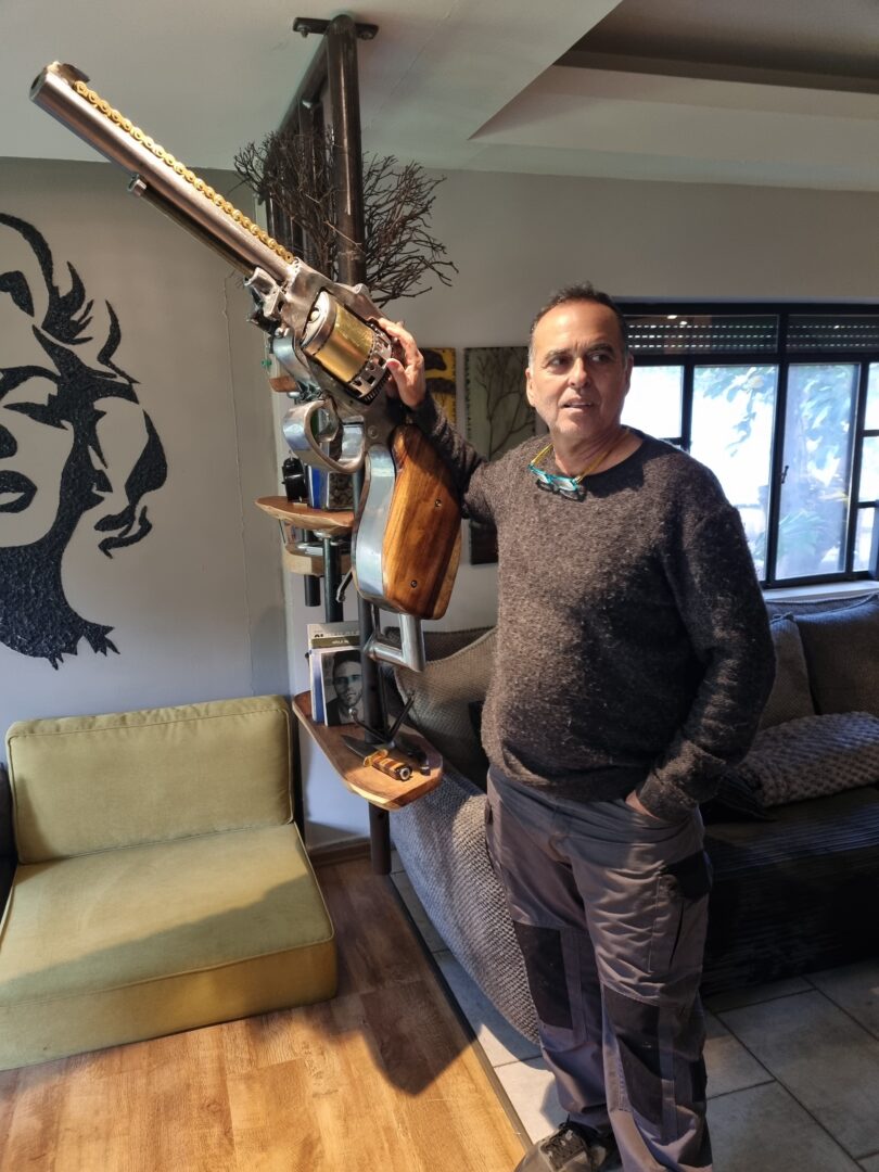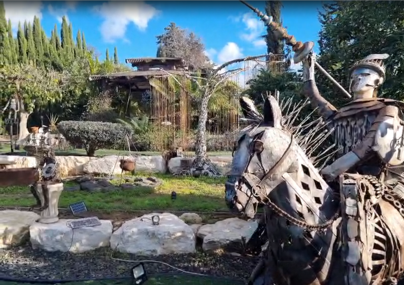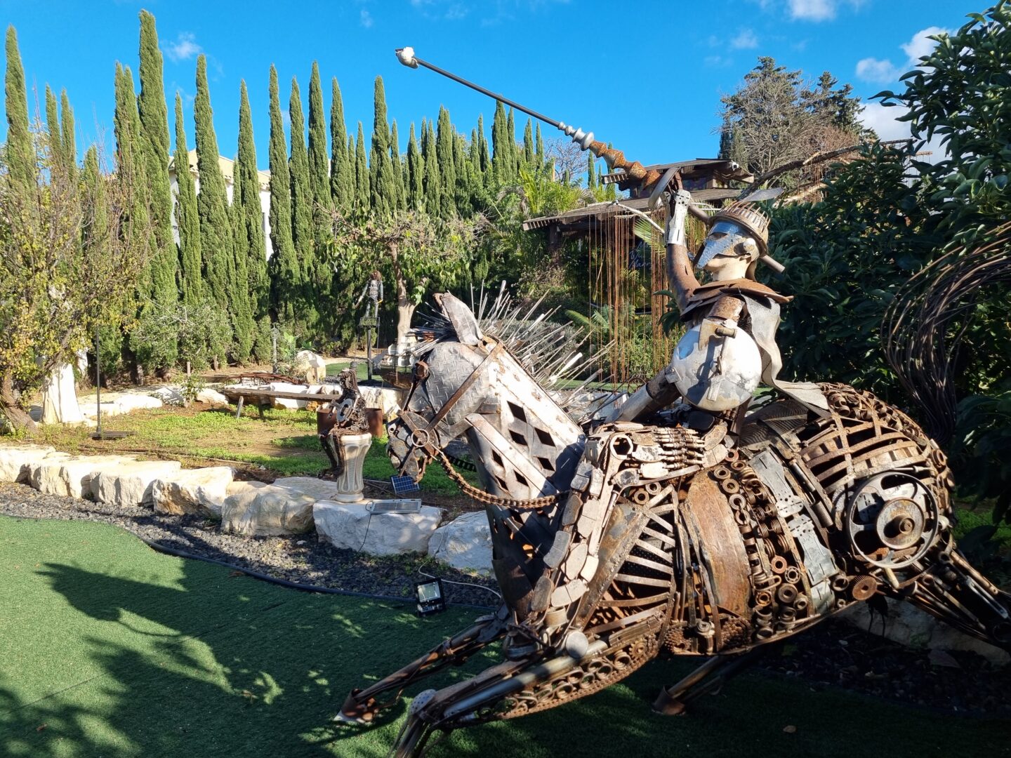 אמיר בן עזרא, אמן ואוטודידקט רב־תחומי, בורא דמויות ופסלים מחלקי גרוטאות: גלגלי אופניים, הגה של מכונית, ברזים, מזלגות וכפיות – כולם זוכים לחיים חדשים בתוך פסל ענק של דון קישוט הרכוב על סוסו. ככל שמתקרבים, מתגלה המורכבות: אין כאן קישוט מקרי, אלא מלאכת מחשבת של חיבור, איזון ודמיון.