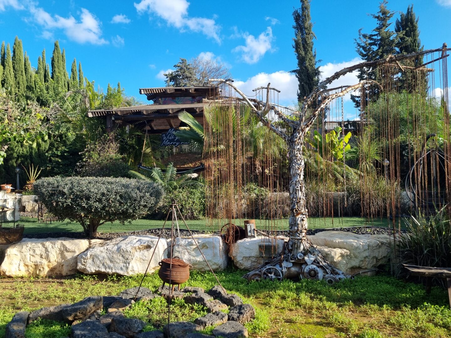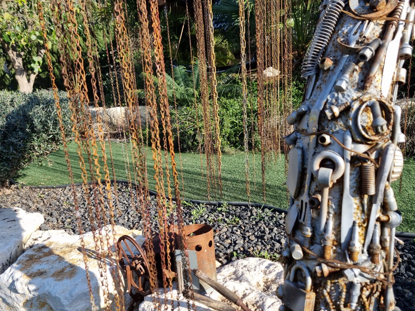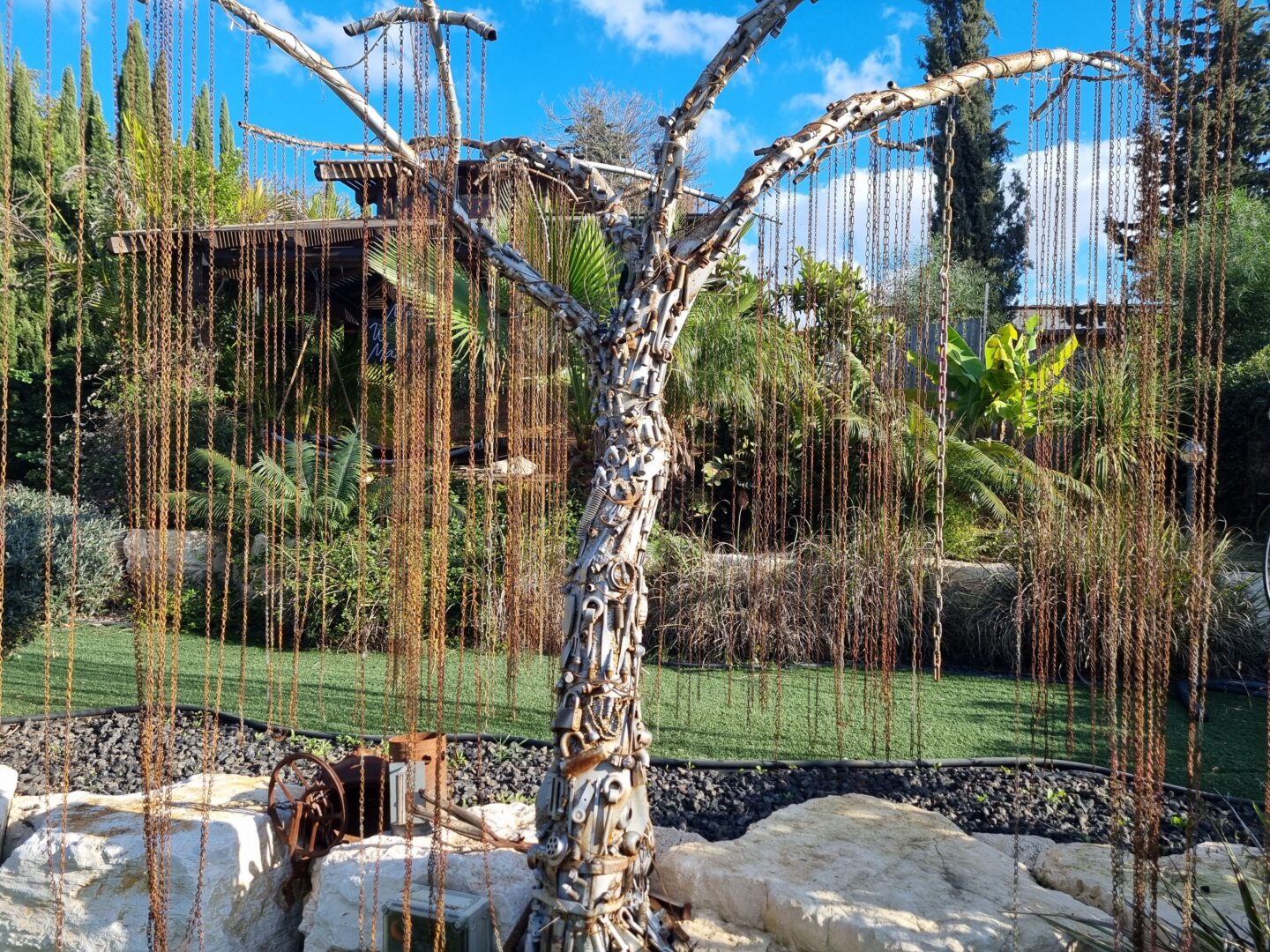 גם הטבע שבחצר אינו מה שהוא נראה במבט ראשון. עץ ערבה בוכייה, הנטוע בגינה, עשוי כולו משרשראות מתכת המשתלשלות מטה כענפים. חלק מהיצירות אף נעות: גלגל טחנת קמח מעץ, המוצב בתוך בריכת מים, מסתובב מכוח זרימה מעגלית של מים הנשאבּים וחוזרים אל הבריכה – מנגנון פשוט, חכם ומקיים את עצמו. דמות של מנקה רחובות, העשויה מקפיץ ענק, נעה מצד לצד ומטאטאת את סביבתה בתנועה שובבה ומלאת חיים.