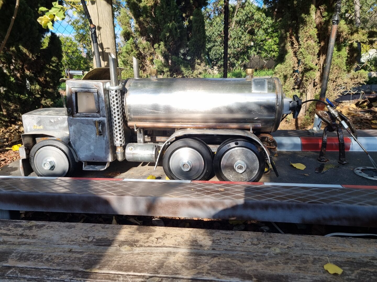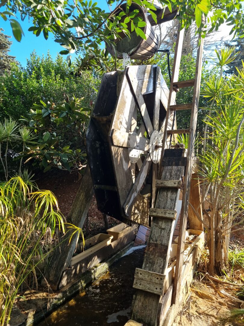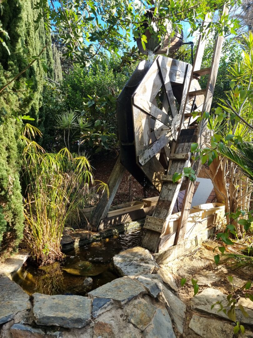 גם הטבע שבחצר אינו מה שהוא נראה במבט ראשון. עץ ערבה בוכייה, הנטוע בגינה, עשוי כולו משרשראות מתכת המשתלשלות מטה כענפים. חלק מהיצירות אף נעות: גלגל טחנת קמח מעץ, המוצב בתוך בריכת מים, מסתובב מכוח זרימה מעגלית של מים הנשאבּים וחוזרים אל הבריכה – מנגנון פשוט, חכם ומקיים את עצמו. דמות של מנקה רחובות, העשויה מקפיץ ענק, נעה מצד לצד ומטאטאת את סביבתה בתנועה שובבה ומלאת חיים.