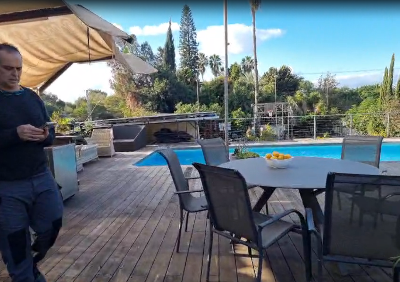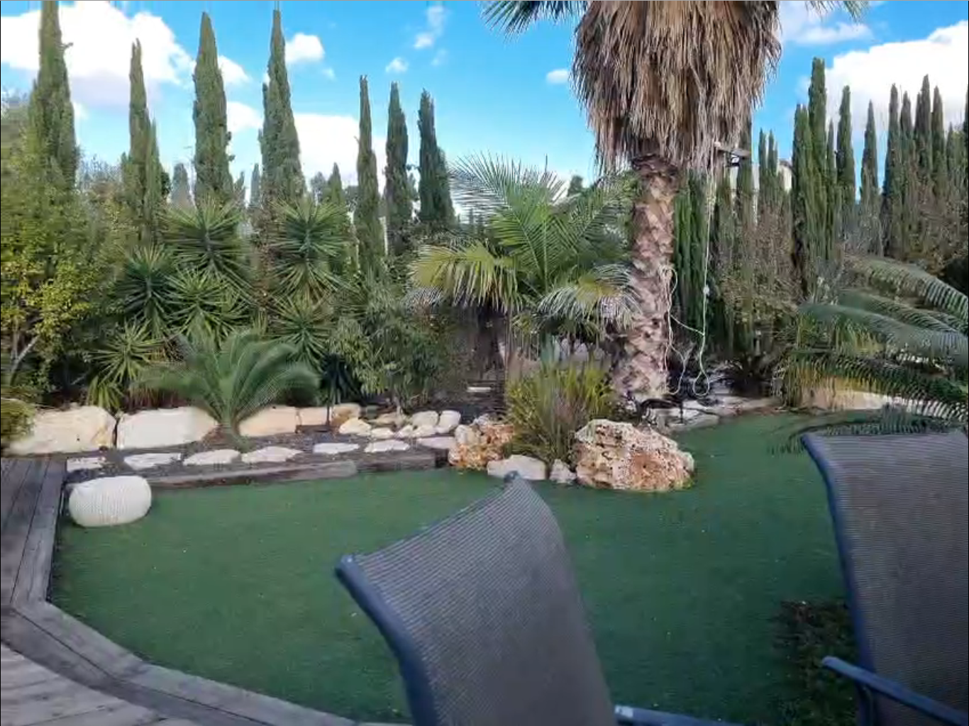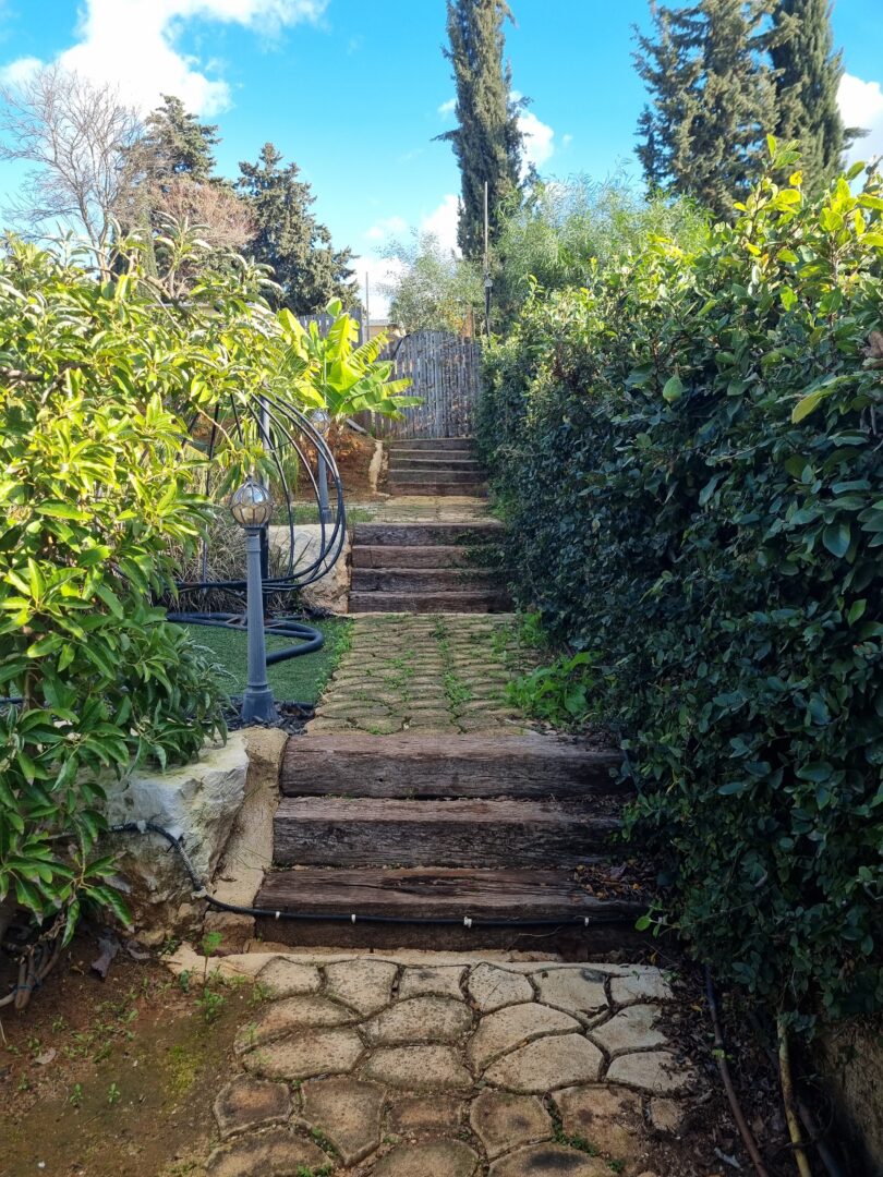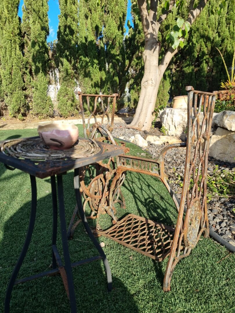 החצר רחבת הידיים, המשתרעת על פני יותר משני דונם, מחולקת למתחמי עונג ביתי: בר חוץ, אזור אירוח עם מטבח פתוח, ובריכת שחייה – כולם בנויים בעבודת יד מאדנים, צינורות שעברו הסבה, סלעים וחלקי מכונות. ספסל ישיבה נולד מחדש ממכונת תפירה ישנה וחלודה, וגופי תאורה סולריים מאירים את המרחב באור רך ויעיל. כל פרט כאן הוא גם יפה, גם פרקטי וגם חכם.