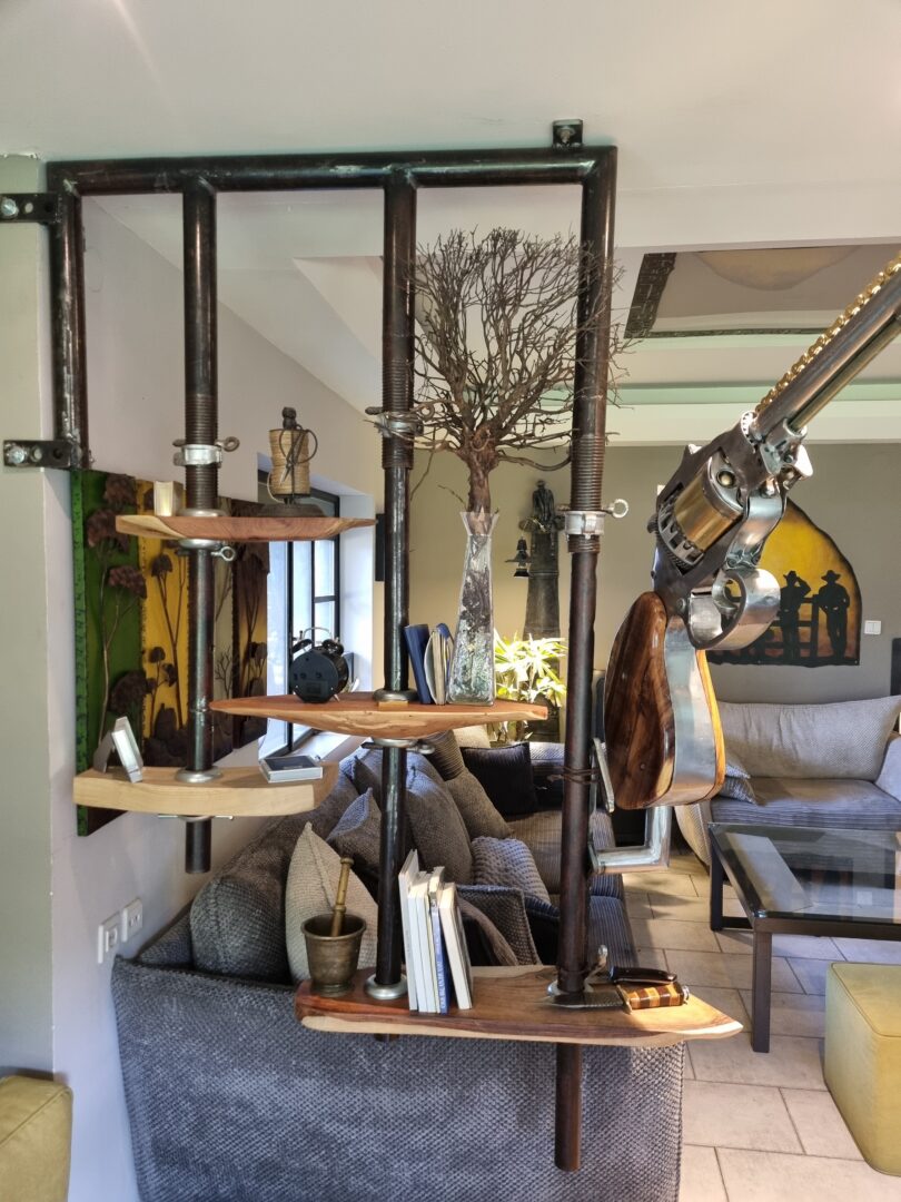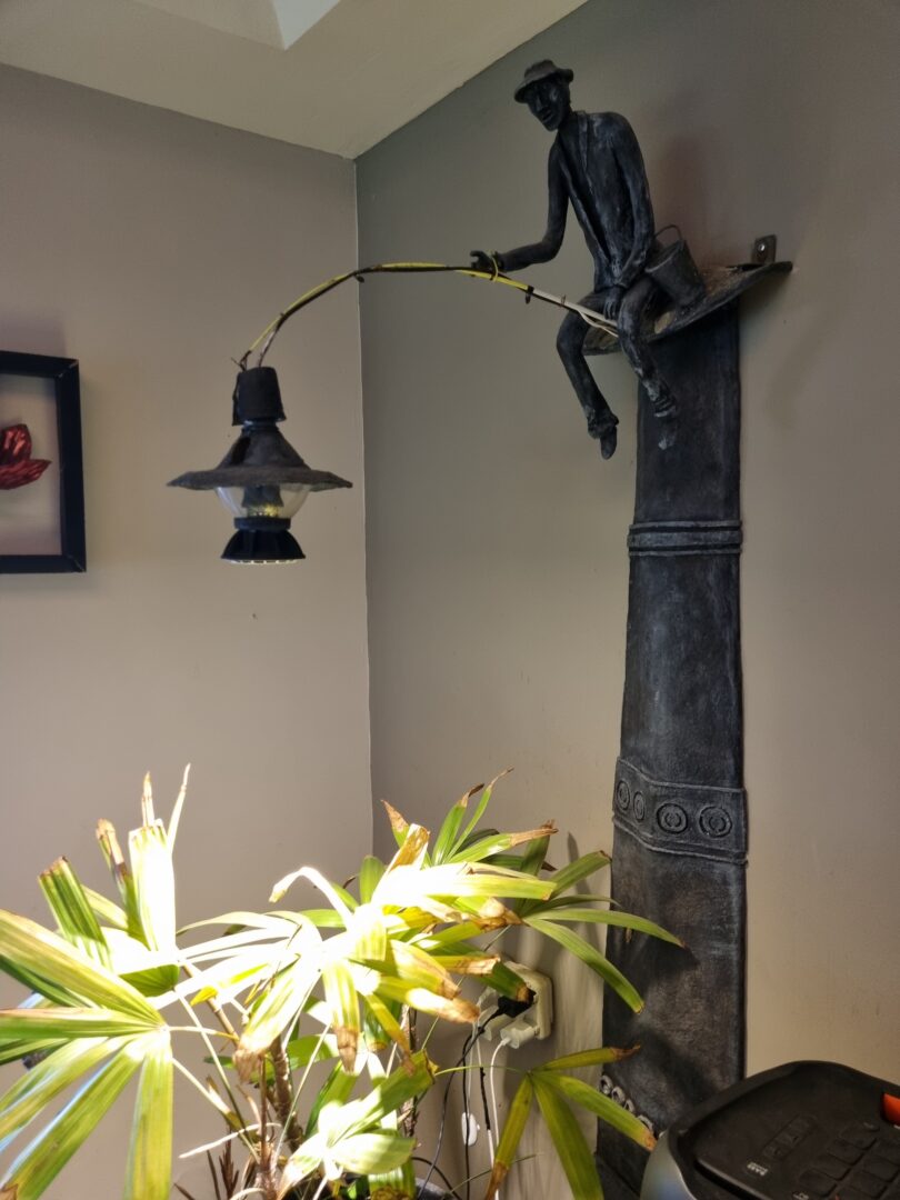 היצירה נמשכת אל תוך הבית פנימה. עשרות פריטי ריהוט, מנורות ואובייקטים פיסוליים מרכיבים את חללי המגורים. בסלון תלויה מנורה עשויה גוף מתכת, שעליו יושב דייג קטן, המשלשל מחכתו את מקור האור אל החלל – מחווה פיוטית לחיבור בין סיפור, חומר ותפקוד.