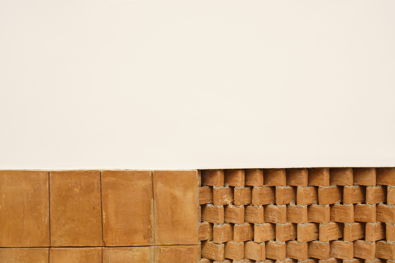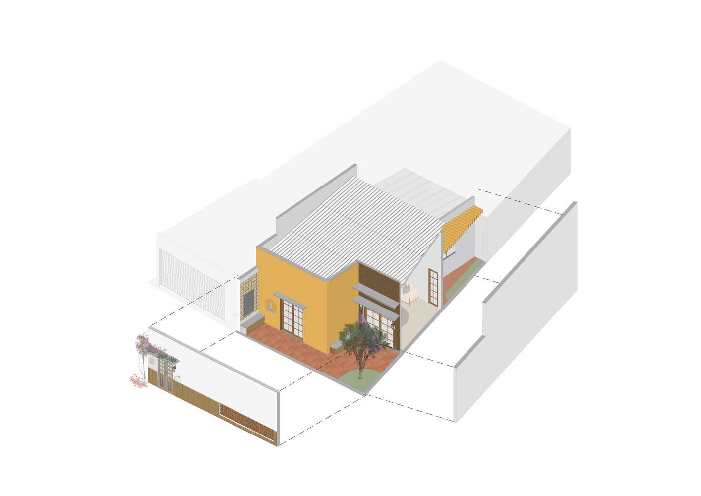 החזית המקורית נשמרה לבקשת הדיירת, אך קיבלה פרשנות חדשה באמצעות דפוס של לבנים קרמיות מחוררות, בהשראת שיטות ייבוש מקומיות. גם בסיס הקיר חופה באריחים שיועדו במקור לתנורי ייצור קמח הקסאווה – מחווה נוספת לחומריות המקומית.