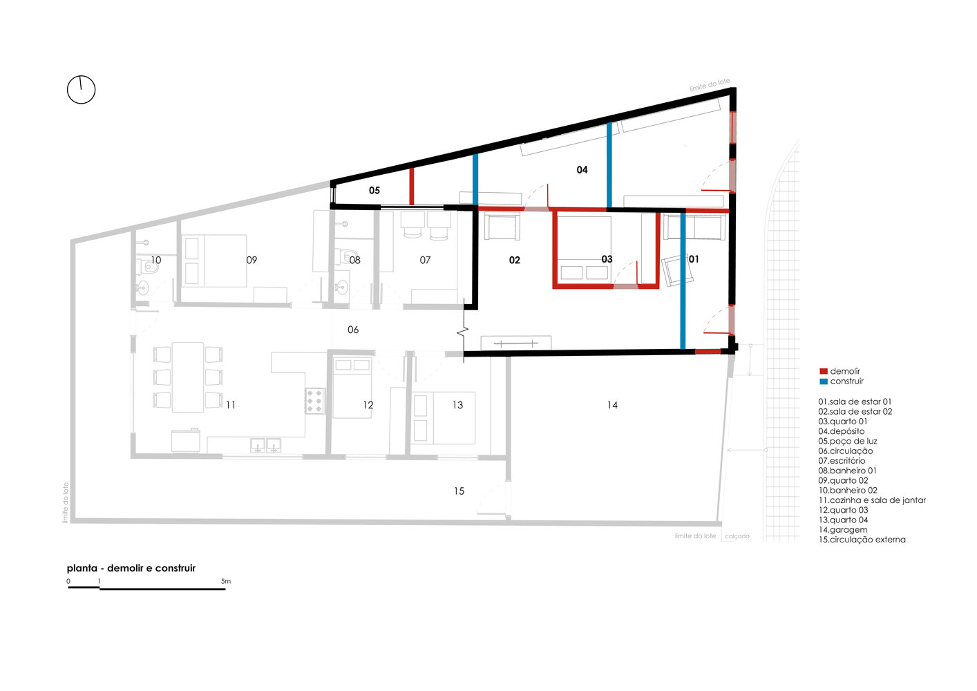 חללים קטנים ולא מנוצלים נהרסו לטובת סלון רחב, גינה פנימית ומרפסת פתוחה – מהלך שמחזק את תחושת הקהילתיות והאירוח שהייתה טבועה בבית מלכתחילה. דלתות הכניסה שוקמו והוגנו באמצעות לוחות בטון טרומיים המשמשים כבריס־סוליי אופקי זול, ואף הופכים לספסלים במרפסת.