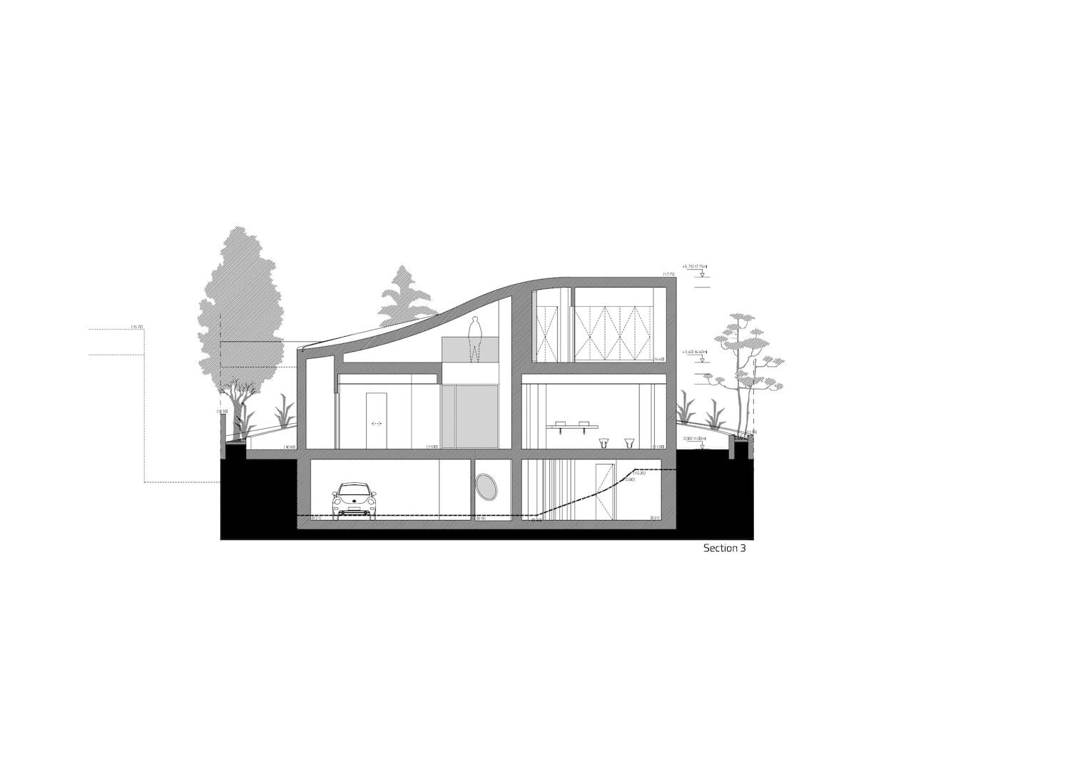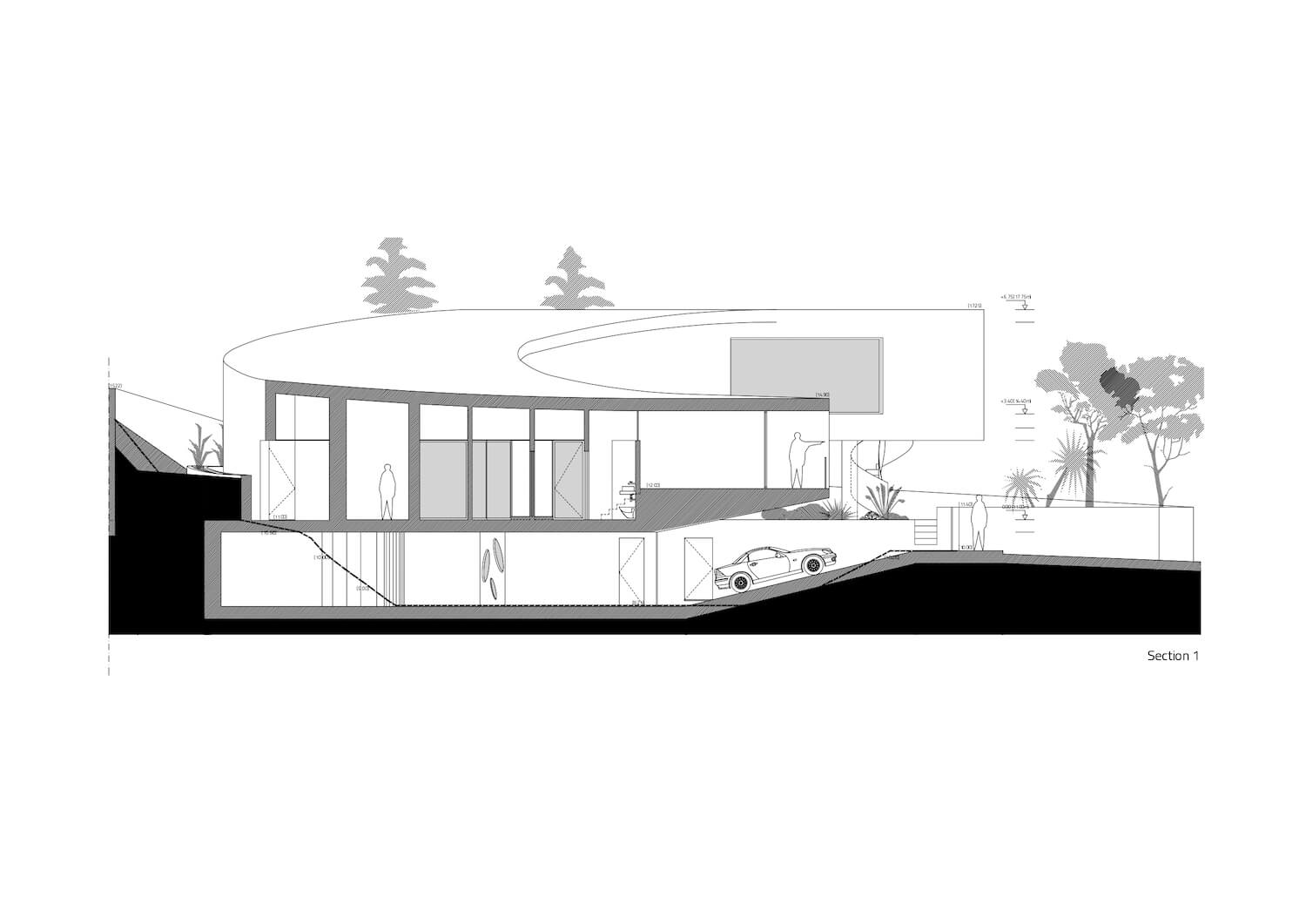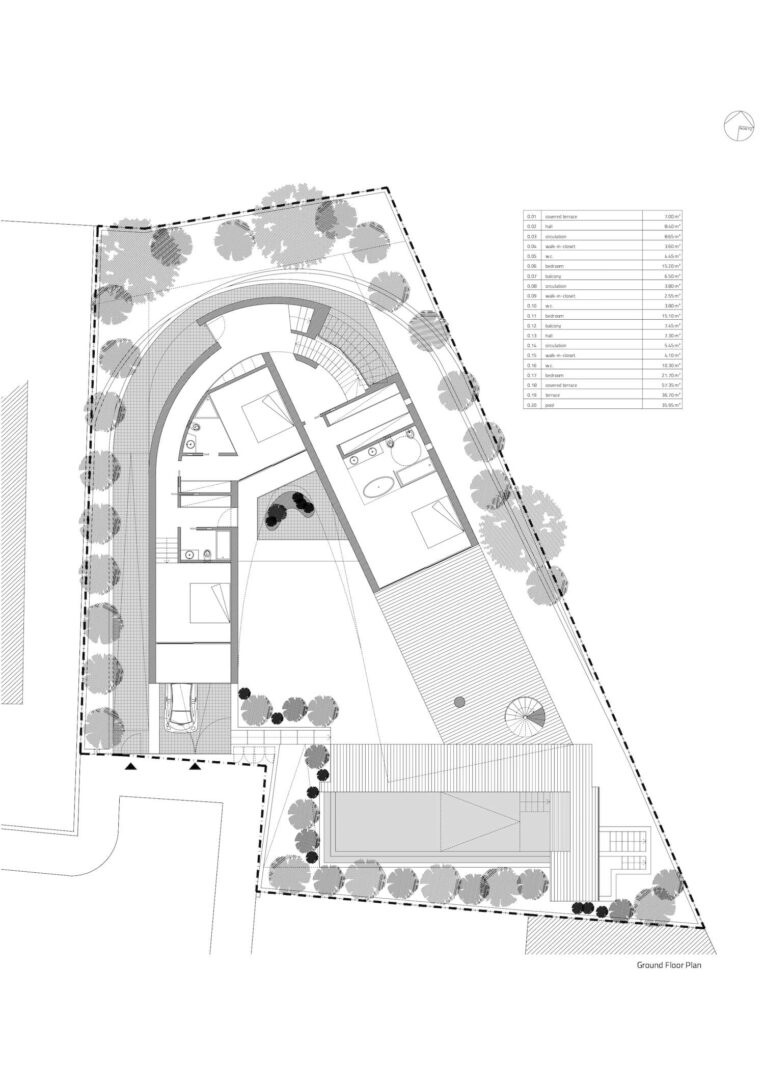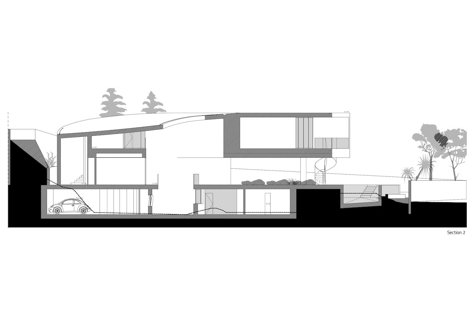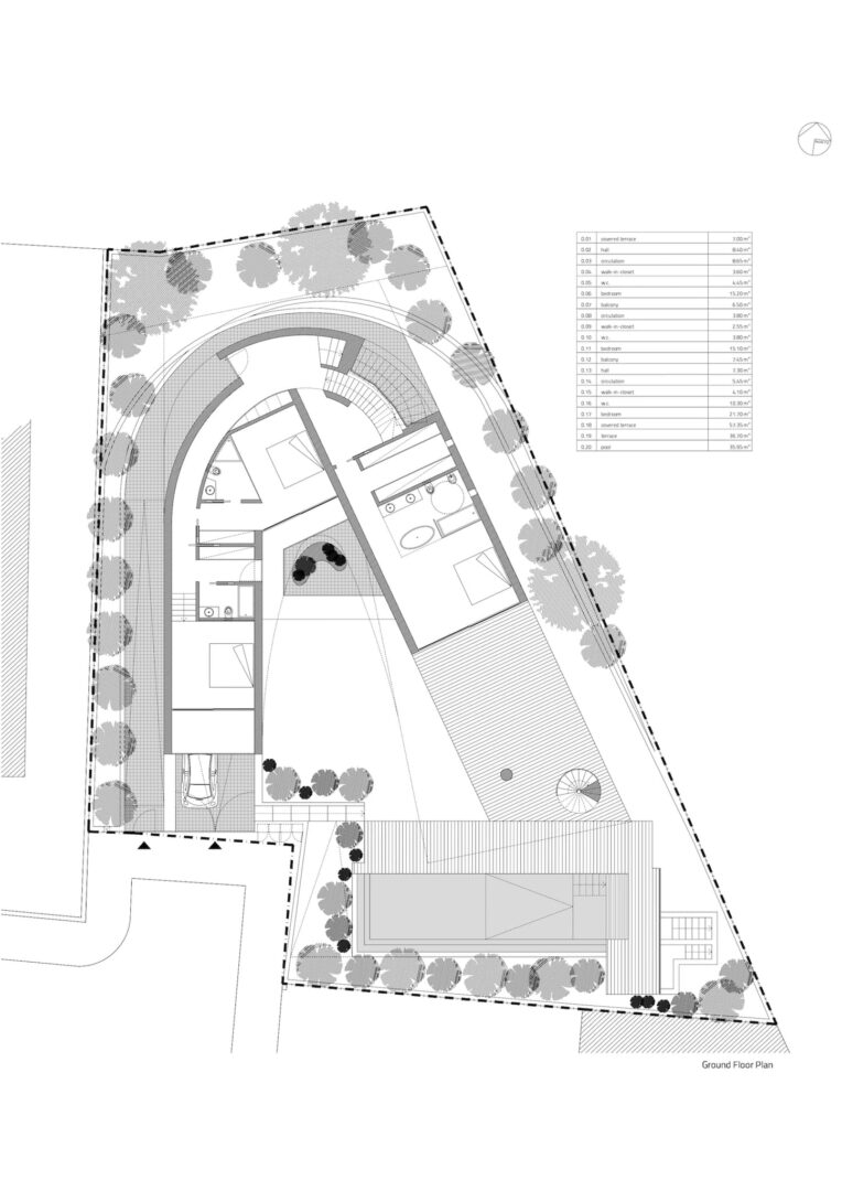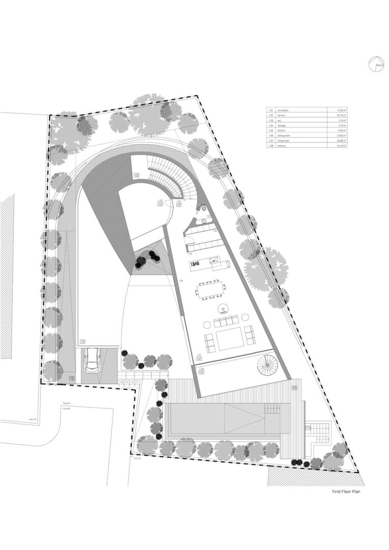 התנועה הזורמת כלפי מעלה, מאפשרת קשר סימביוטי בין נפחים ויוצרת פרטיות בין אזורים פנימיים וחיצוניים. הקומה הראשונה כוללת את האזורים החברתיים של הבית כגון הסלון, חדר האוכל והמטבח. נוצר גרם מדרגות חיצוני המחבר את קומת הקרקע ומספק חיבור קל בין האזורים החברתיים והחיצוניים.