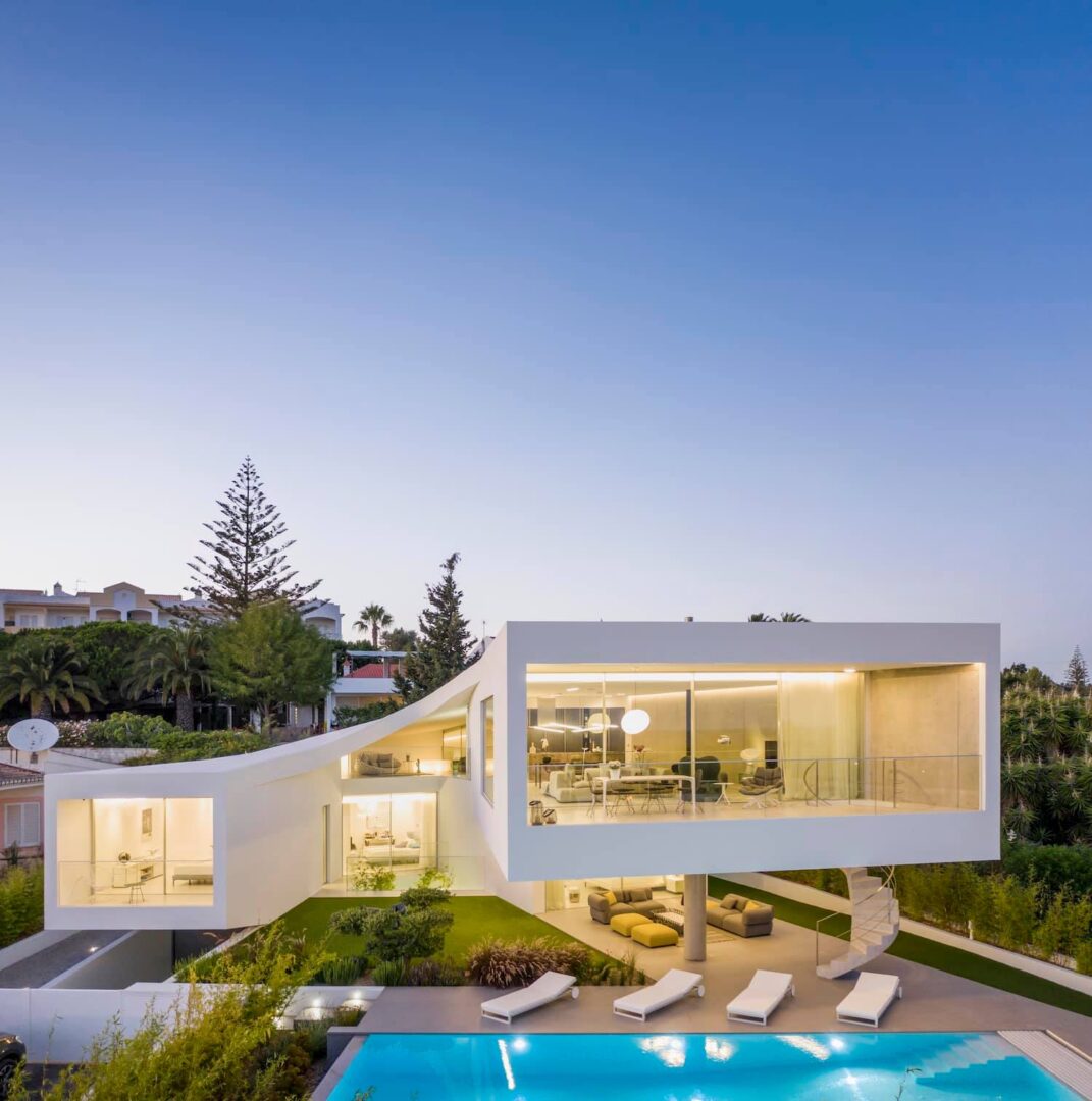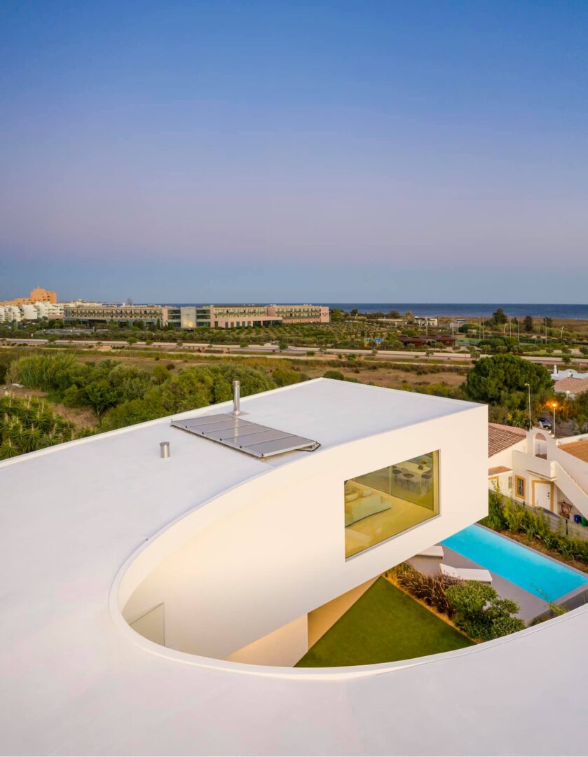 בית המגורים Casa Dorfler, ממוקם במפרץ Meia Praia, Lagos, Portugal - בבניין משותף של מבנים מסורתיים משנות ה-90, אך האדריכלות שלו נועזת ואלגנטית, עם תנועה מעוקלת שהופכת לשני טלסקופים הפונים אל הים, ומדגישה את כל הדרו בנוף העירוני.