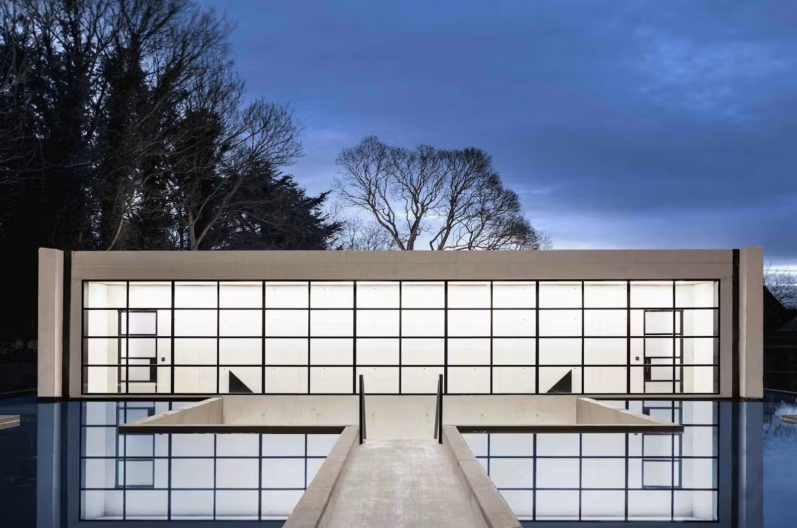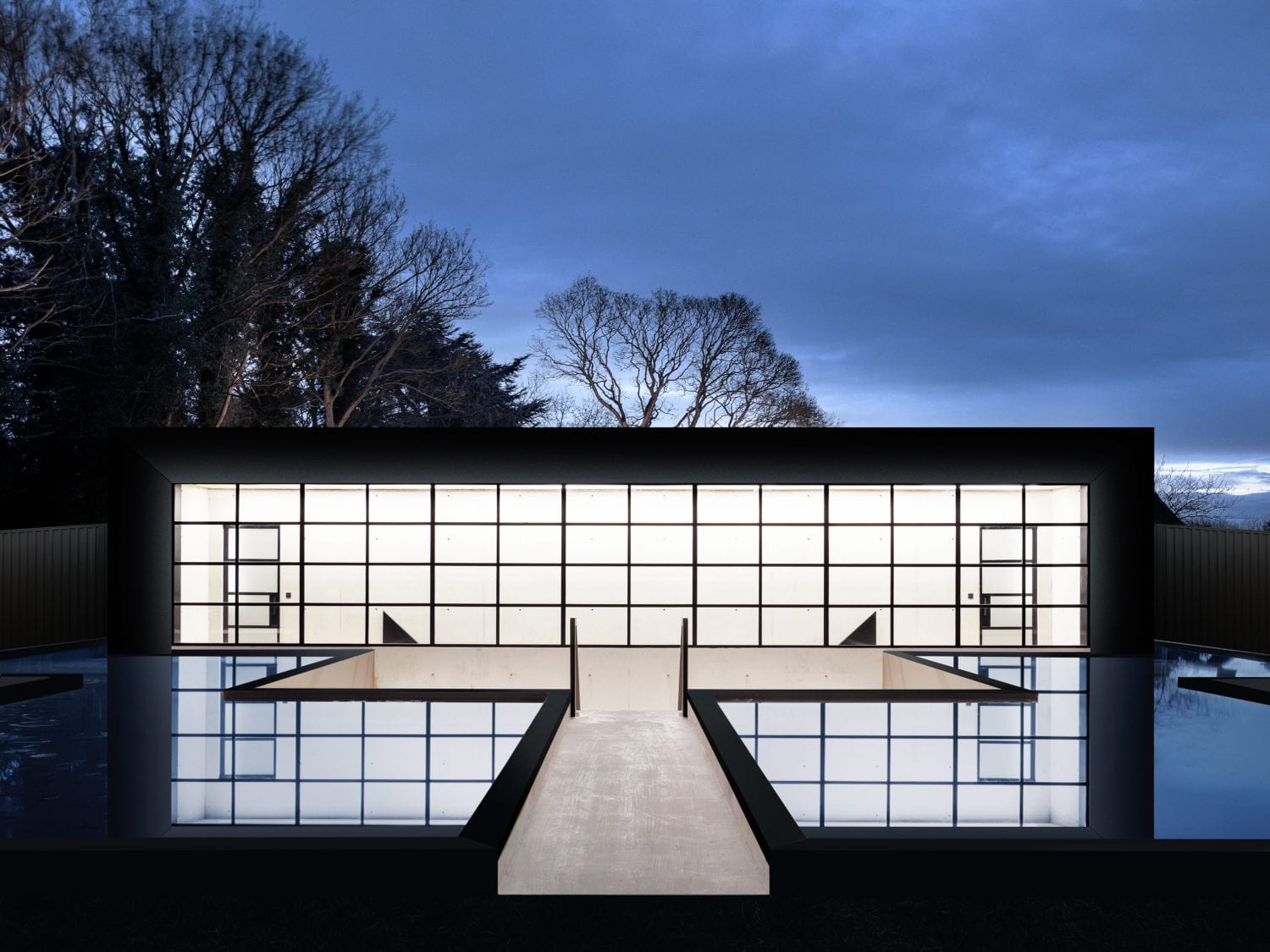 ייחודו של הבית טמון במבנהו החלקי התת־קרקעי: הוא שוכן בתוך גן שקוע של בית כפרי שנהרס, כאשר חלקו העליון מוסתר כמעט לחלוטין באמצעות בריכות השתקפות כהות הממוקמות על גג המפלס התחתון. שביל צר חוצה את המים ומוביל אל גרם מדרגות היורד אל חצר פנימית.