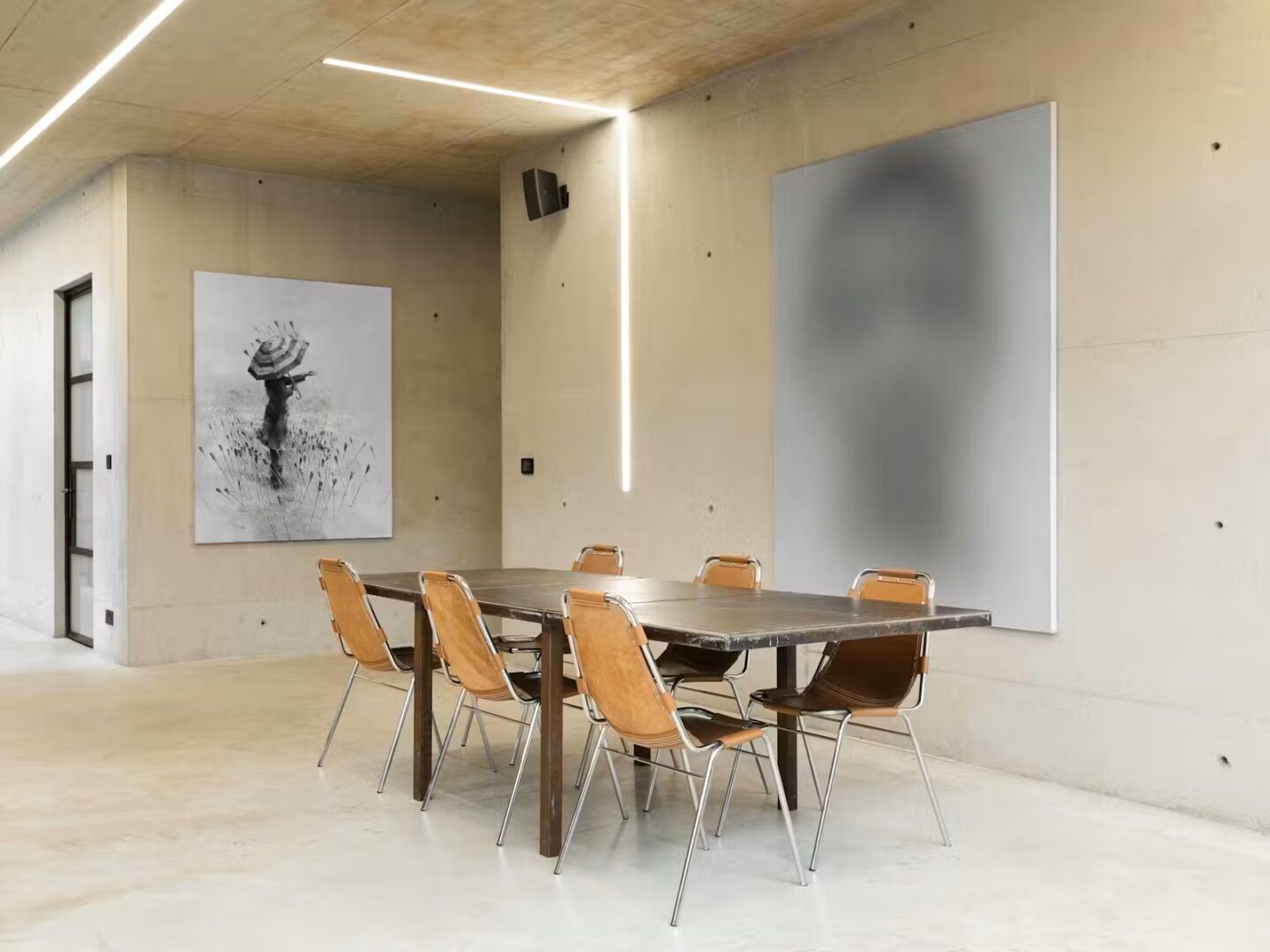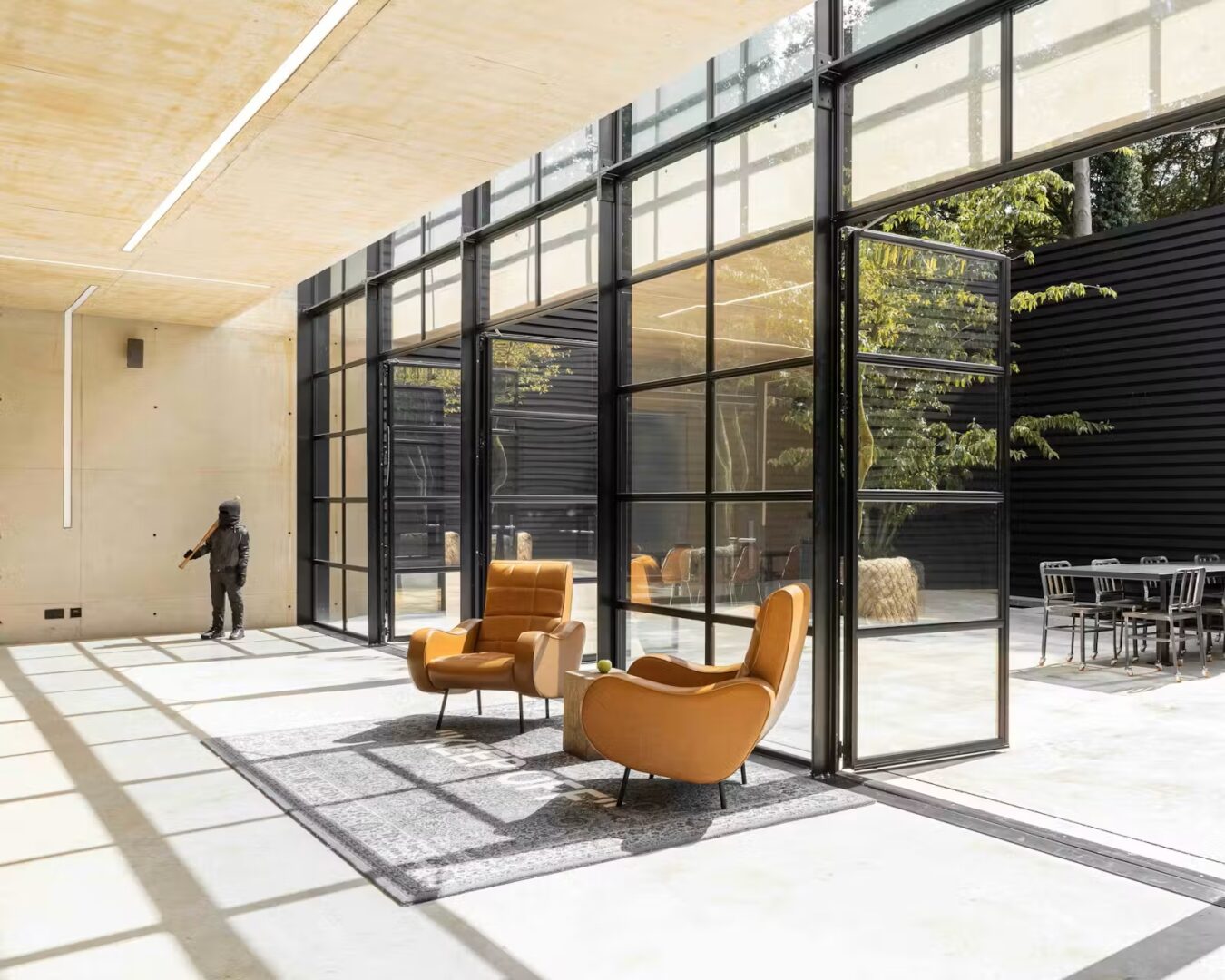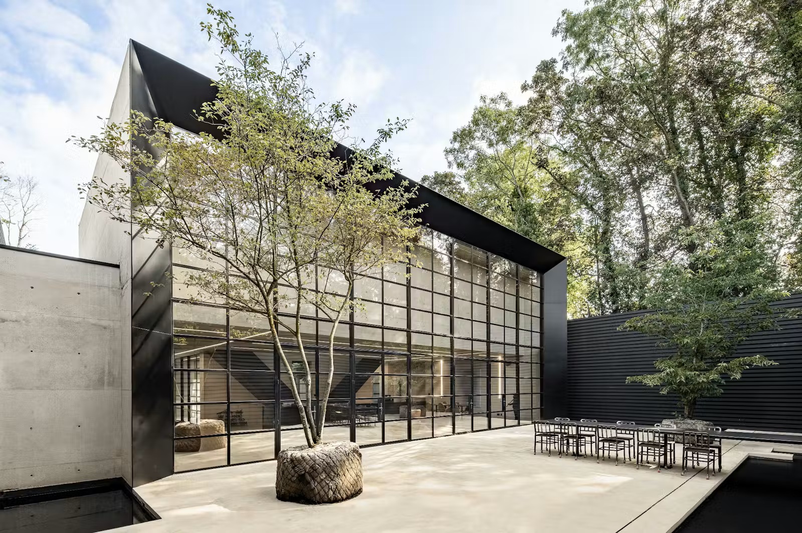 החצר השקועה, המוקפת קירות זכוכית משלושה צדדים, מחזקת את הקשר בין פנים לחוץ, בעוד קירות תמך ובריכות מים עוטפים את המבנה ויוצרים תחושת בידוד ושקט – שממנה נגזר גם שמו, “בית הרפאים”.