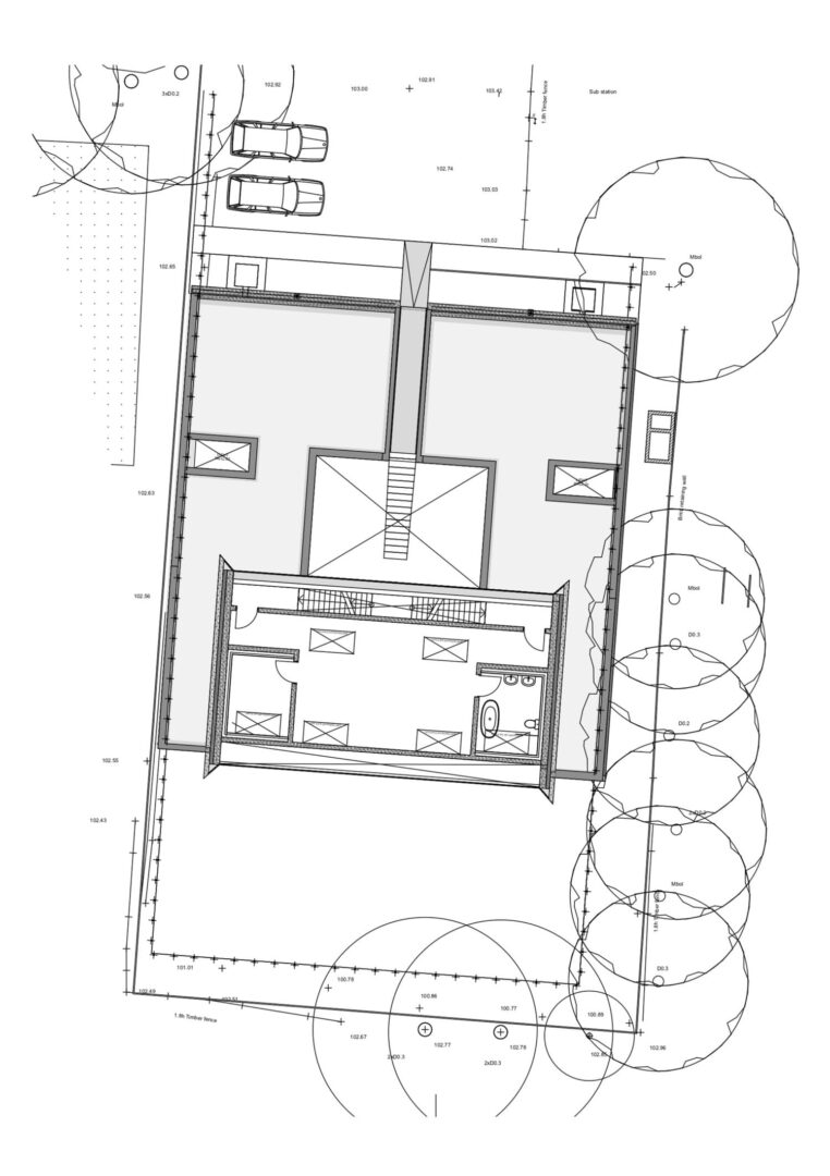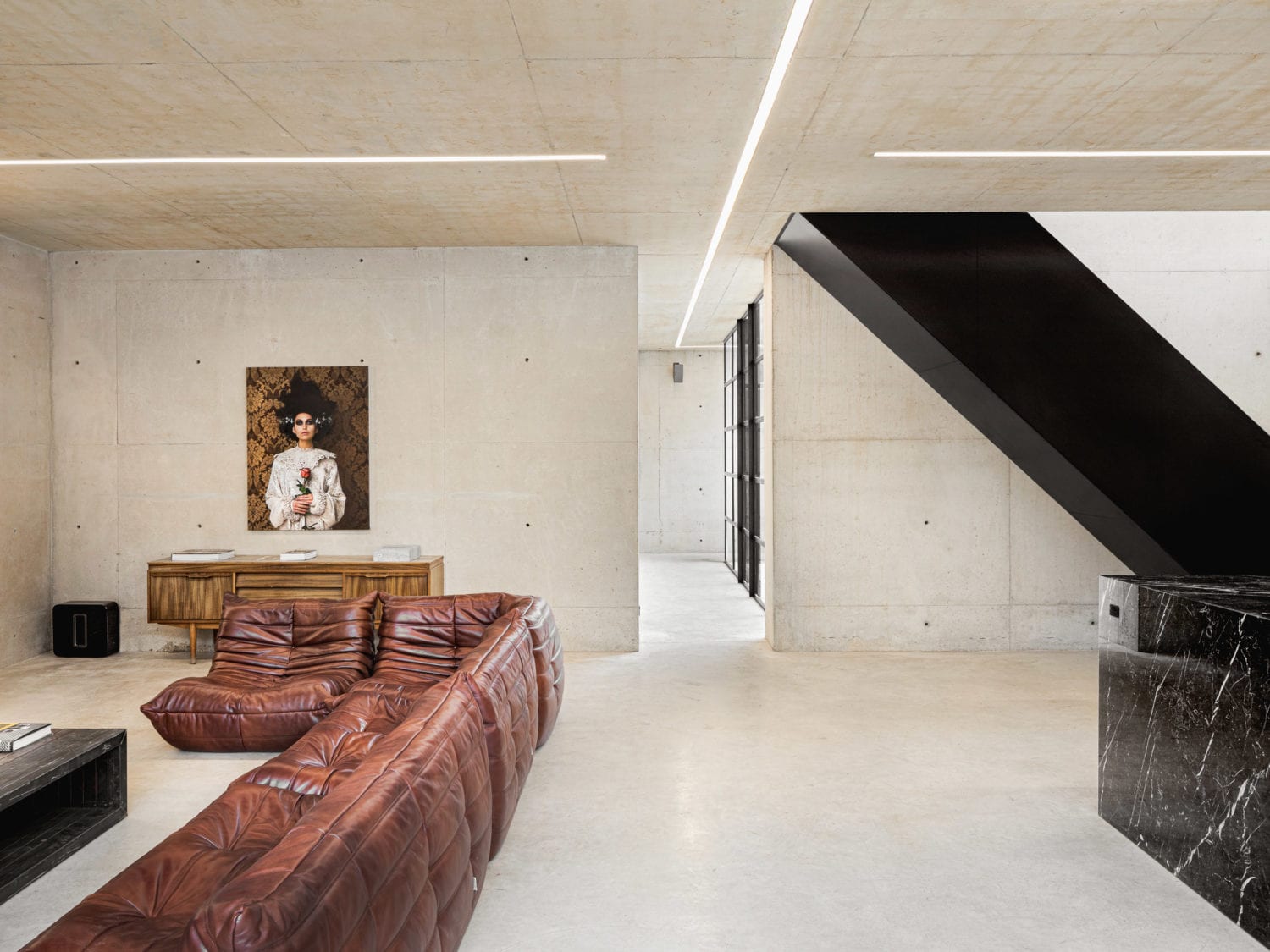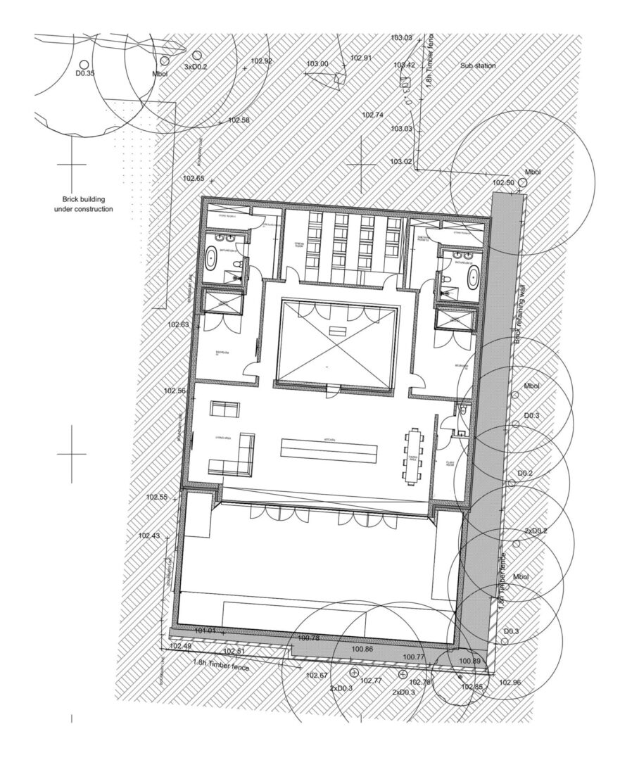 הבית, בהשראת עבודותיו של האדריכל היפני טדאו אנדו, בנוי מבטון יצוק במקום (in-situ) – מהבודדים מסוגו בבריטניה. כל מערכות המבנה – תאורה, שקעים ואף פרטי גמר – שולבו כבר בשלב היציקה, ויוצרים מעטפת אחידה ומונוליתית. למרות המראה הקשיח, בחירת חומרי הגלם מעניקה לחללים תחושת חמימות מפתיעה.