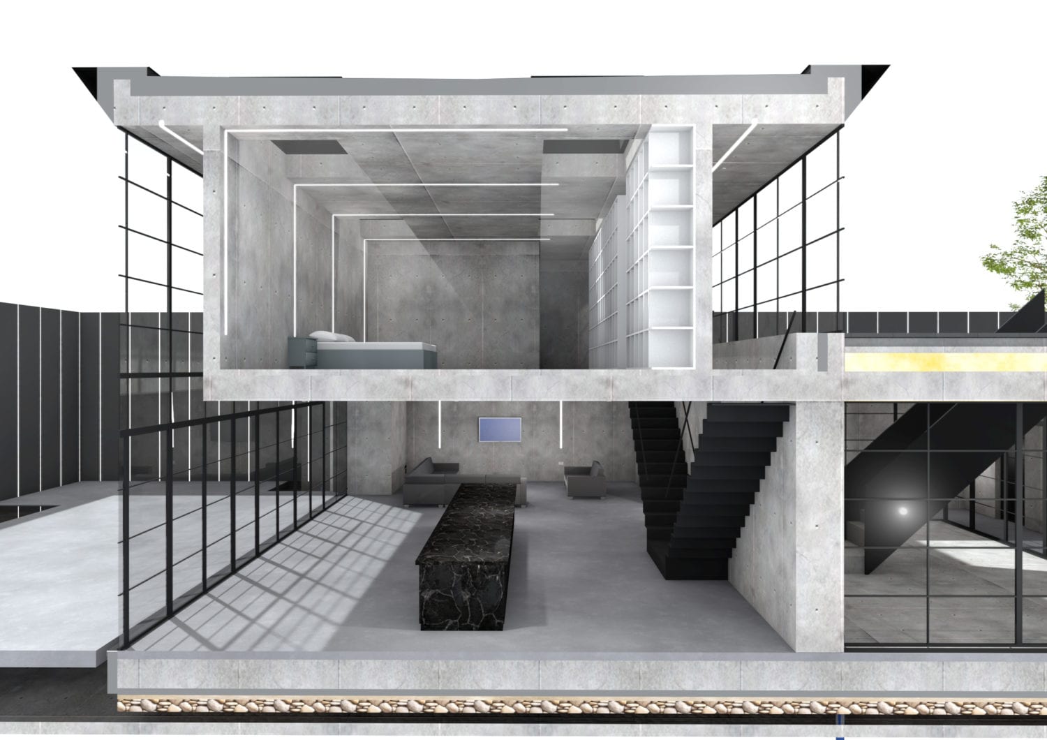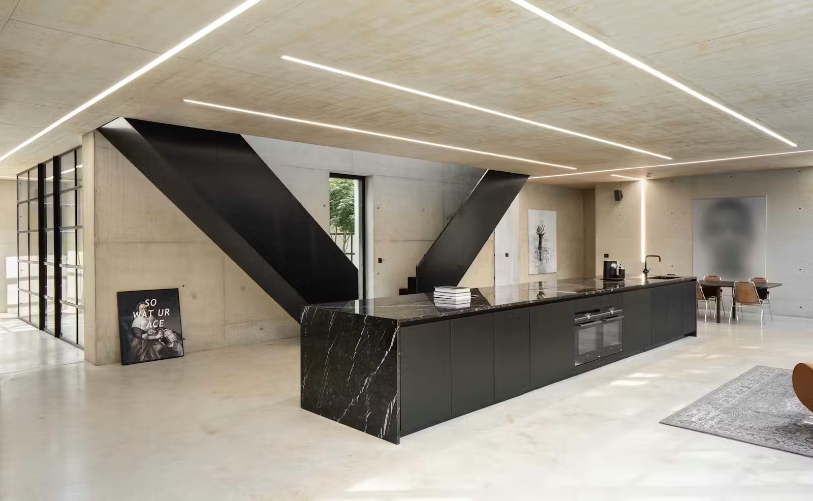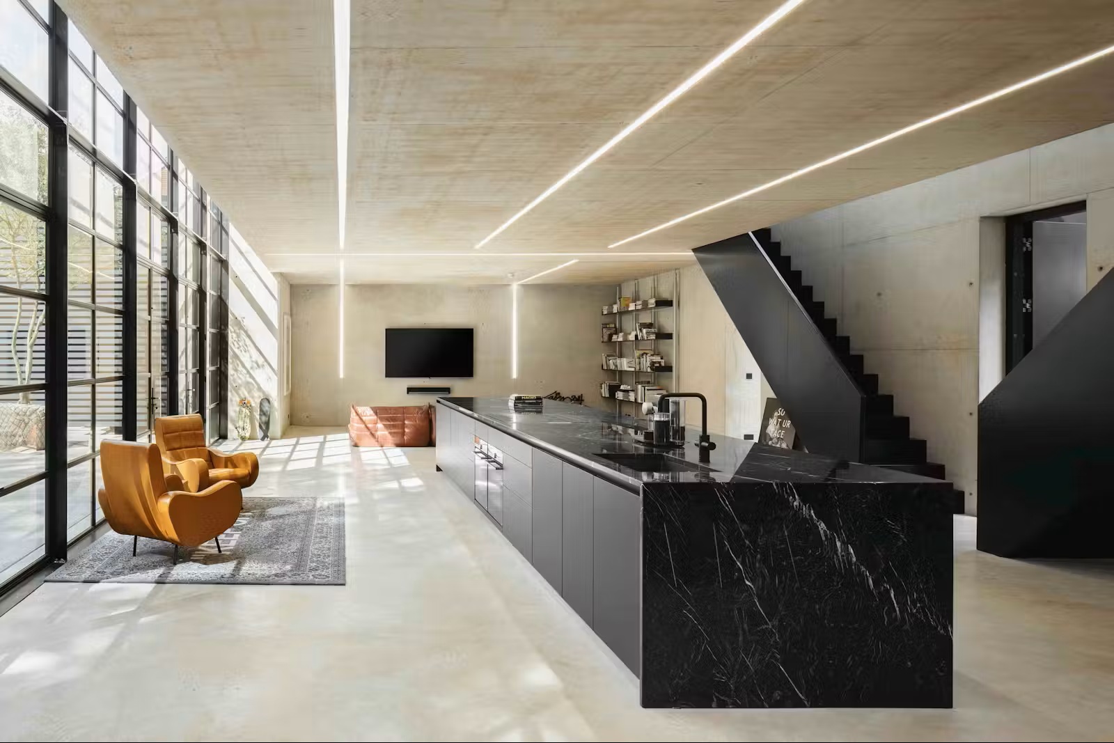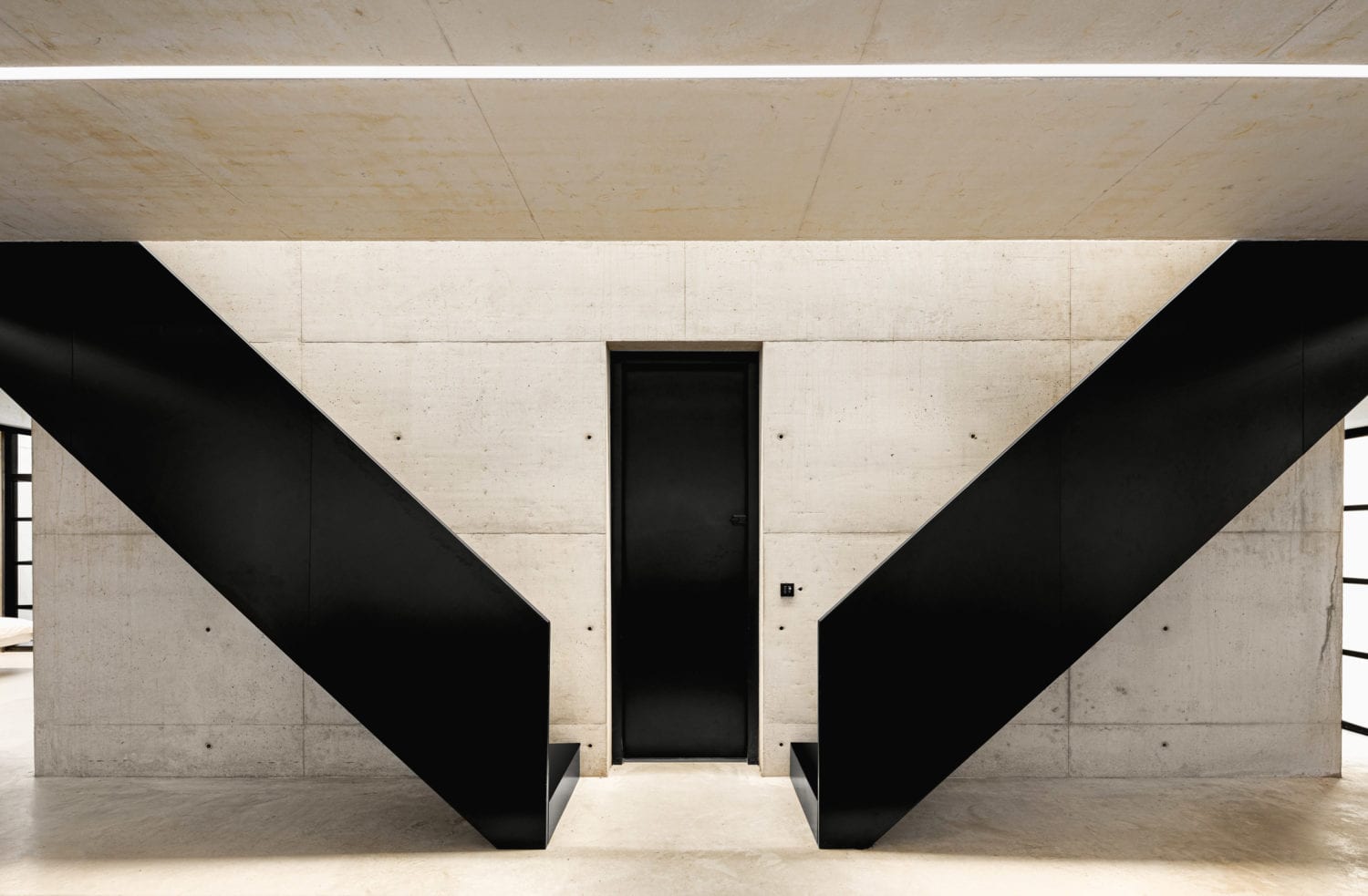 הפנים מאופיין בחללים פתוחים ללא עמודים, קירות זכוכית בגובה כפול המחדירים אור טבעי, ושימוש מדויק בפלדה שחורה מט לצד בטון חשוף. גרמי מדרגות סימטריים מובילים אל אזורי השינה, בעוד שבמרכז הבית חלל מגורים הכולל מטבח אי גדול, פינת אוכל ואזורי ישיבה.
