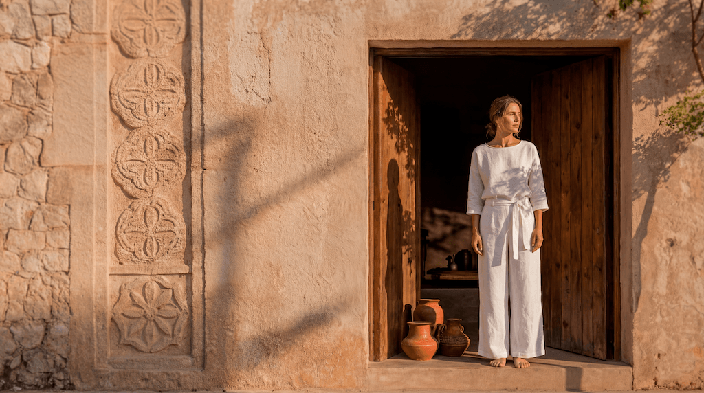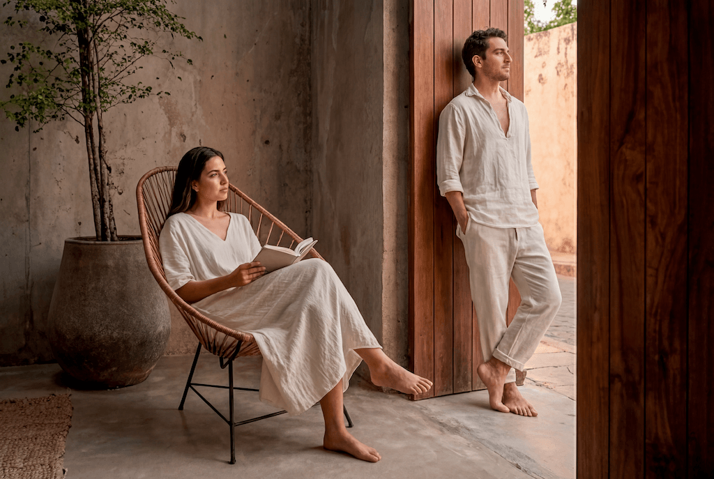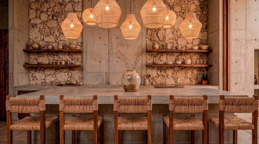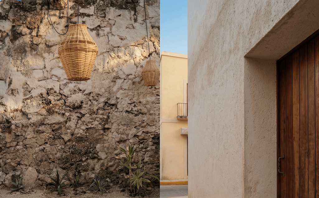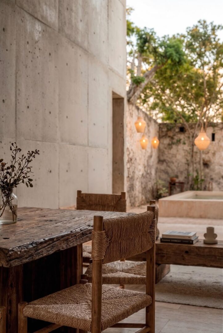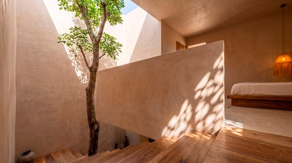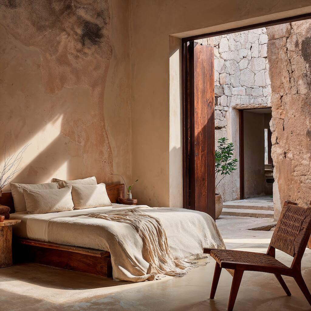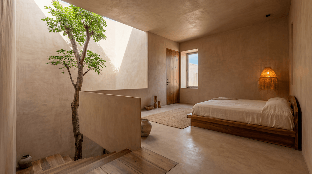 שפת החומרים מצומצמת ומדויקת: קירות מינרליים, אבן חשופה, עץ טבעי וגוונים אדמתיים יוצרים מינימליזם שמבוסס על תחושת חומר ומרקם ולא על קישוטיות. כאן, הפשטות אינה ניתוק מהקשר, אלא אמצעי להדגיש פרופורציות, אור ועומק חושי.