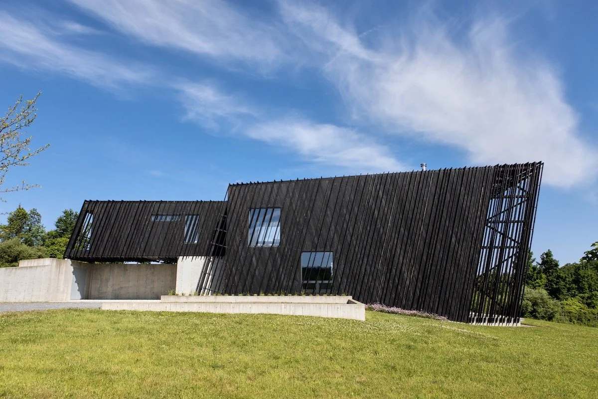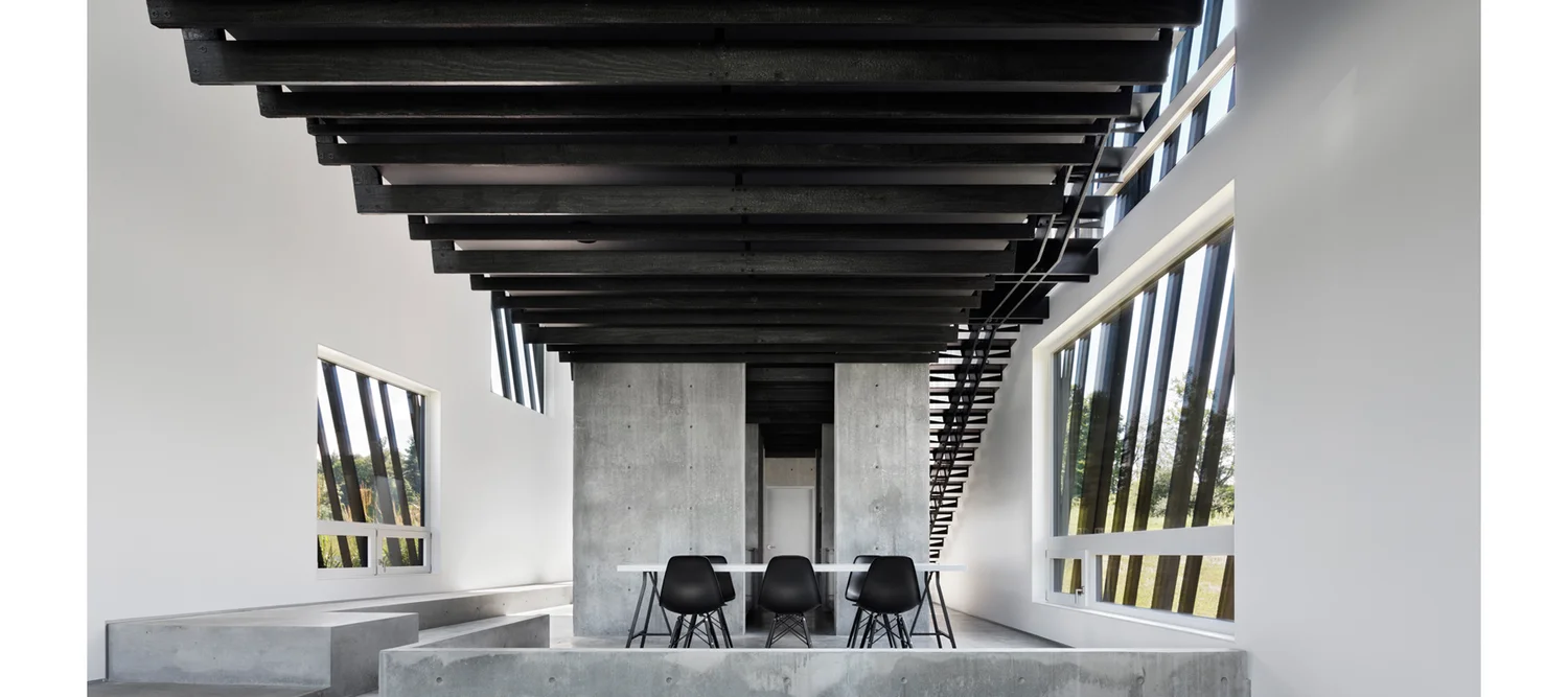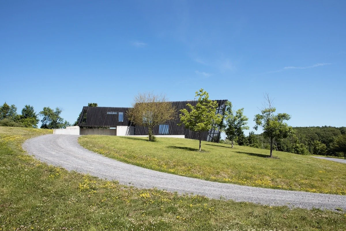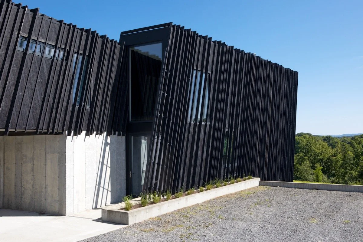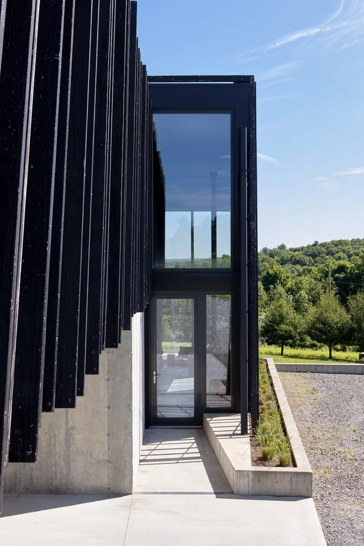 העיצוב שואב השראה ממבנים חקלאיים מסורתיים של האזור – אסמים וממגורות – אך מעניק להם פרשנות מודרנית. חזית הבית מצופה עץ שעבר תהליך חריכה יפני מסורתי, המעניק לו עמידות גבוהה לצד מראה כהה וטקסטורלי.