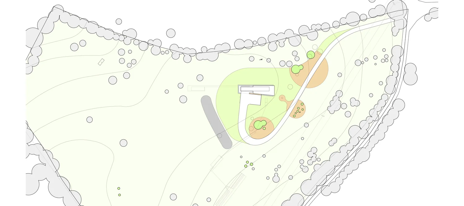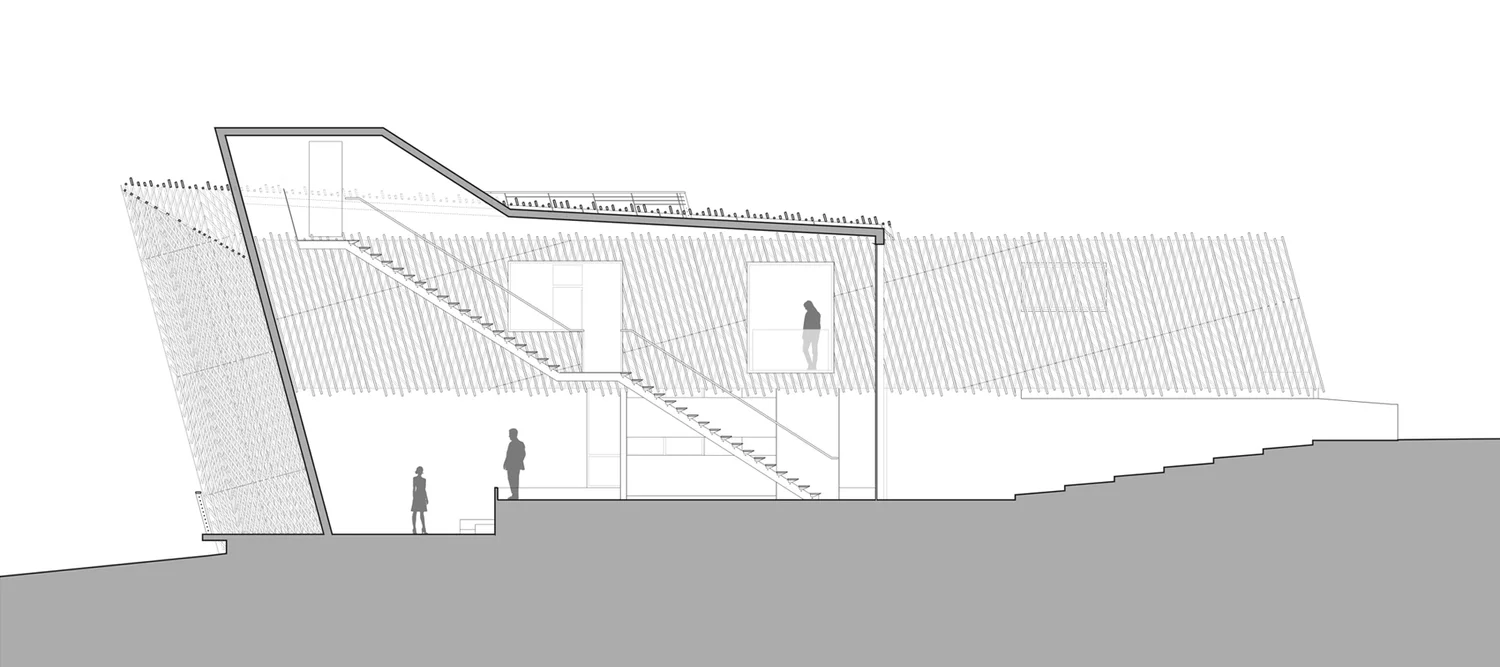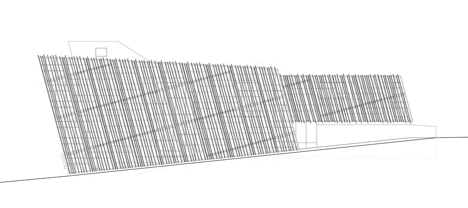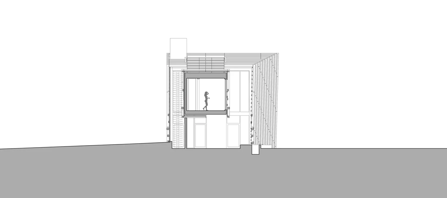 העיצוב שואב השראה ממבנים חקלאיים מסורתיים של האזור – אסמים וממגורות – אך מעניק להם פרשנות מודרנית. חזית הבית מצופה עץ שעבר תהליך חריכה יפני מסורתי, המעניק לו עמידות גבוהה לצד מראה כהה וטקסטורלי.