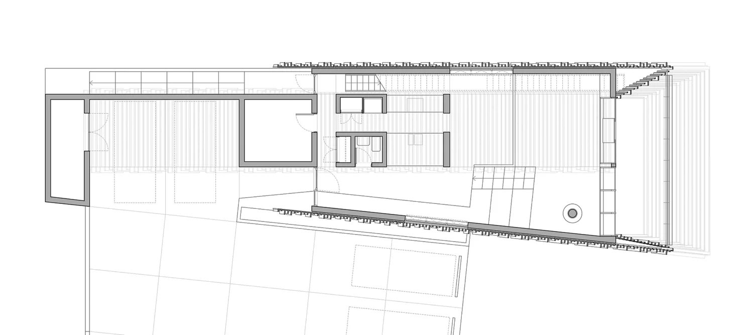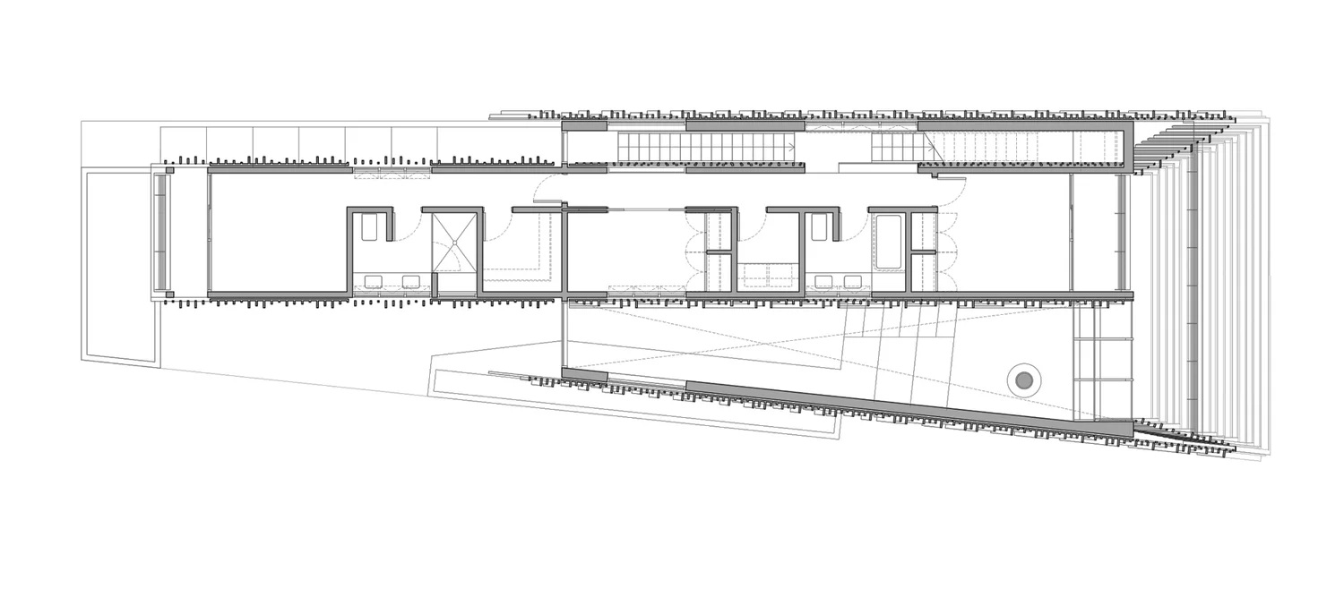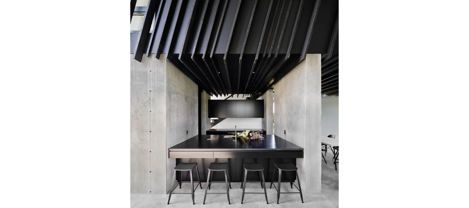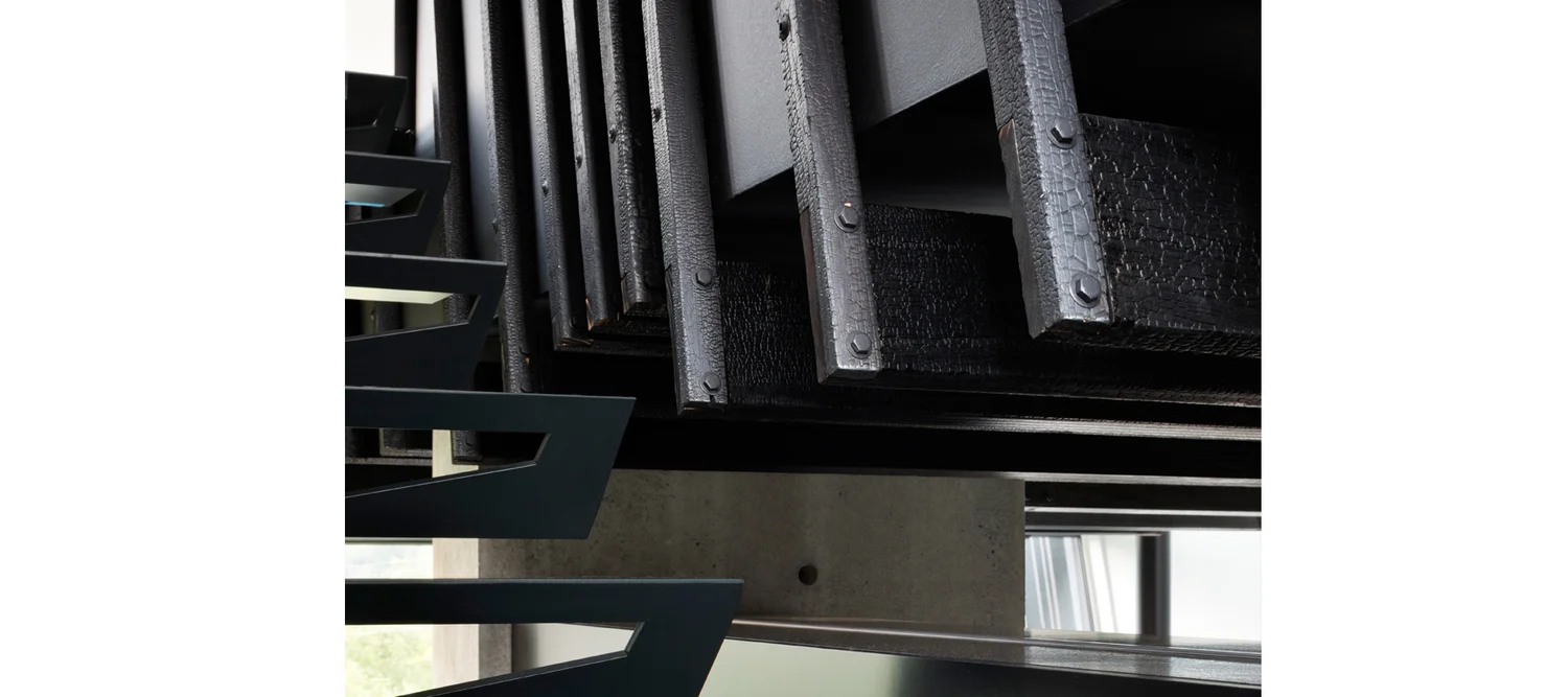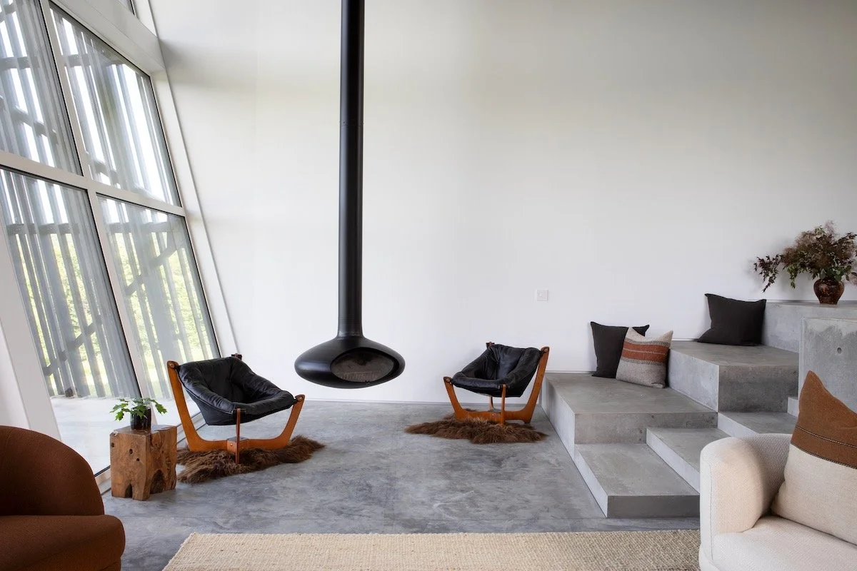 החלל שבין המעטפת החיצונית לפנימית משמש כאזור הציבורי של הבית: חללים רחבי ידיים עם תקרות גבוהות, בטון חשוף ועץ חרוך, סלון דרמטי עם קיר זכוכית משופע ואח תלוי באוויר. זהו אזור שמרגיש פתוח, מרשים ומחובר לנוף שמסביב.