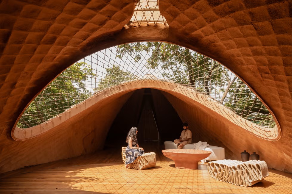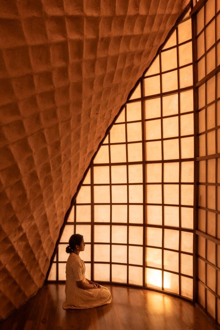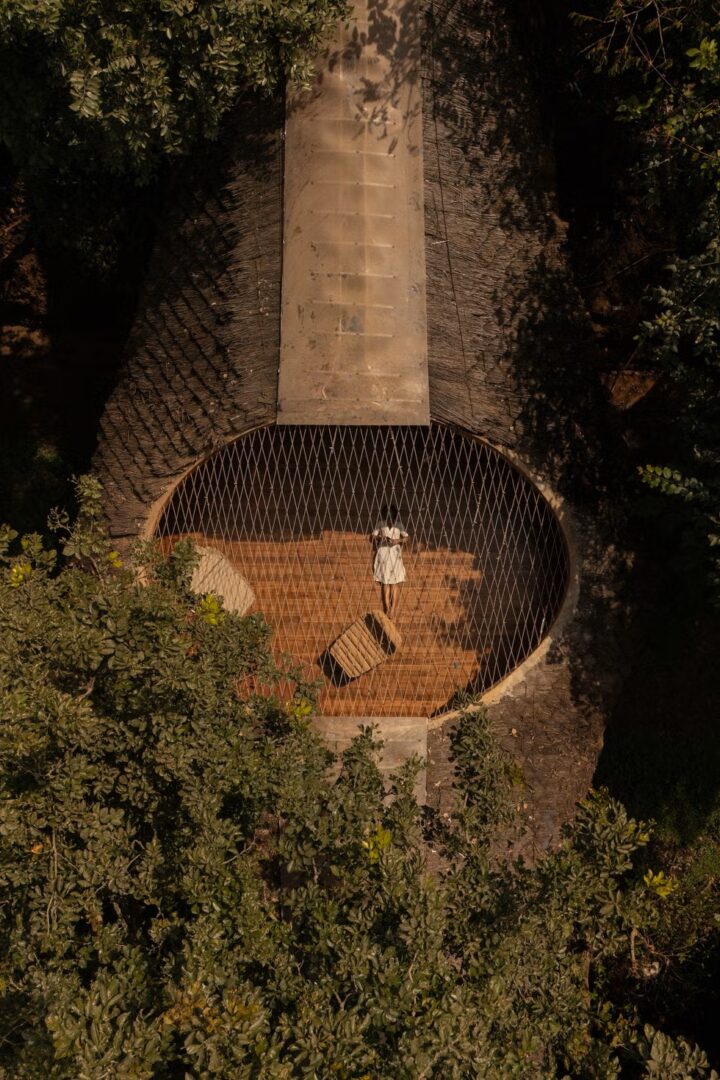 הפנים שומר על אותה היגיון אורגני כמו החוץ, שבו הכל נראה כאילו צמח מהאדמה עצמה, ומשטחי חרס עוטפים את החללים כמו עור שני שנושם, מווסת את הטמפרטורה ומרכך את האור. התקרות המקומרות, בעלות מרקם מחורץ שמדכא צליל ויוצר אווירה מבודדת, ממסגרות את החדרים השונים באיכות כמעט פיסולית. הרהיטים, העשויים גם הם מחומרים טבעיים ומקומיים, מרחיבים את תחושת ההמשכיות הזו, עם שולחנות עץ מלא וקווים מעוגלים, כיסאות ארוגים מסיבי צמחים ופריטים עשויים חבל קלוע. הפריסה זורמת בצורה חלקה, ללא קירות נוקשים, ומחברת את אזורי השינה עם חללי ההתכנסות דרך מעברים המשמשים כמסננים חזותיים. סריג יוטה ומבני עץ קלים מחליפים קירות קונבנציונליים, מסננים אור ומאפשרים אוורור צולב. חדרי השינה, חדר האמבטיה והאזורים המשותפים חולקים את אותה אווירה של התבוננות פנימית, שבה הגבול בין פנים לחוץ מתמוסס. בחדר השינה הראשי, אמבטיה עומדת משולבת בחלל כיצירה פיסולית נוספת, בעוד פאנלים שקופים מסננים את אור היום בגוון ענברי.