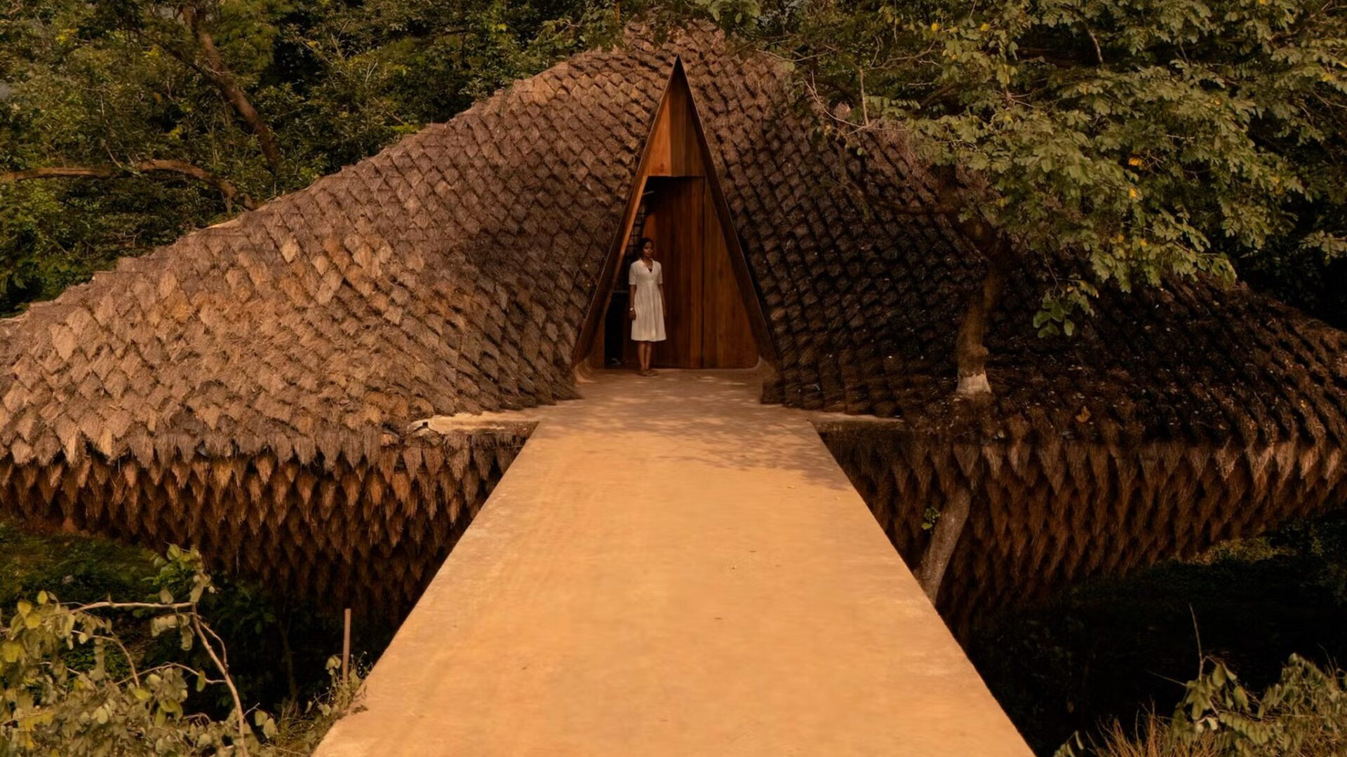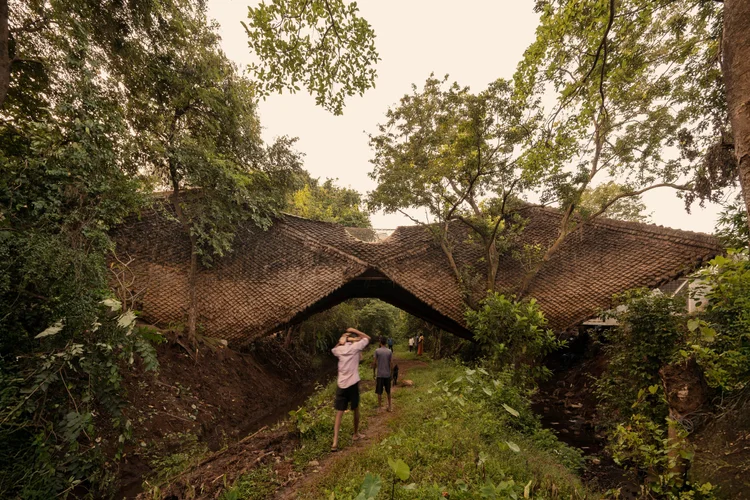 האתגר היה עצום. הקרקע שעליה סטודיו Wallmakers היה צריך לבנות את הבית הזה נחצתה על ידי תעלת מים, שיצרה קניון בעומק שבעה מטרים. "הרעיון לבית הגשר צץ בתוך המגבלות הללו: גשר תלוי באורך 30 מטר המורכב מארבע פרבולות היפרבוליות, הבנויות עם מינימום של צינורות פלדה וגידים המספקים חוזק מתיחה, ומרוכב קש ובוץ המספק חוזק דחיסה", מסבירים בסטודיו, ומתארים כיצד ניגשו לפרויקט. הגשר, השוכן בין עצי הערוץ הרבים, נראה כאילו הוא מרחף, משתלב בצורה חלקה עם הצמחייה הצפופה. גג הקש, בהשראת קשקשי הפנגולין, מספק בידוד תרמי וקירור יעיל, ומאפשר מבנה קל משקל בקנה מידה גדול עם ארבעה יסודות בלבד, ובכך ממזער את השפעתו על הקרקע. "שכבת טיח הבוץ מונעת ממכרסמים או מזיקים אחרים להתחפר בתוך הבית (הסיבה העיקרית לכך שגגות קש יצאו מהאופנה) ומספקת חוזק דחיסה, ומייצרת עוד יותר את המבנה על ידי ביטול עמודי תמיכה אנכיים. הבניין הופך בכך למערכת אקולוגית חיה, שבה בני אדם חיים ללא הפרעה בפנים והטבע מוצא את מקומו בחוץ."
