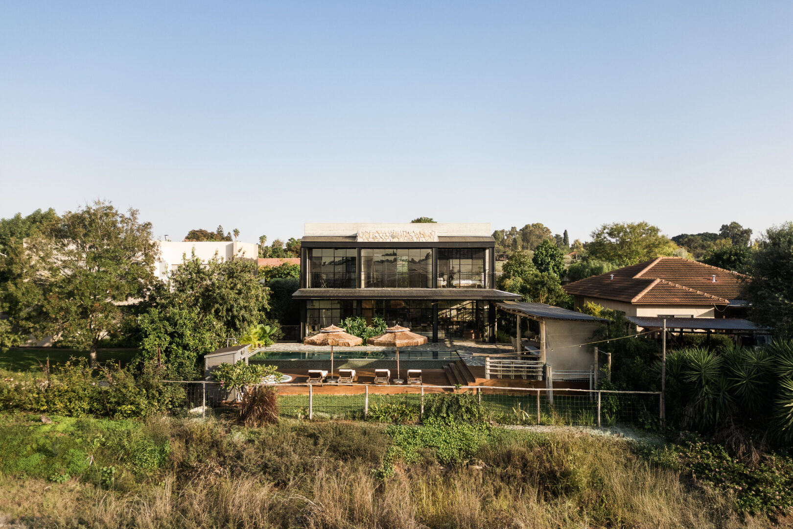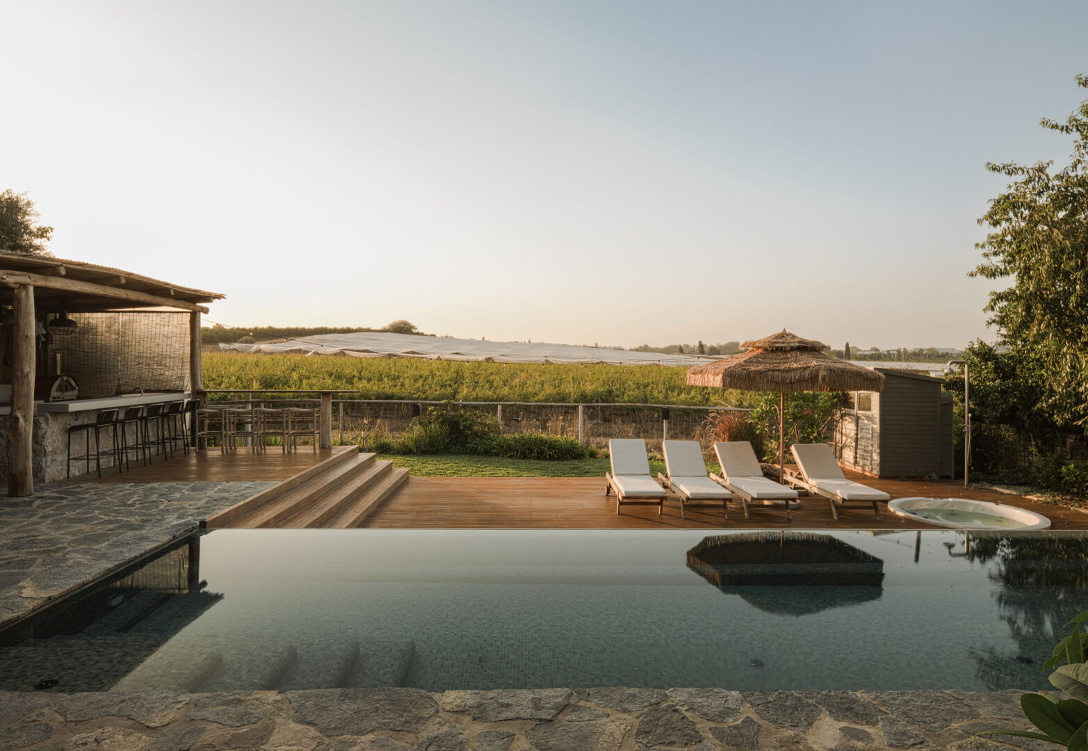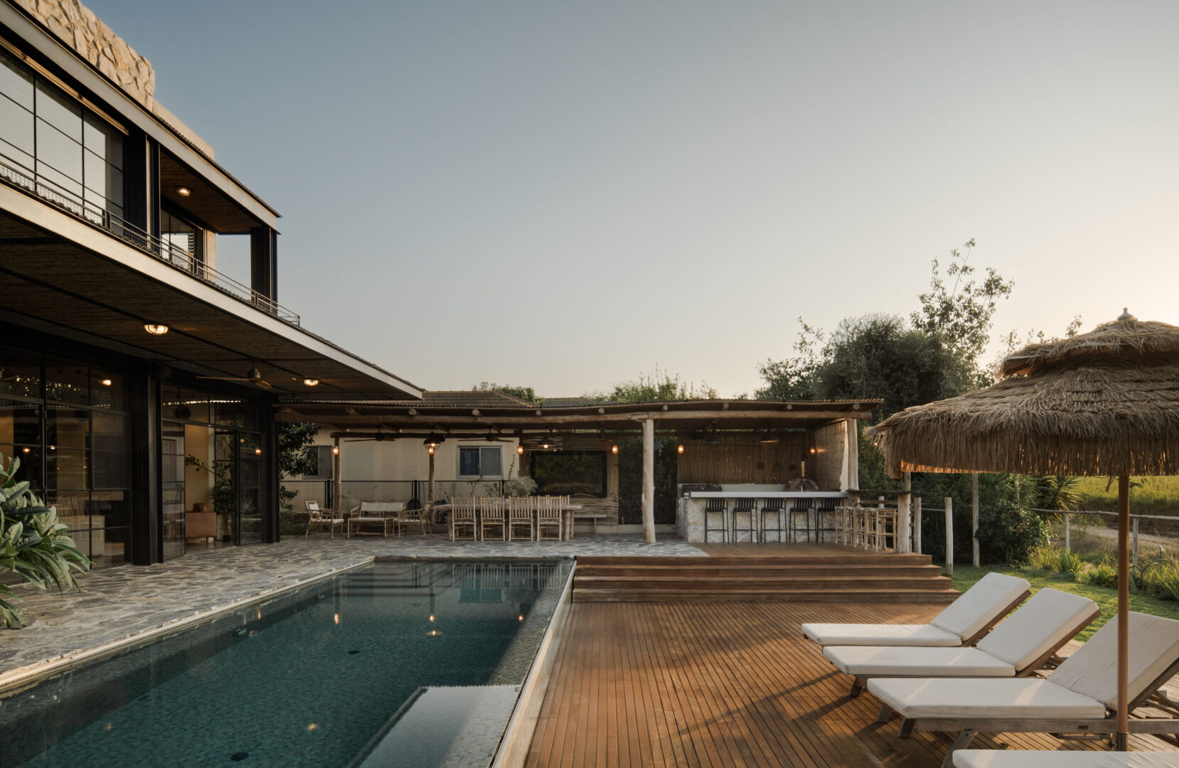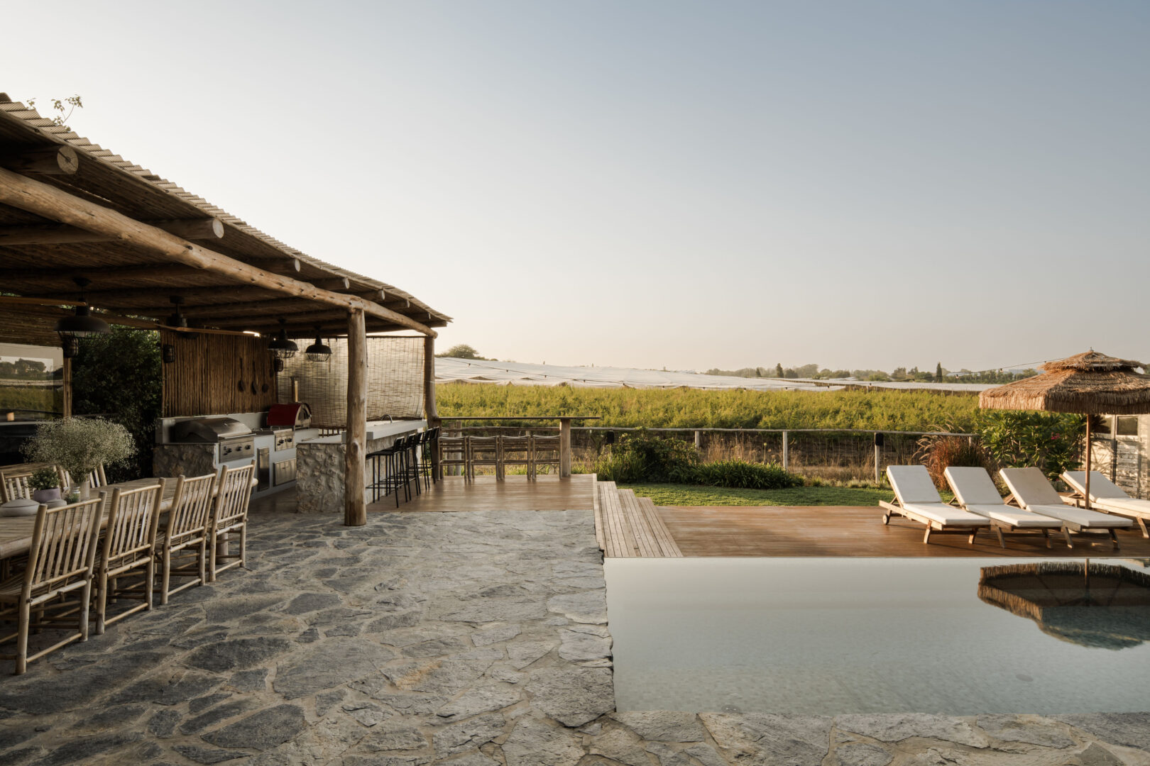 הפרגולה עשויה סנדות עץ טבעיות, ומתחתיה מטבח חוץ, פינת אוכל ואזור ישיבה – כולם פונים לשדה ולבריכה, מבלי להסתיר את הנוף מהבית.
