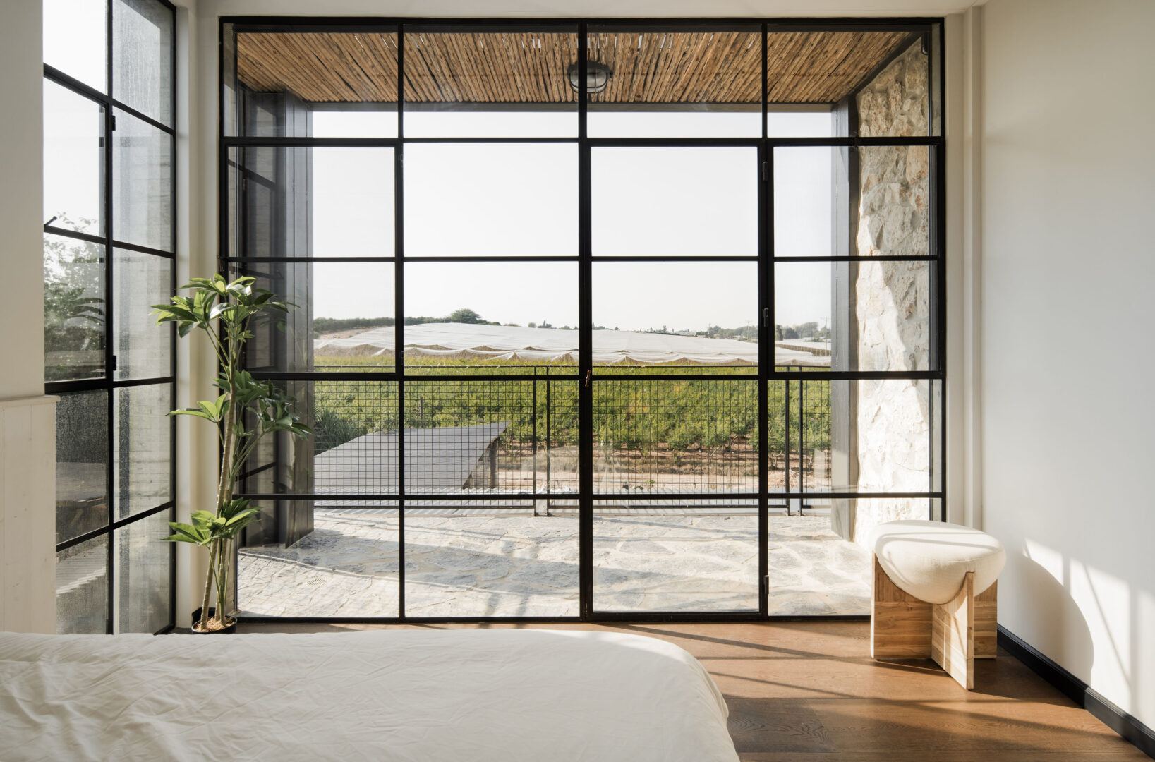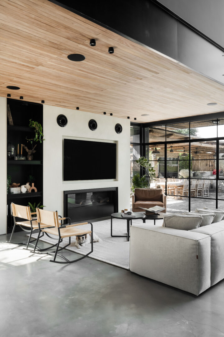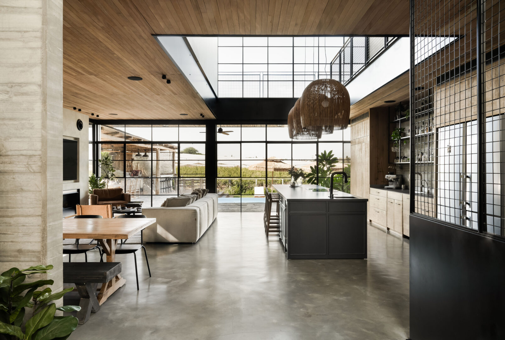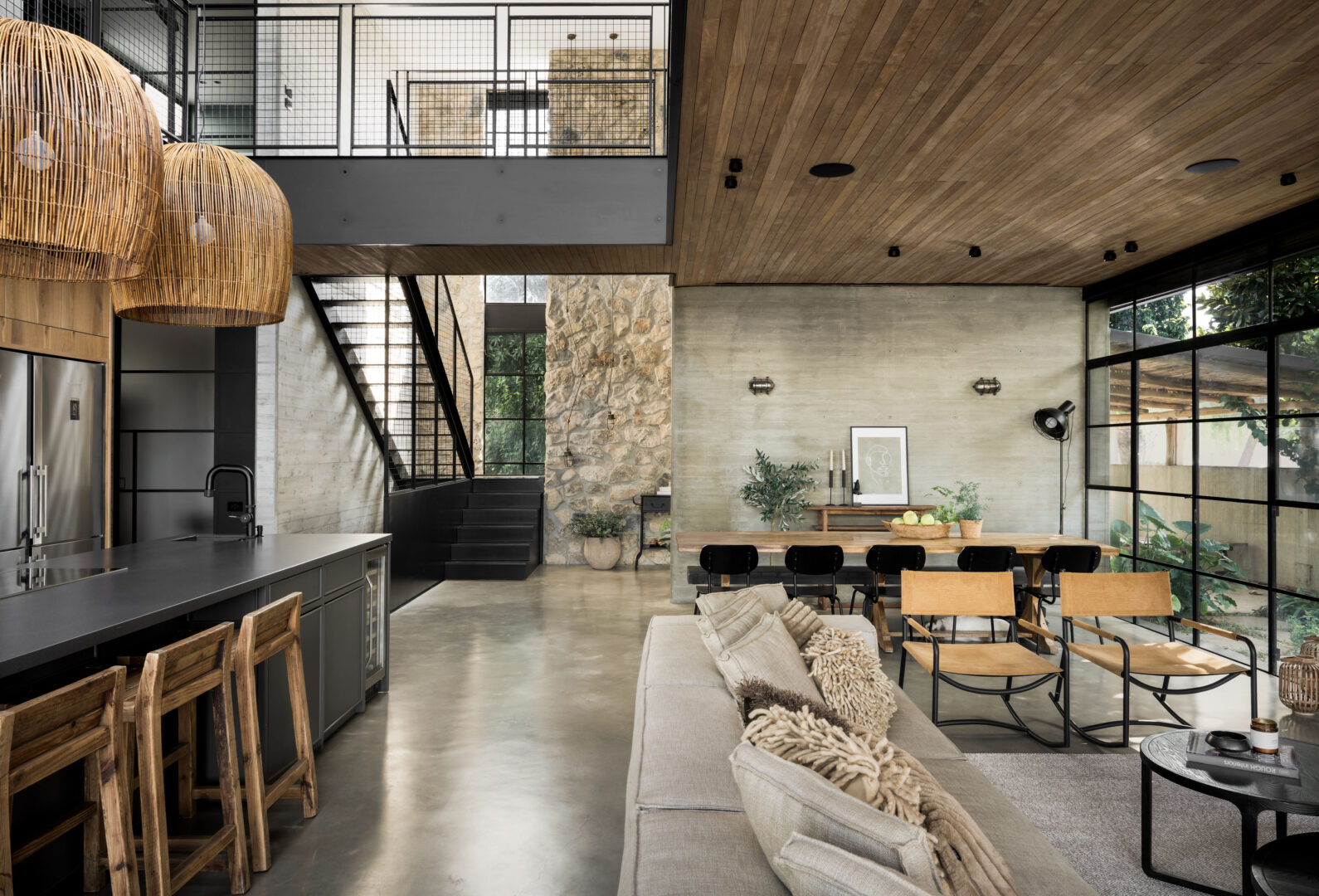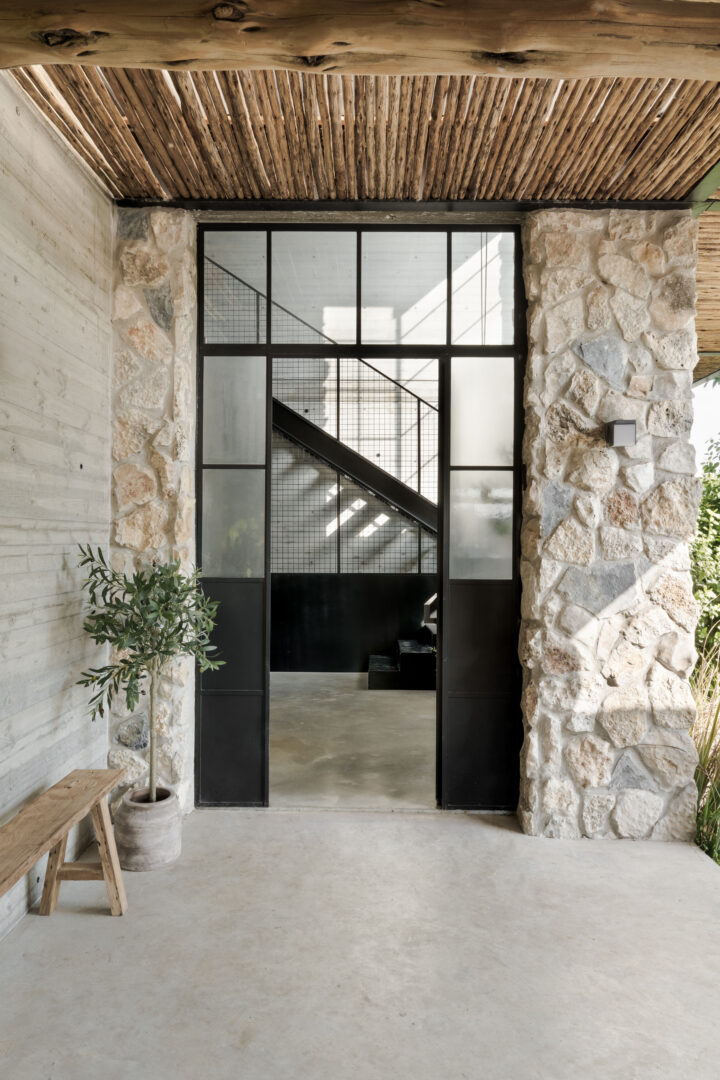 התקרה, גם היא מעץ סחף, נועדה להבליט את נימי העץ ואת המרקם הלא־מושלם, כחלק בלתי נפרד מהאופי. מסגרות ברזל שחורות מגדירות את החללים, והבית כולו מרגיש כמו סדרה של קוביות חומר, שבתוכן האבן, העץ והזכוכית חיים יחד.