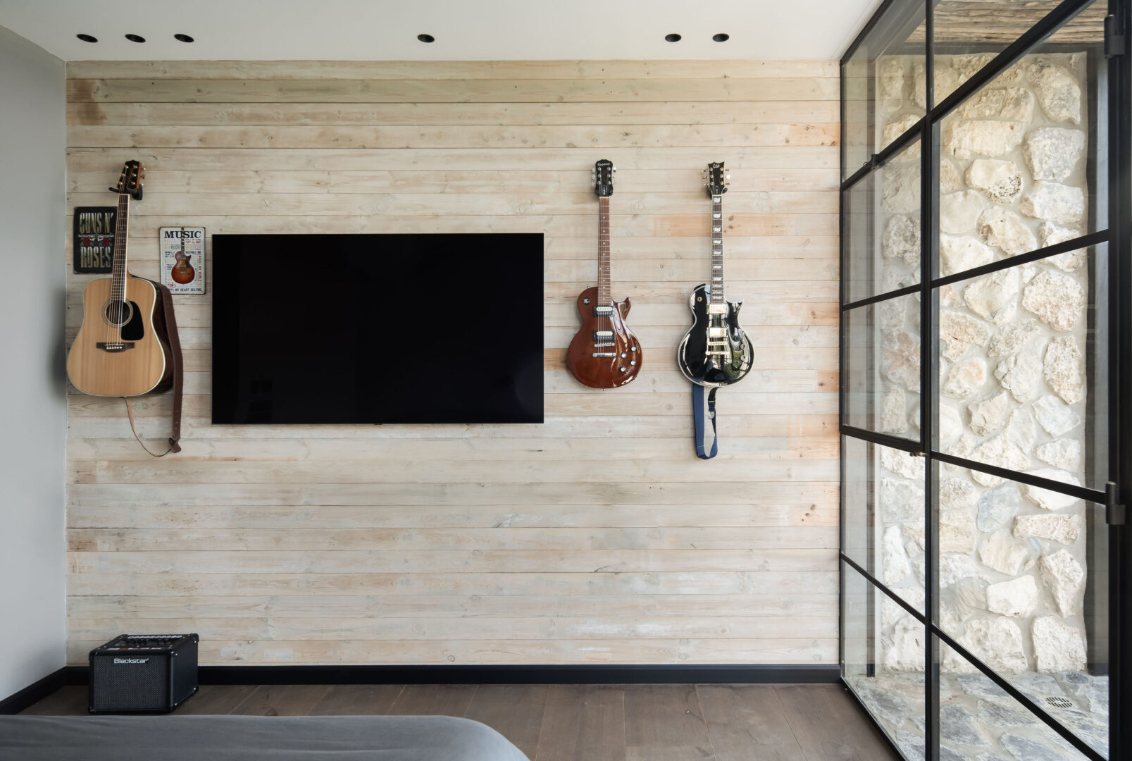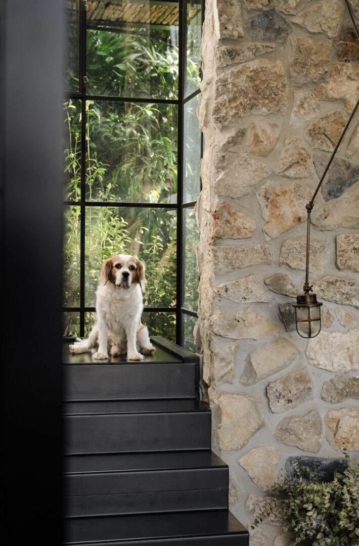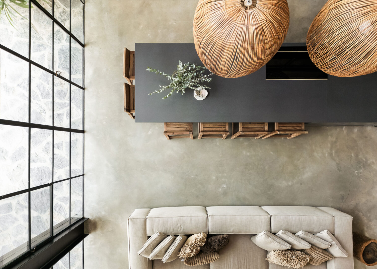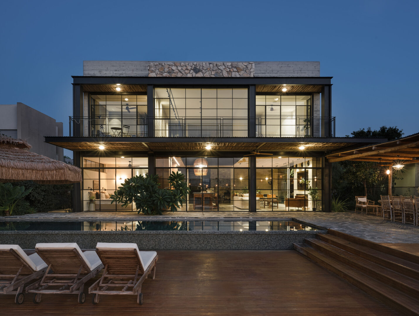 התקרה, גם היא מעץ סחף, נועדה להבליט את נימי העץ ואת המרקם הלא־מושלם, כחלק בלתי נפרד מהאופי. מסגרות ברזל שחורות מגדירות את החללים, והבית כולו מרגיש כמו סדרה של קוביות חומר, שבתוכן האבן, העץ והזכוכית חיים יחד.