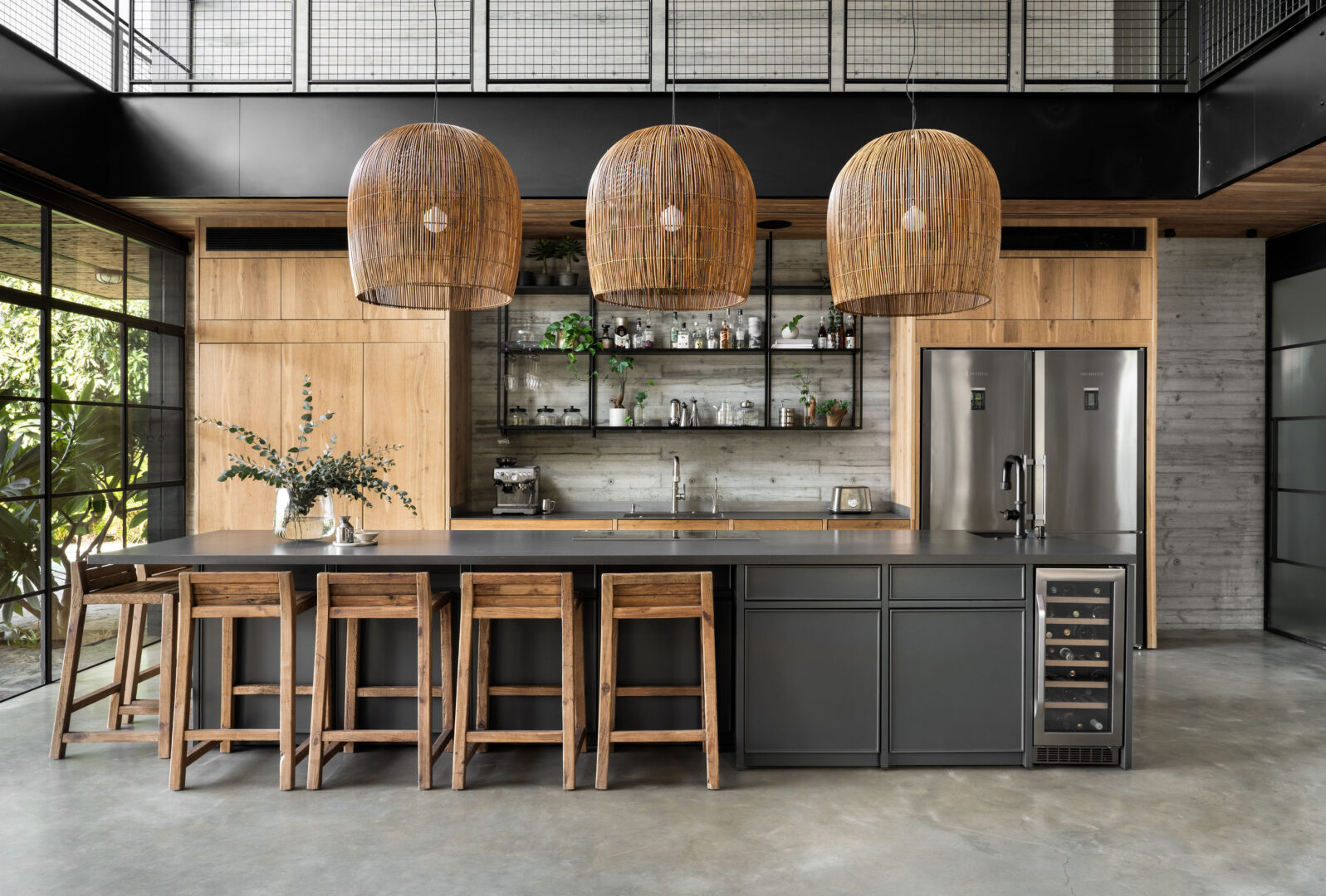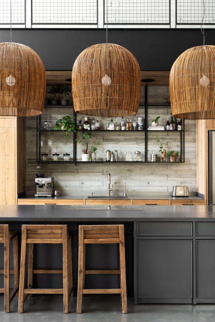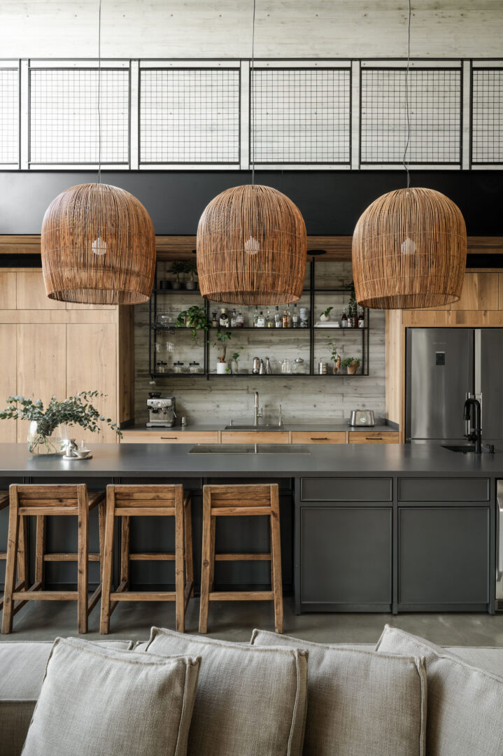 המטבח כולו עשוי עץ, במכוון, כדי לאזן ולחמם את הבטון. פלאנקים, רצועות עץ בתקרה ועץ שעבר תהליך יישון המדמה עץ סחף – כולם יוצרים תחושת טבע ואותנטיות. האי נצבע בגוון עמוק שמכניס אופי, ובתוכו שולבו אלמנטים אירופיים, כמעט קלאסיים. הניגוד בין התעשייתי לקלאסי, יחד עם גופי התאורה מבמבוק שממוקמים על האי, מייצר שכבות של טקסטורות וסגנונות שחיות יחד בהרמוניה לא מתאמצת.
