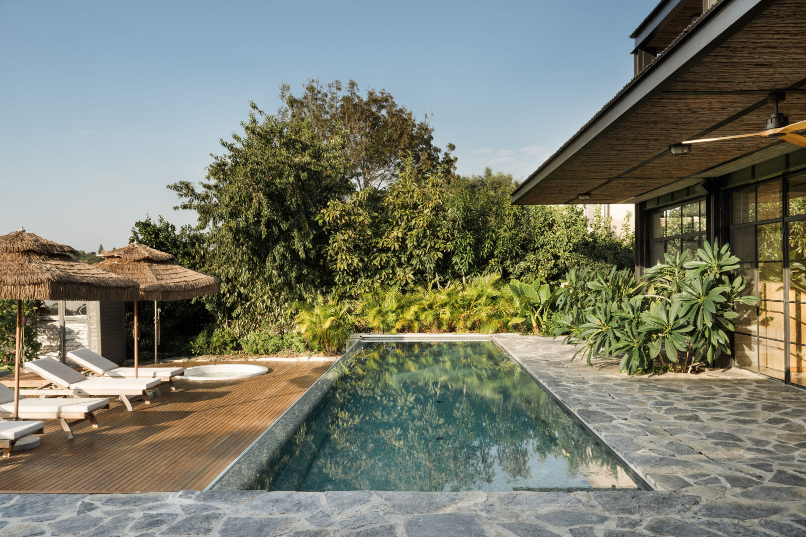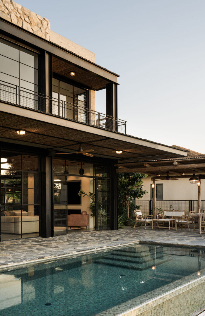 גם החוץ ממשיך את אותה שפה חומרית. אבני מדרך מצפחה, שכבתיות ולא מסותתות, נראות כאילו הן ממשיכות אל תוך הבריכה ויוצאות מסלע. צבע החיפוי – טורקיז ירקרק – נבחר בקפידה כדי להתחבר לפרדס הרימונים שמסביב. בריכת האינפיניטי יוצרת אשליה של מים הנשפכים אל הנוף.