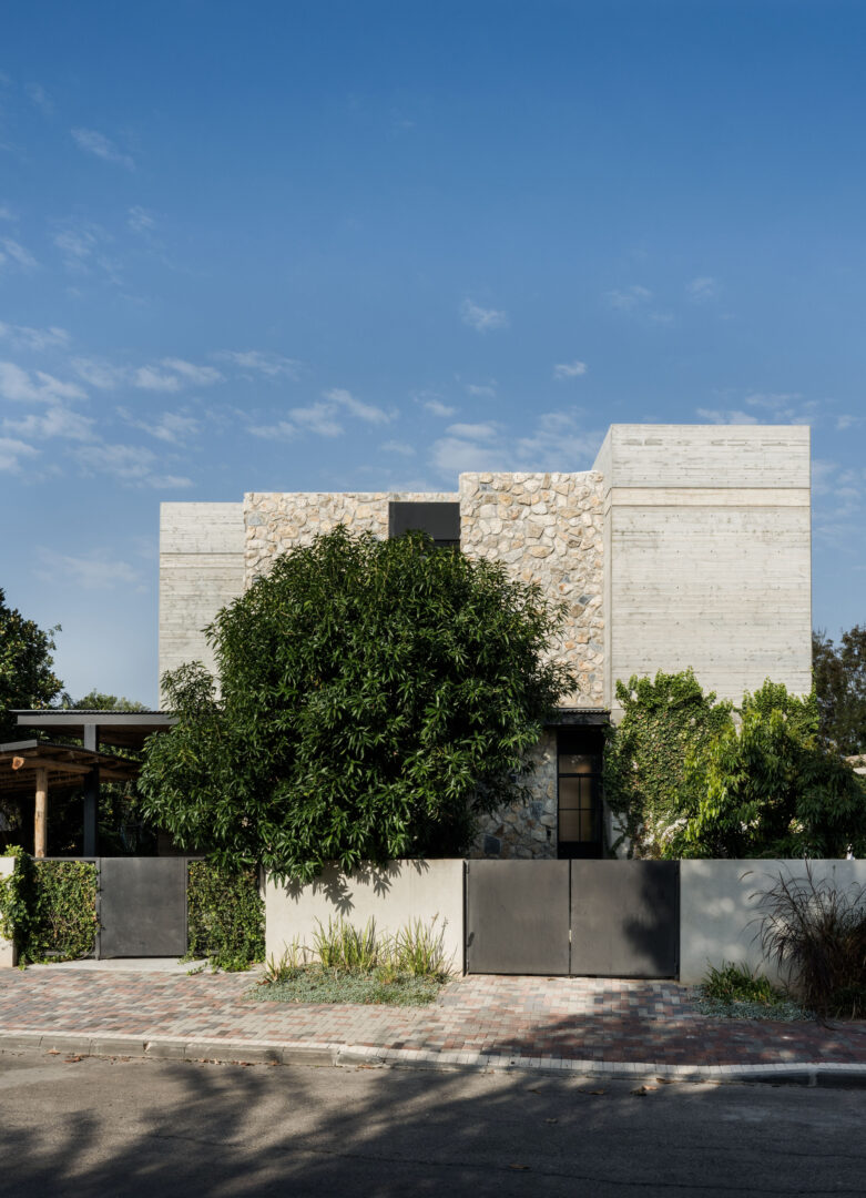 הבית, בשטח של כ־400 מ"ר, ממוקם במושב במרכז הארץ על מגרש של כ־700 מ"ר, ומבטא שפה אדריכלית גיאומטרית נקייה ופשוטה: מרובעים, מלבנים, קווים ברורים. את הקרירות האפשרית של הגיאומטריה מאזנים חומרים חמים ומלאי אופי – אבן, עץ, בטון, ברזל וזכוכית – שיוצרים יחד הרמוניה שקטה ומדויקת.