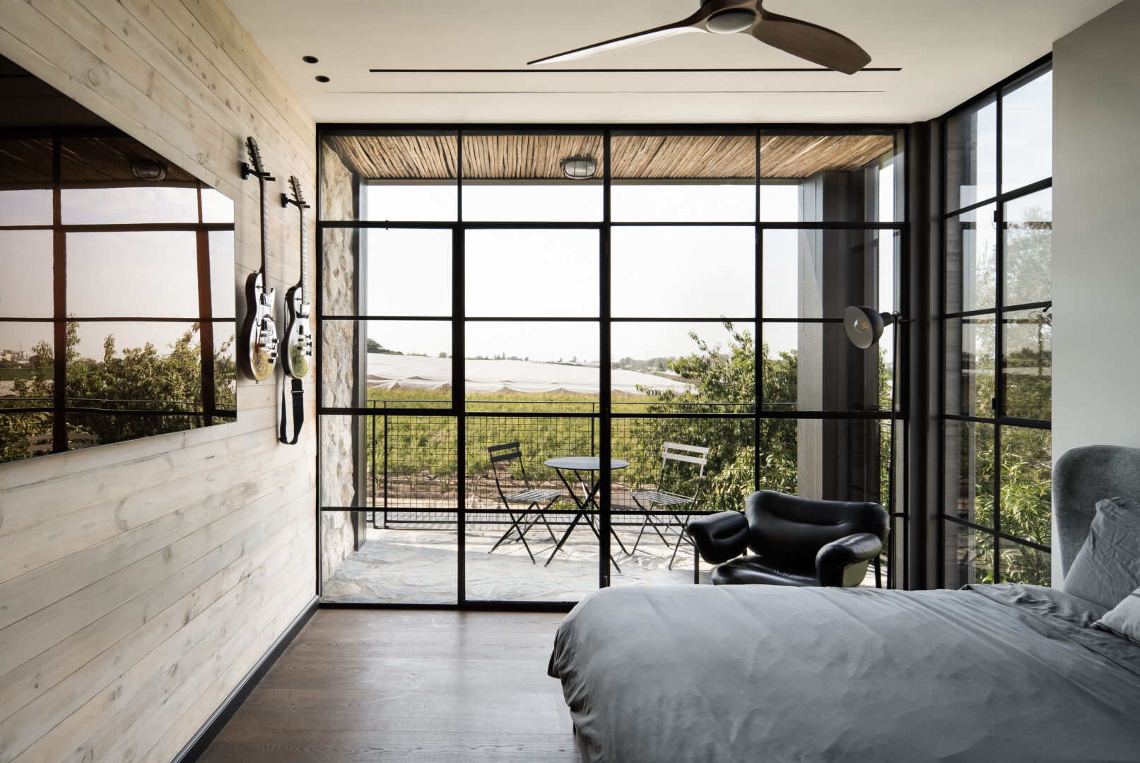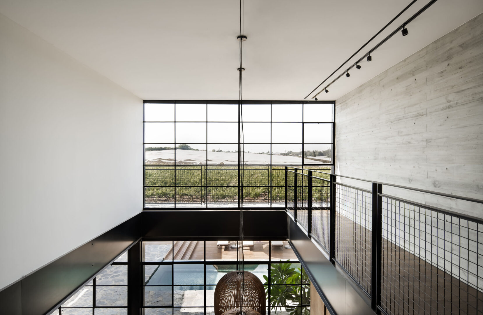 המדרגות, עשויות ברזל שחור בעובי משמעותי, מאפשרות לאור לחדור פנימה. בקומה העליונה נפתח מבט אל החלל שמתחת ואל הנוף שממול – פרדס רימונים ובריכה שמשקפים את הטבע. שתי סוויטות ילדים עם יציאה למרפסות אישיות קטנות, לצד חדר משפחה, משלימות קומה שמחוברת החוצה לא פחות מאשר פנימה.