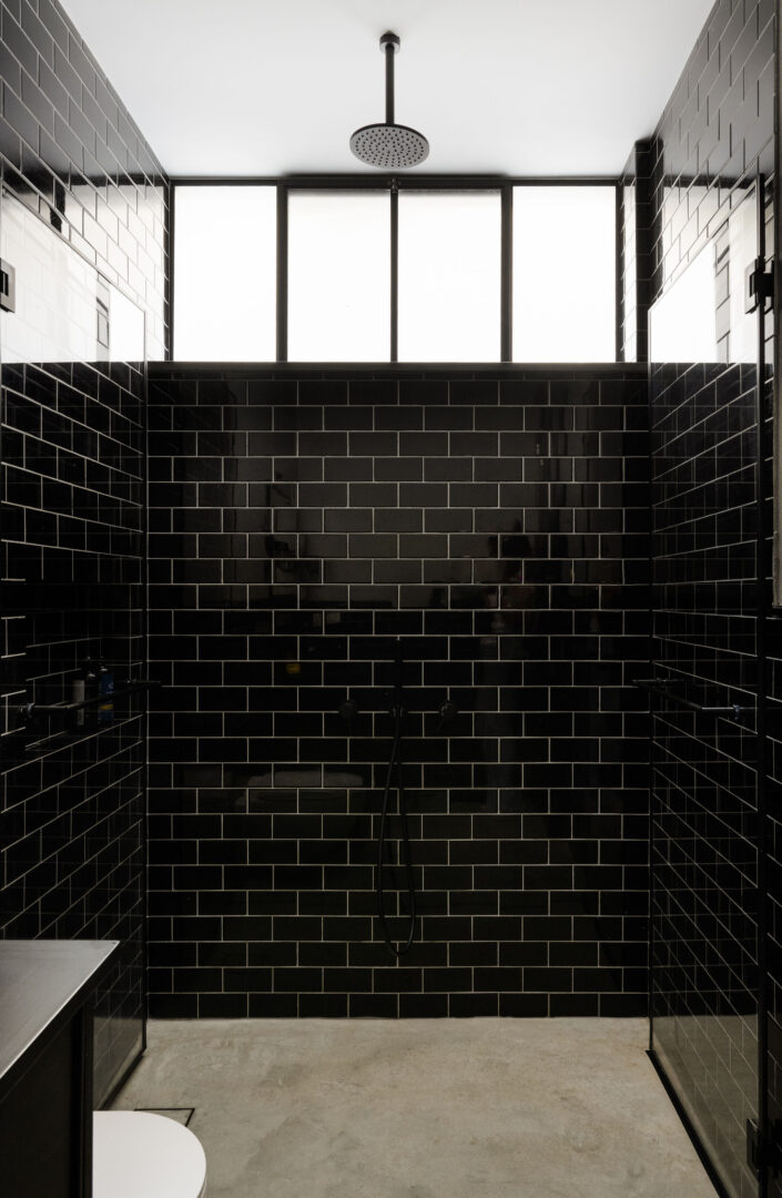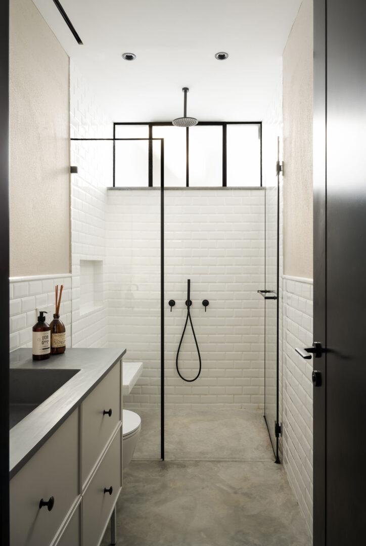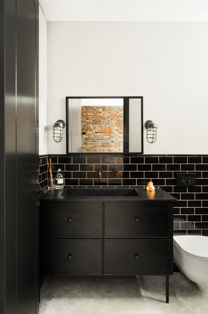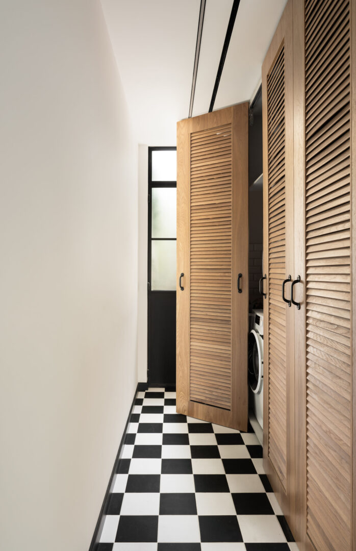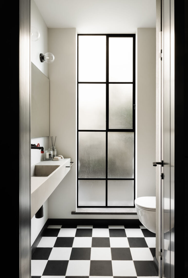 המעבר בין האזורים הציבוריים לפרטיים בקומת הקרקע מודגש באמצעות חומר. חדר הכביסה ושירותי האורחים חופו באריחי דמקה שחור־לבן, שמכניסים עניין ומובילים לשפה לופטית־תעשייתית ברורה: בטון חשוף, ברזים עם נגיעות אדומות, ברזל גולמי ושחור דרמטי.