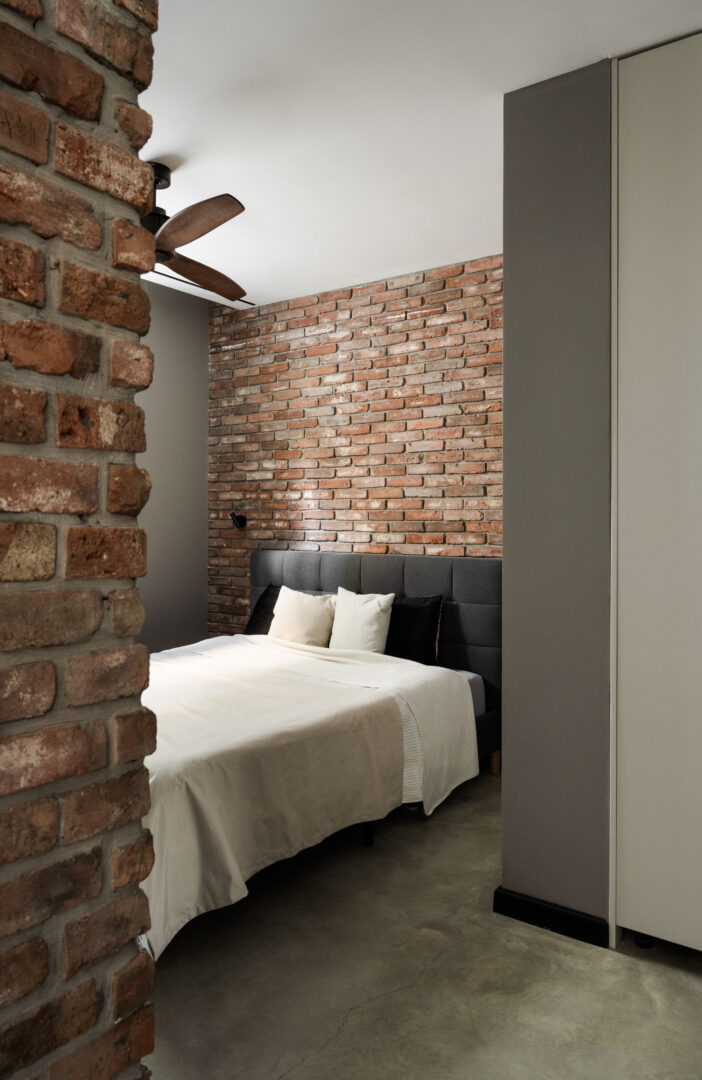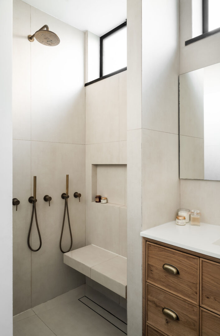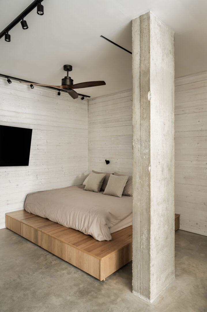 קומת המרתף תוכננה כשתי סוויטות גדולות, כל אחת מותאמת לאופיו של הילד שגר בה, וכולן נהנות מיציאה לחצר אנגלית. עבור הבן, חייל, נוצר חלל בסגנון לופט אורבני: בריקים שחורים, אווירה ניו־יורקית, חדר רחצה תעשייתי ובר קטן שמכניס תחושת חו"ל הביתה. עבור הבת נבחרה גישה אחרת לחלוטין – חמה, טבעית ובעלת סיפור. עצי התפסנות מהבנייה נאספו בקפידה, נשמרו ועברו עיבוד מחדש לחיפוי קירות, כזה שמכניס עומק, טקסטורה וזיכרון של תהליך הבנייה עצמו.