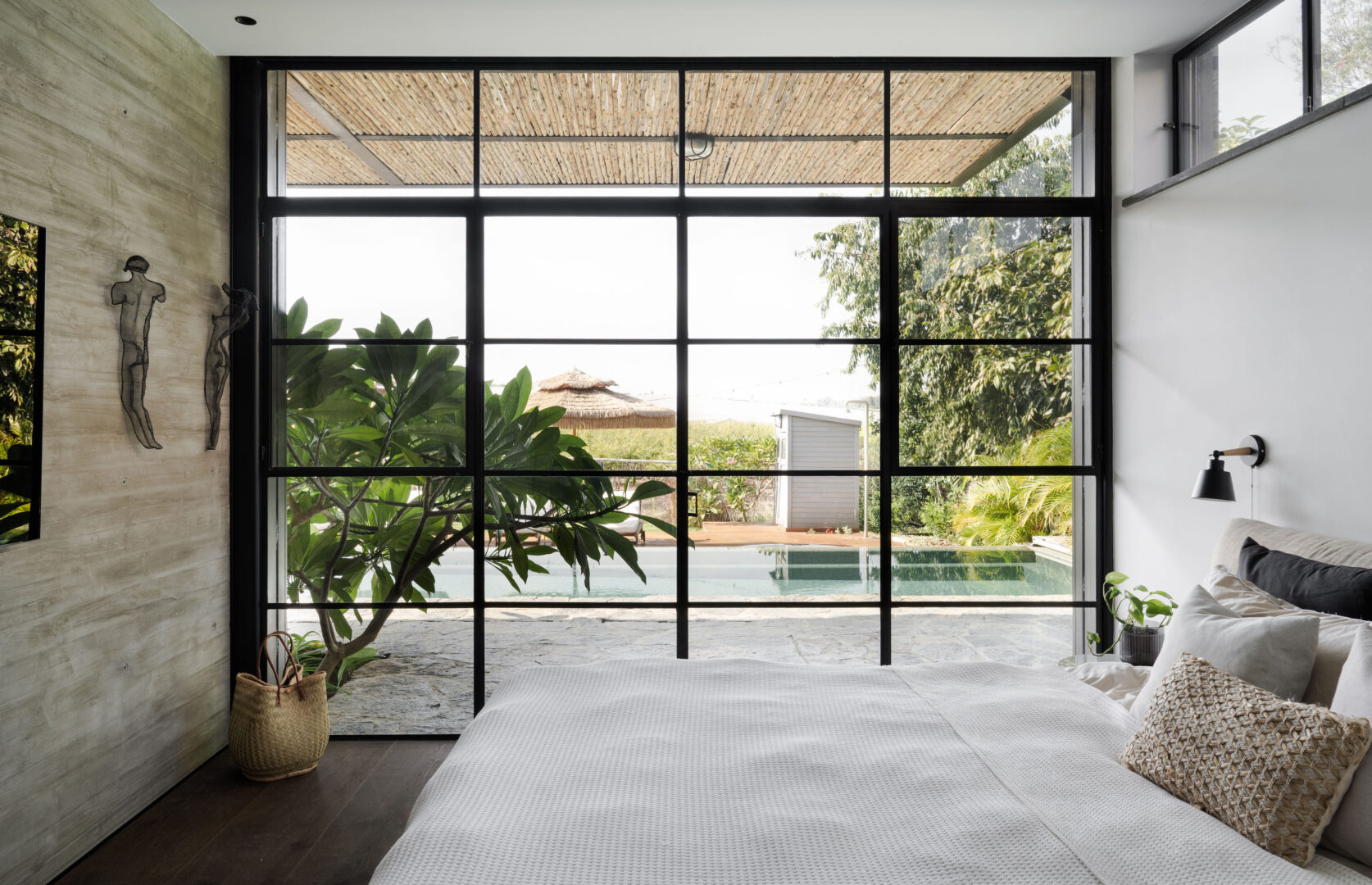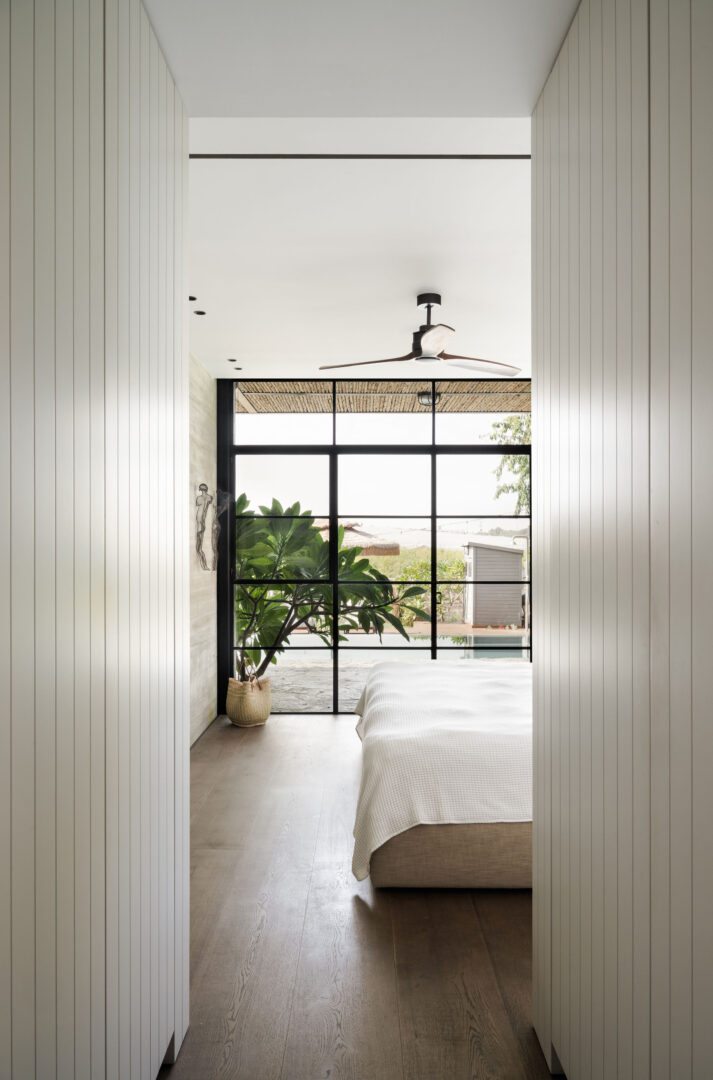 סוויטת ההורים מוקמה בקשר ישיר לנוף ולבריכה, ונהנית מיציאה ישירה החוצה. זוהי סוויטה רחבת ידיים, כמעט מלונאית, עם מבואת כניסה המורכבת מארונות משני הצדדים. הקיר החשוף בחדר השינה הוא גבו של קיר המטבח – חיבור חומרי שמדגיש את הרצף והחשיבה הכוללת.