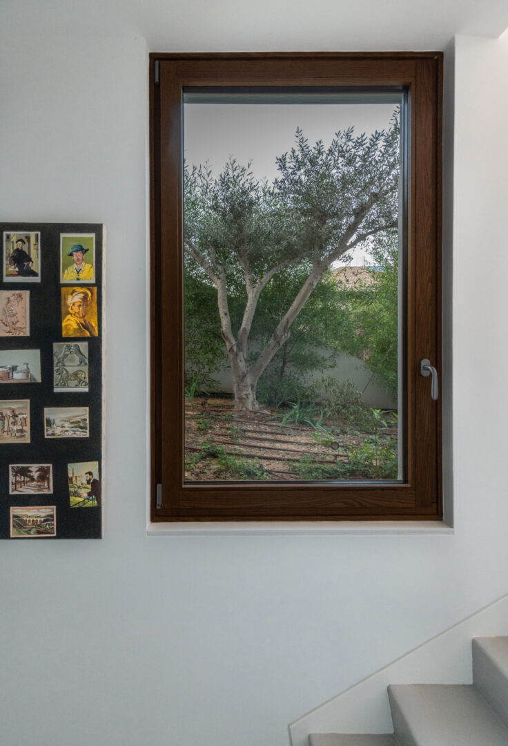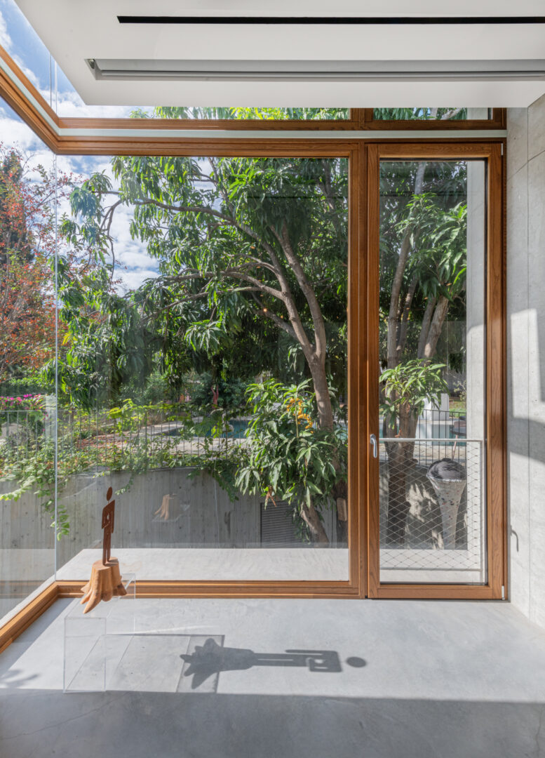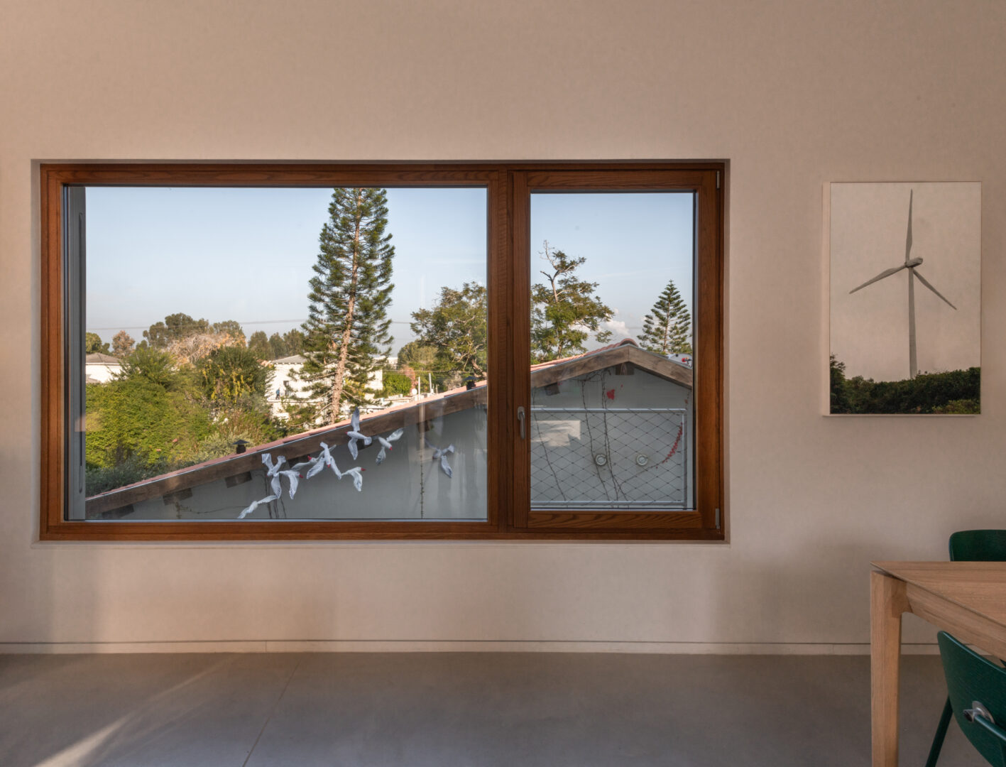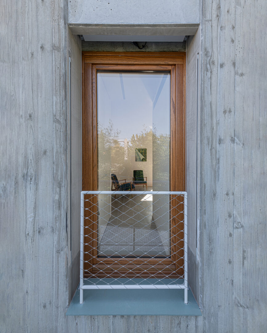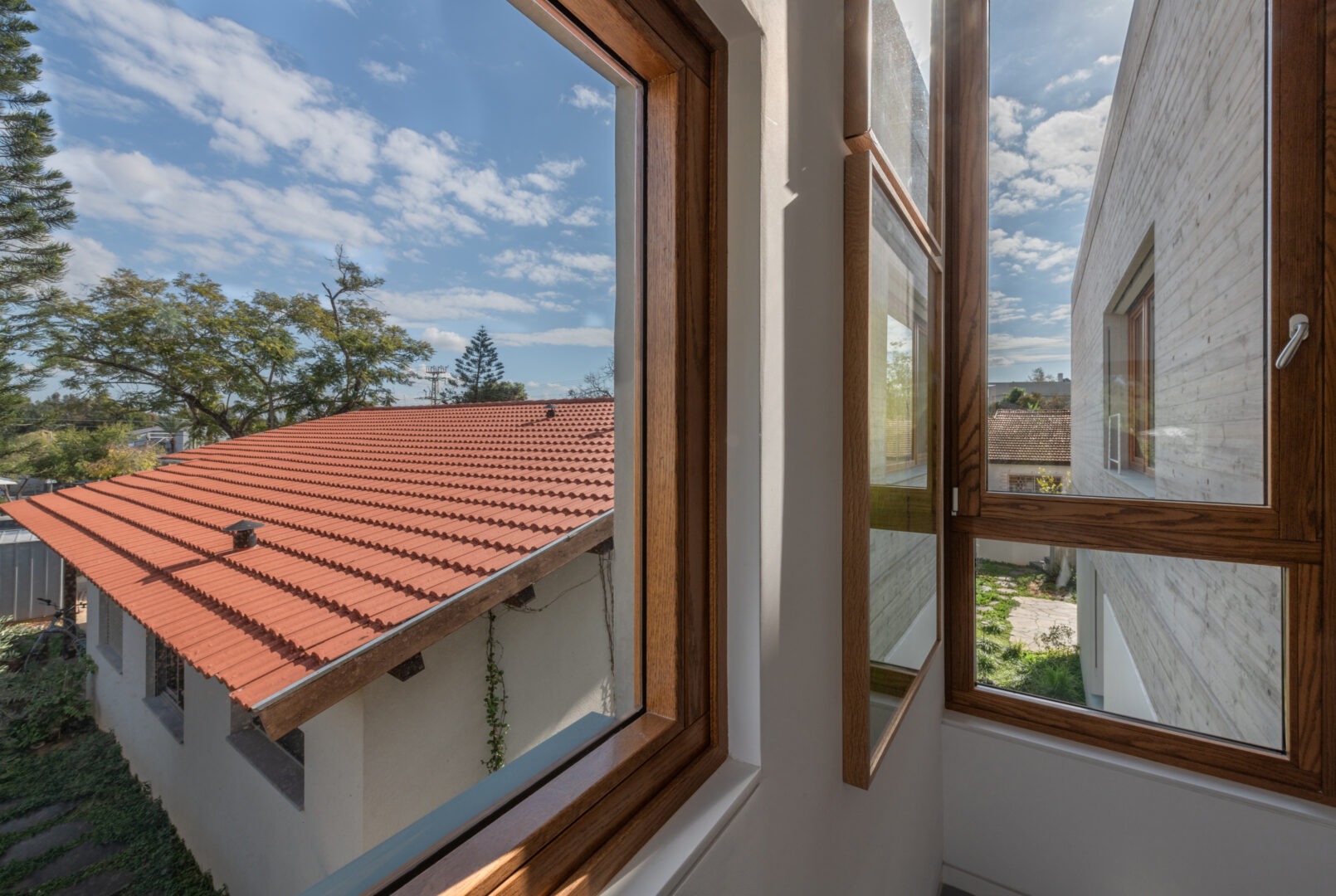 כדי לאזן את הנוקשות החומרית של הבטון, הלף במיומנות רבה שילבה בבית חלונות ודלתות עץ מלא, חלונות יוקרה. חלונות מביאים איתם בנוכחות חומרית עשירה שמרככת את המינימליזם המחוספס של הבטון ומוסיפה לבית תחושת עומק וחום.