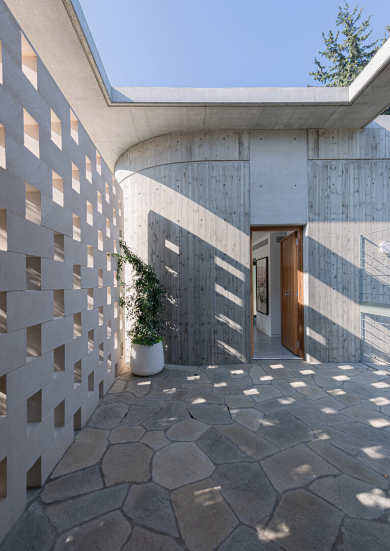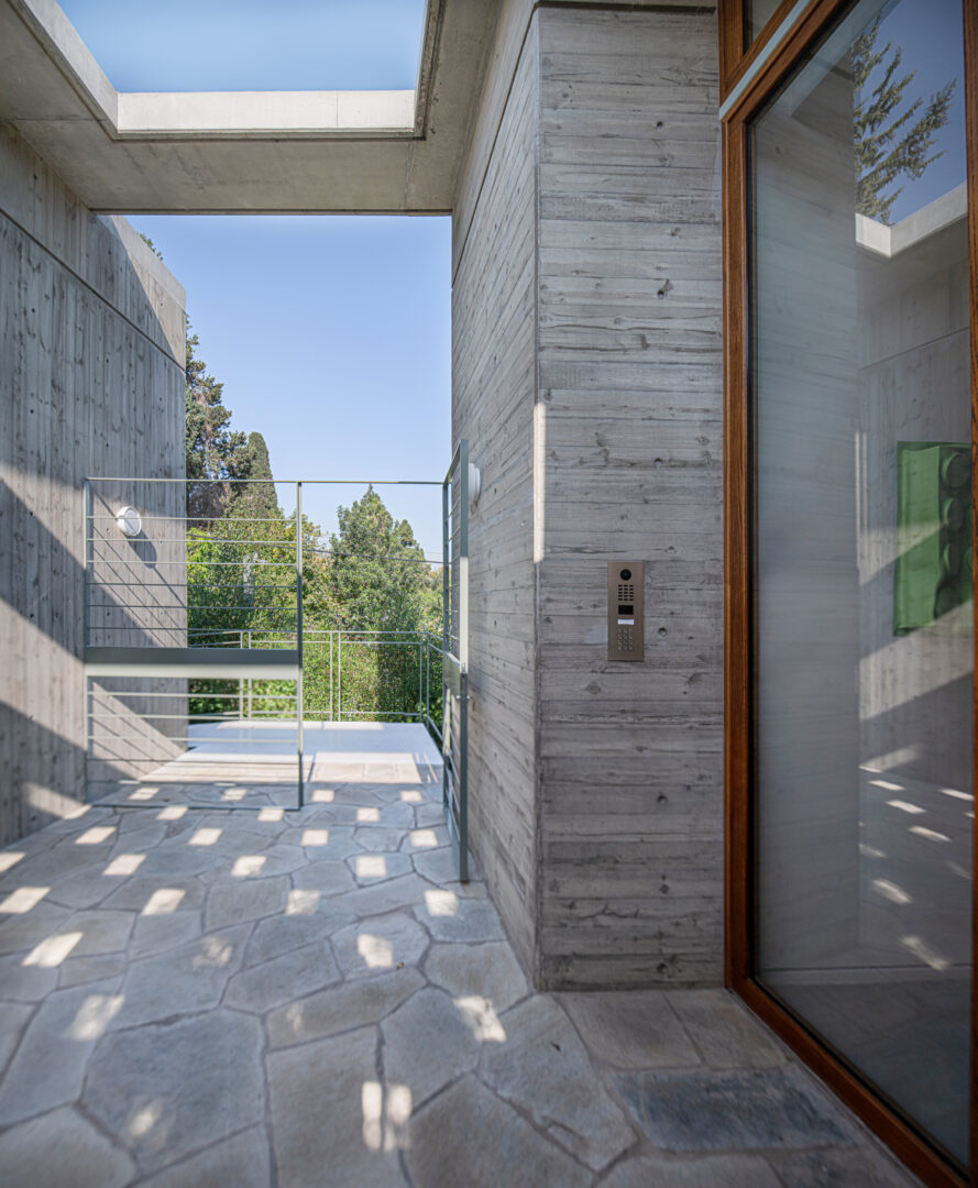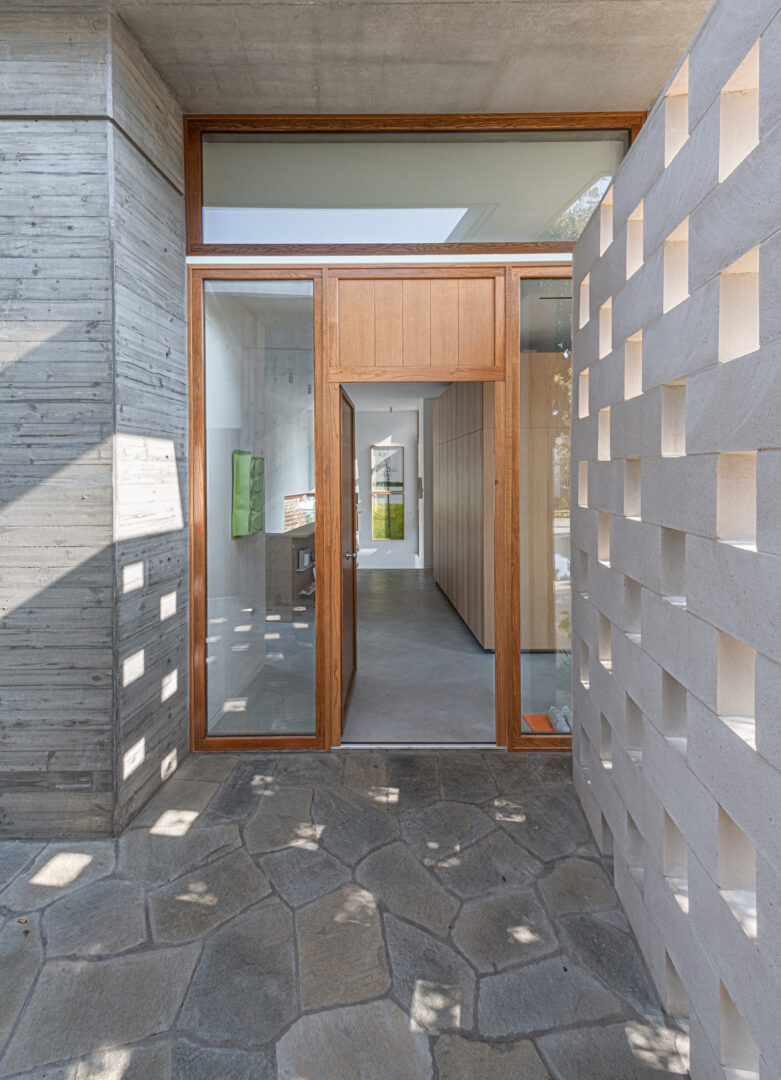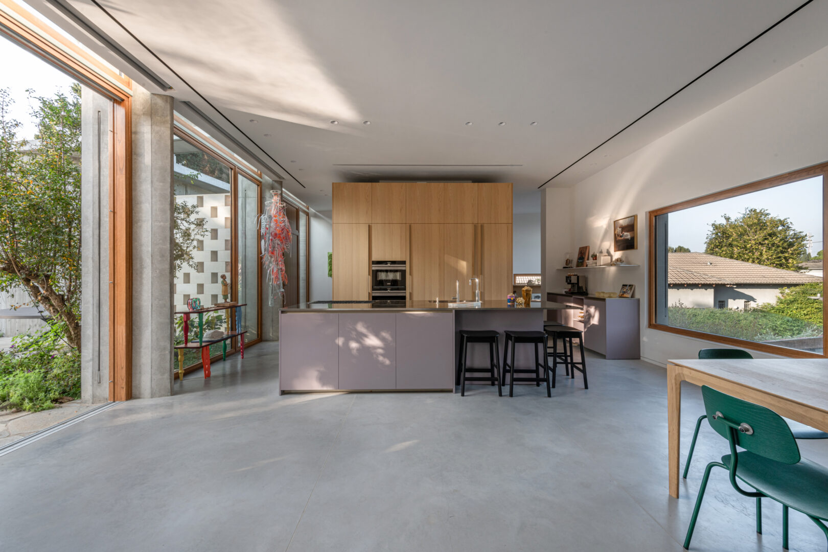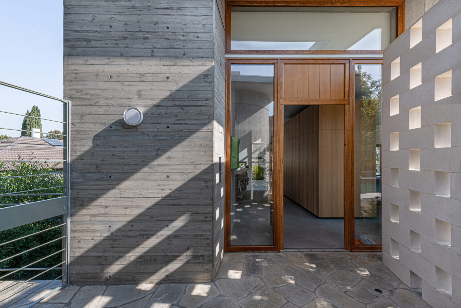 כדי לאזן את הנוקשות החומרית של הבטון, הלף במיומנות רבה שילבה בבית חלונות ודלתות עץ מלא, חלונות יוקרה. חלונות מביאים איתם בנוכחות חומרית עשירה שמרככת את המינימליזם המחוספס של הבטון ומוסיפה לבית תחושת עומק וחום.