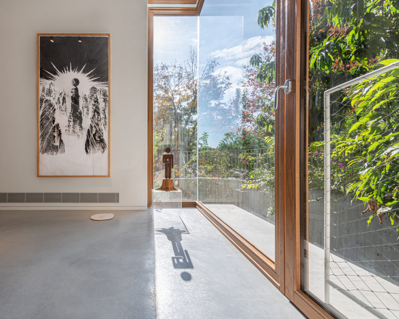 גם החוץ משתלב כחלק מהתצוגה, כשהחצר הפכה למרחב שביכולתו לארח עבודות חוץ ופסלים. דרך החלונות, החוץ נצפה כחלל נוסף של הגלריה, בזמן שהעץ הטבעי של המסגרות מייצר תחושת המשכיות בין הסביבה לבין חללי הפנים.