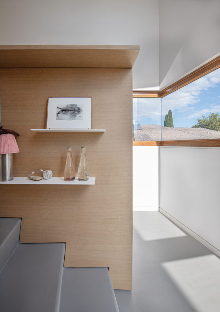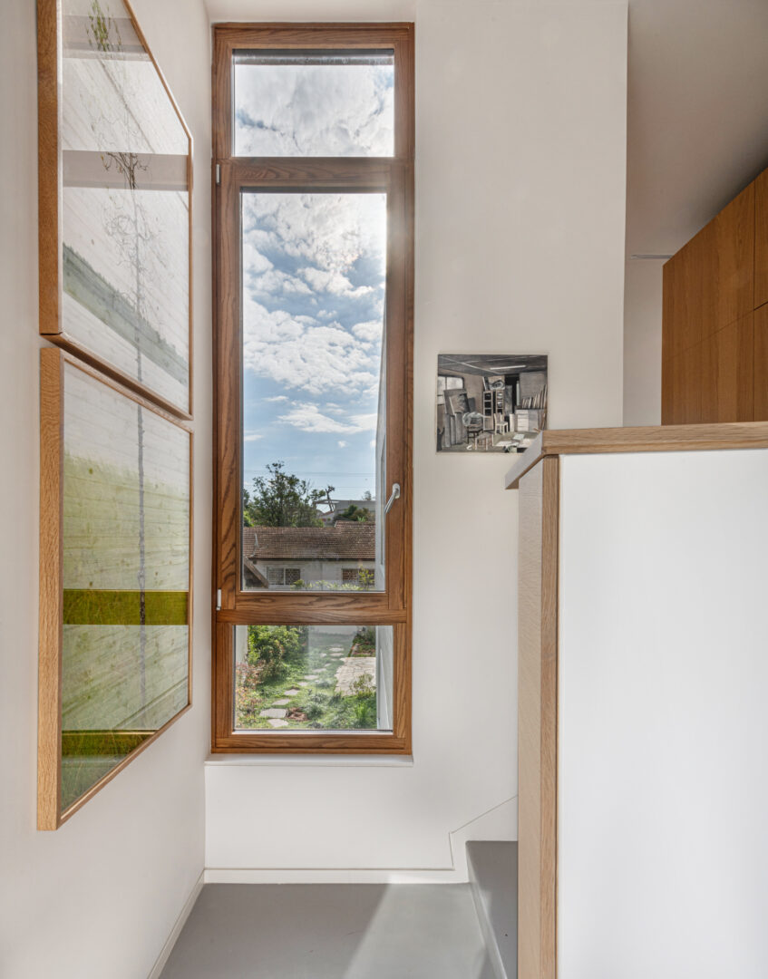 השימוש בעץ מלא בתוך מעטפת מודרנית יוצר דיאלוג בין החוץ לפנים. החלונות פותחים את החללים לאור טבעי וממסגרים את נופי החוץ כמו תמונות מתחלפות. העץ מעניק לחלל תחושה אורגנית ורכה, המשככת את הקו האדריכלי הקשיח ויוצרת בית שהוא גם מודרני וגם אנושי.