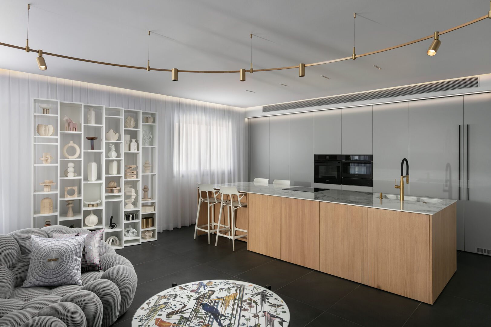 אי רחב ידיים במקביל לשטחי האחסון במטבח, בגימור פורניר אלון אירופי לבן שטרייף מצדו האחד, ומצדו השני, שסמוך לארונות, בגוון אפור בהיר מעניק תחושת חמימות לחלל הבהיר. משטח העבודה, בדמות גרניט פורצלן לבן עם נימים עדינים, מוסיף לתחושת היוקרה והאלגנטיות בחלל.