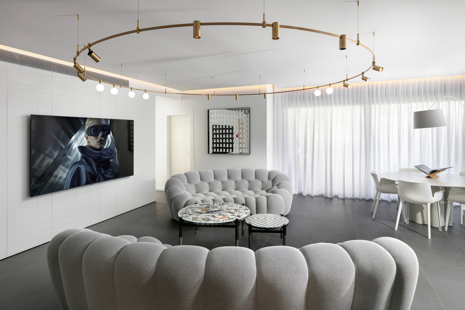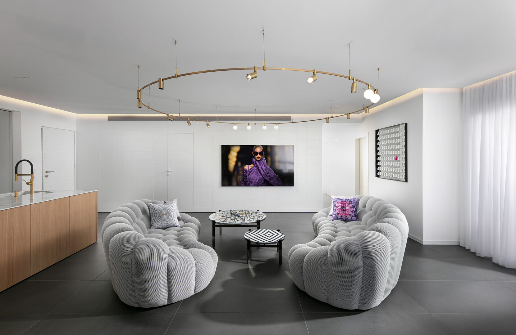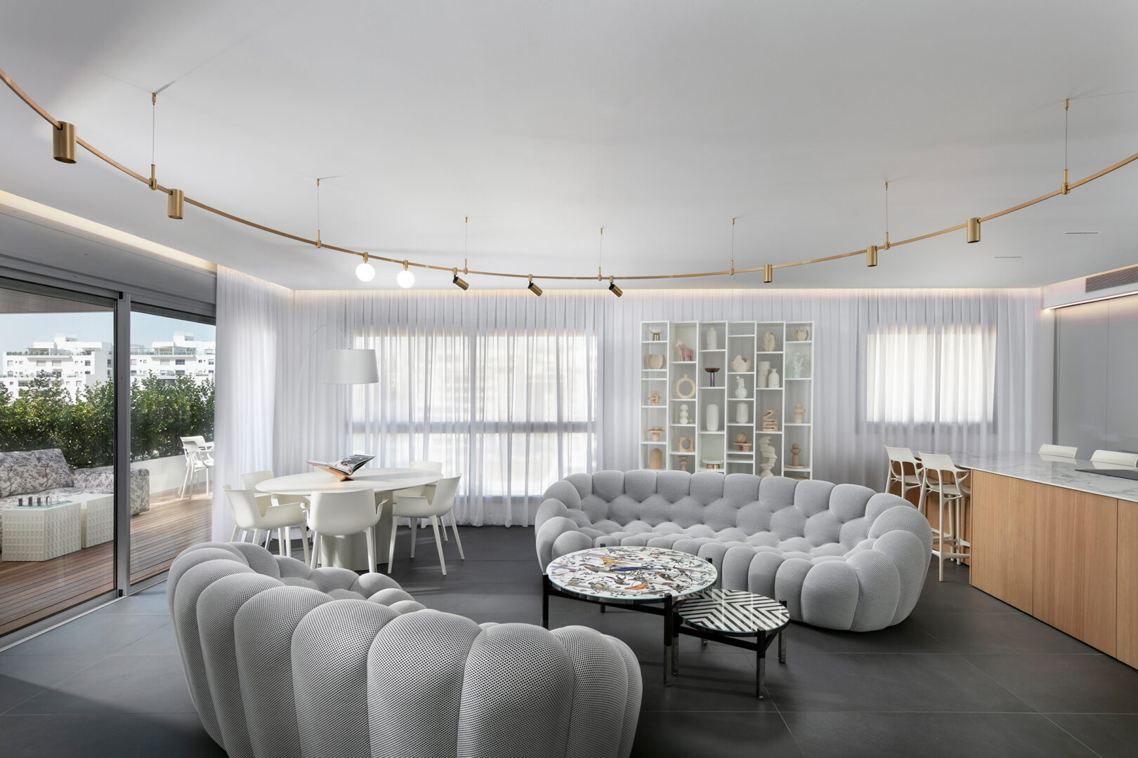 בבניין חדש בלב חולון, תכנן ועיצב מעצב הפנים אורון מילשטיין מיני-פנטהאוז קסום, שאין בו כמעט דבר סטנדרטי. זהו מרחב שחי ונושם עם דייריו – זוג הורים, הוא עובד בשוק ההון והיא בתחום ההייטק, ושלושת ילדיהם – ומתאים את עצמו בכל רגע לצורך, לרצון או למצב הרוח. הסלון, בעל קווים מעוגלים, עוצב כחלל מזמין אך אינטימי באופיו, והמרפסת הפכה לגינה קסומה שבה אפשר לארח, לנוח או לעבוד מול השמש.