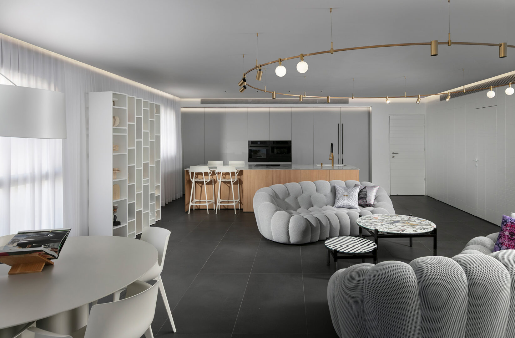 מילשטיין, שליווה את המשפחה, שהתגוררה בשכונה הסמוכה, עוד משלב רכישת הדירה, הפך אותה למרחב חכם, מודולרי, מעוגל, ומלא באפשרויות תזוזה והתאמה לפי הצורך והרצון. התכנון המוקפד החל כבר לפני קבלת המפתח, וסייע לשנות את פני הבית לחלוטין, בפרק זמן קצר. המטרה הייתה ברורה: לשמור על חמישה חדרים מרווחים, תוך יצירת חלל ציבורי מרווח, מואר ומזמין, כזה שיש בו תנועה, זרימה והמון הפתעות עיצוביות. התוצאה – בית מודולרי, גמיש, ומתאים לתרחישי אירוח ובילוי מגוונים.